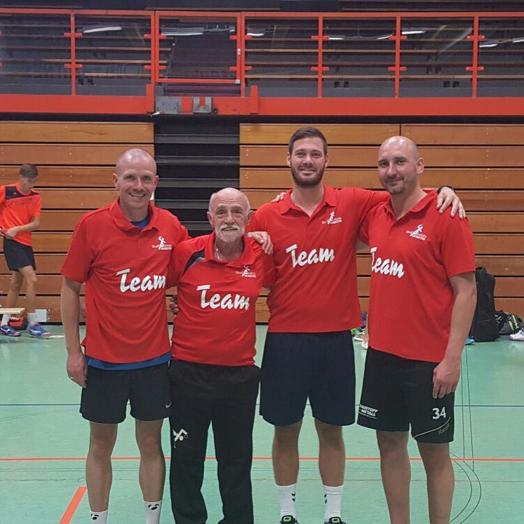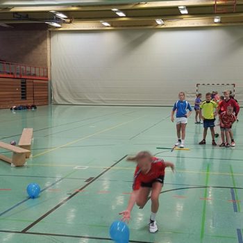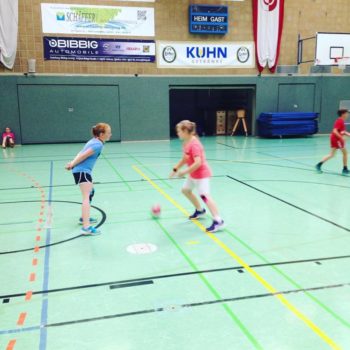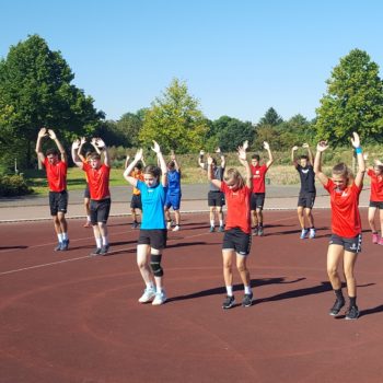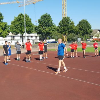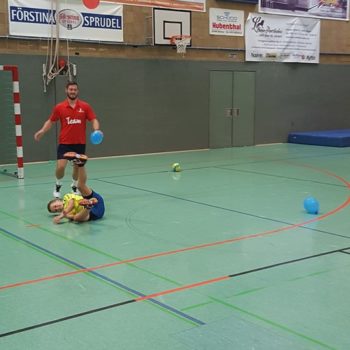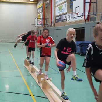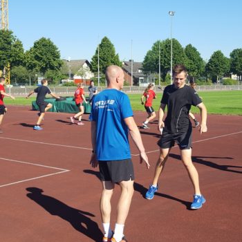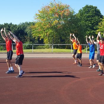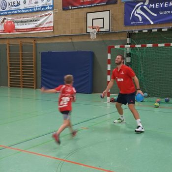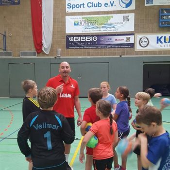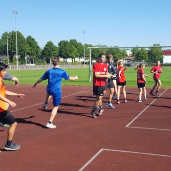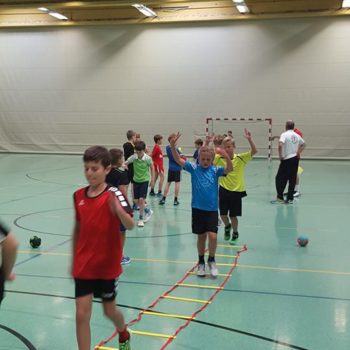 Donnerstag, 25.08.2016. Auch für den 4. Tag habe ich eine gute Idee. Mal raus aus der Halle, rein ins Stadion an die frische Luft. Noch sind die Temperaturen erträglich. Trotzdem hole ich mir mit Tobias Henne einen echten Athletik-Profi zur Hilfe. Was er mit dem Handball-Nachwuchs anstellt, ist einfach toll. Mit den Kleinesten wird ein spielerisches Ausdauertraining absolviert mit Lauftechnik-Schulung, Lauf-ABC und Übungen zur Koordination und Stabilisation. Bei den Großen gibt es einen Lauf-Sprung-Zirkel, es folgen Steigerungsläufe kombiniert mit Tempoläufen. Die mittlere Altersgruppe verbindet Lauftechnik mit Koordinationsschulung, Kraft und Beweglichkeit. Auch „Oschi“ ist wieder mit von der Partie, hat zur Freude der Kids Luftballon mitgebracht und trainiert in der Halle antizipatives Abwehrverhalten, handballspezifische Koordinations-, Stabilisations- und Kräftigungsübungen und anschließend mit den „Kleinen“ Lauftechnik mit schnellen Richtungswechseln. Es wird am Vormittag echt viel gelaufen – dachte ich so – allerdings bin ich mir nicht mehr so sicher, als in der Mittagspause noch immer Bewegung in der Halle ist, getobt wird und auch die Bälle fliegen. Werden die Kids denn niemals müde? Es ist erstaunlich, was die Kinder und Jugendlichen so leisten – großes Kompliment. Schließlich sind die Temperaturen drinnen wie draußen schon kaum erträglich, dennoch sind alle voll dabei und keiner schwächelt oder will vielleicht lieber ins Schwimmbad, zumindest sagt das keiner laut. Wahrscheinlich liegt das auch an Dinos Trainingseinheiten, die auf der einen Seite lehrreich sind, aber auf der anderen Seite der Spaß nicht zu kurz kommt. Dino – selbst noch Kind! – weiß, was Kinderherzen höher schlagen lässt. Mit dem Wechsel in eine andere Sportart (Hockey) und dem Schießen von Selfies erobert er die Herzen im Sturm. Als bei der Verabschiedung noch gelacht, gescherzt und gepfiffen wird, weiß ich, dass mein Team und ich bisher alles richtig gemacht haben. Wir freuen uns auf den Abschlusstag.