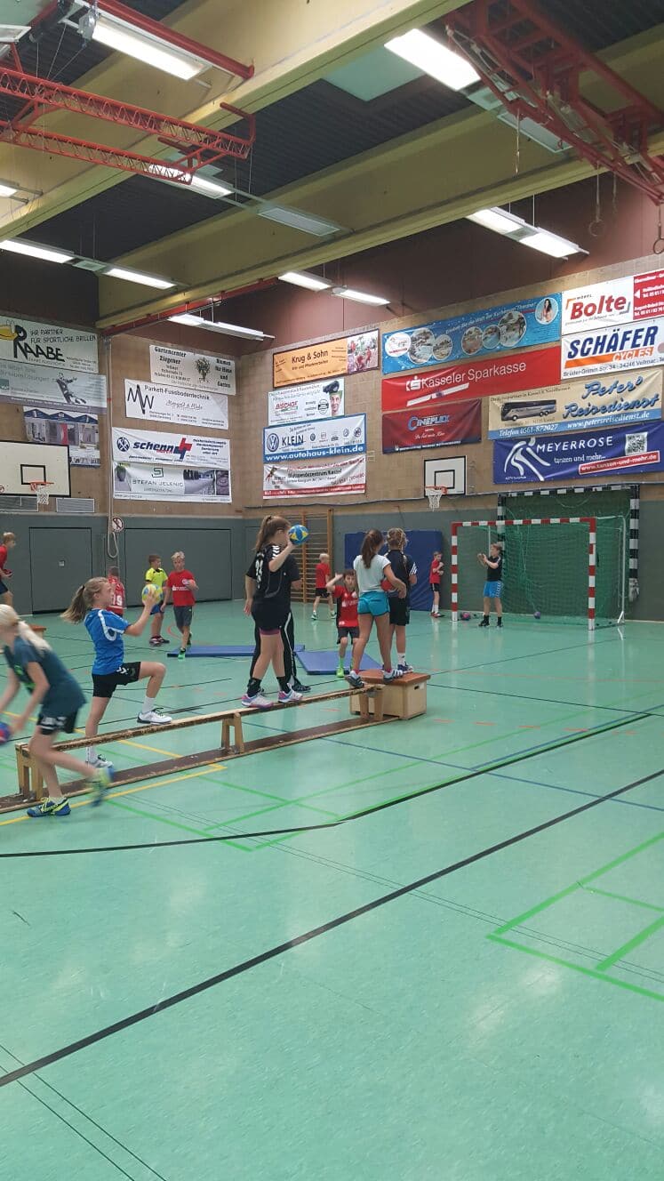 Freitag, 26.08.2016. Der letzte Tag. Mit einem lachenden und einem weinenden Auge fiebere ich dem letzten Tag entgegen. Auf der einen Seite bin ich erleichtert, dass die anstrengende Woche jetzt fast zu Ende ist; ich bin körperlich ziemlich k.o. und der mangelnde Schlaf macht sich schon teilweise bemerkbar, ABER: auf der anderen Seite hat diese Woche so viel Spaß gemacht, es wurden so viele neue Freundschaften geknüpft, alle Teilnehmer sind gesund und unversehrt geblieben – alles in allem ein sehr erfolgreiches Handballcamp neigt sich dem Ende. Am Vormittag mache ich mit den Kindern viel Koordination, alle sind sehr konzentriert bei der Sache, insbesondere an der Koordinationsleiter und um die „Pommes-Stäbe“ herum. Mit den „Großen“ trainieren wir Übergänge aus dem Rückraum unter Einbeziehung der Außenspieler mit Torabschluss. Dieser Vormittag geht wiederum vorbei wie im Fluge und auch an diesem letzten Tag ist das Gedränge an der Essenstheke sehr groß. Nach der Pause werden die Geschenke ausgegeben: jeder Teilnehmer und jede Teilnehmerin erhält eine Medaille und ein Erinnerungs-Tshirt, was alle schnell überstreifen, um das obligatorische Abschlussfoto zu schießen. Im Anschluss an das Fotoshooting steht traditionsgemäß das große Abschlussturnier auf dem Plan. Sämtliche Teilnehmer/innen werden auf 6 Teams aufgeteilt. Dieses Mal dürfen die „Jüngsten“ die Teams wählen – was für eine große Ehre. Sie sind ganz aufgeregt. Die Teams werden sehr homogen gewählt und als erstes muss sich jedes Team einen eigenen Namen ausdenken, was sich recht lustig gestaltet. Hier die fantasievollen Namen der 6 Teams: Käsekuchen, Pizzaschnitten, DAP, Schlümpfe, Chilischoten und 187Feldwegbande.