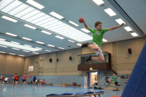Um 8:45 Uhr stehen die jungen Handballspieler schon wieder auf der Platte und warten auf den Pfiff, dann kann es losgehen. Mein Trainerkollege Matthias Kremer übernimmt Gruppe2, um mit ihnen ein Fascien-Training (Black-Roll) zu absolvieren und ich verbessere mit meiner Gruppe das schnelle Umschalten von Abwehr zu Angriff. O, ja heute wird viel gelaufen: wir üben intensiv den erweiterten Gegenstoß mit 1. und 2. Welle mit Hauptaugenmerk auf Passgenauigkeit und erfolgreichem Torabschluss. Hier zeigen sich die technischen Fertigkeiten jedes Einzelnen, da jetzt in vollem Lauf die Pässe ankommen müssen und der Überblick für den besser postierten Mitspieler gefragt ist. Eine anstrengende und anspruchsvolle Übung, aber gottseidank haben wir gleich Mittagspause .