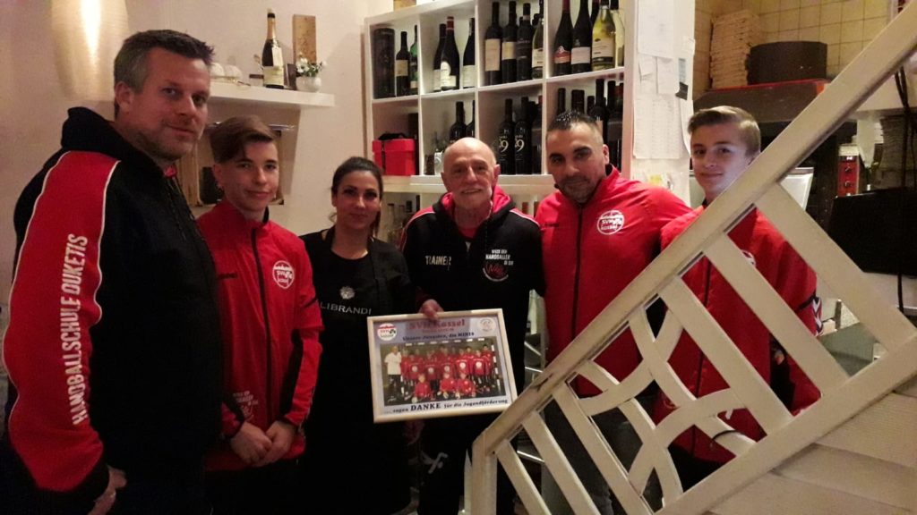 Die Inhaber Familie Bonanno hat nämlich einen maßgeblichen Anteil daran, dass die Jugendteams von SVH Kassel mit Trainingsanzügen ausgestattet werden konnten – in diesem Falle die männliche E-Jugend. Und die ließen es sich nicht nehmen, die Familie in ihrer Pizzeria zu überraschen und ein Präsent als Dankeschön zu überreichen.