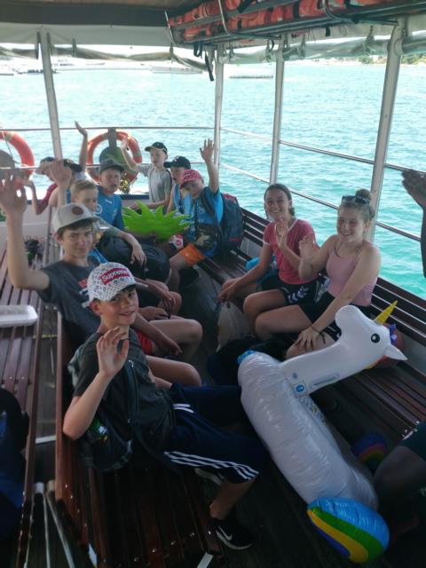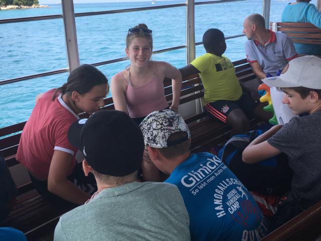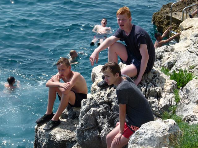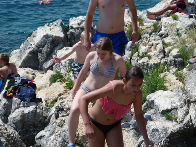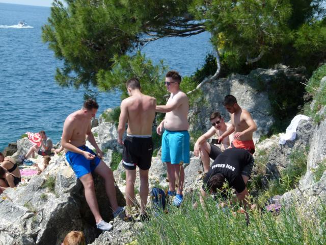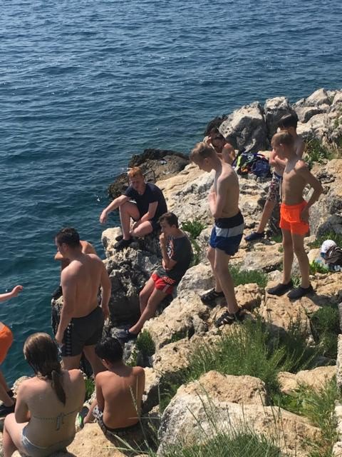 Auf der Insel angekommen, haben wir uns zuerst einen Liegeplatz gesucht. Da es sehr heiß war sind wir erstmal sofort ins Wasser zum Abkühlen gegangen. Nach dem Schwimmen machten wir eine kleine Pause, sodass wir genug Kraft hatten, zu den Klippen zu gehen. Als wir an den Klippen ankamen, trafen wir dort einige ehemalige Spieler der männl. A-Jugend.