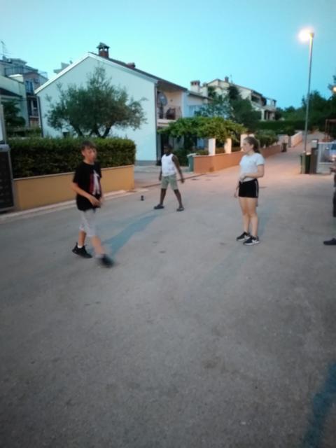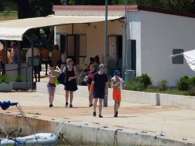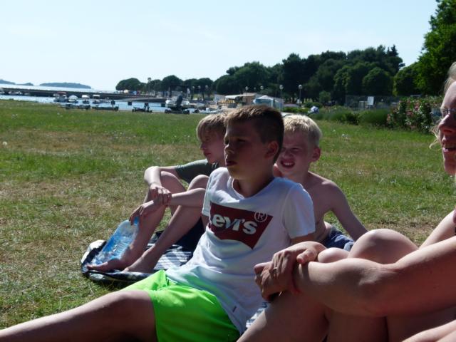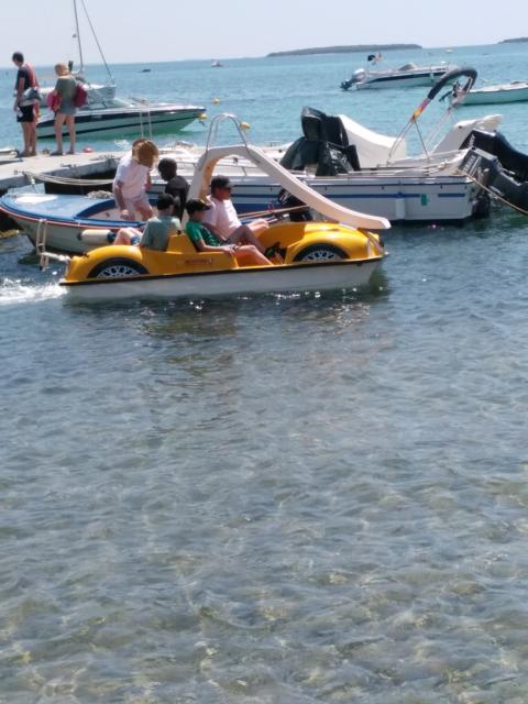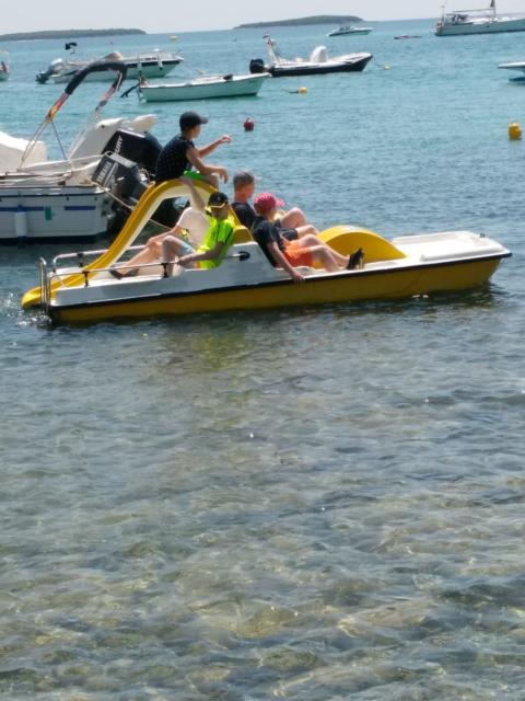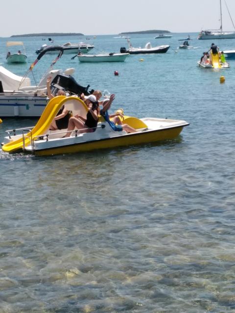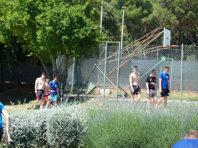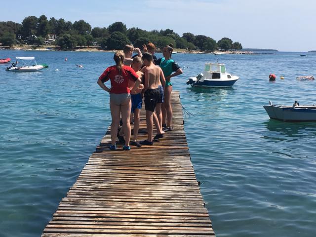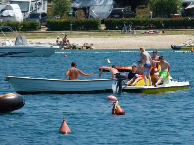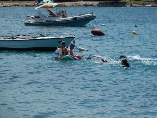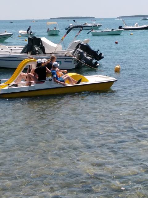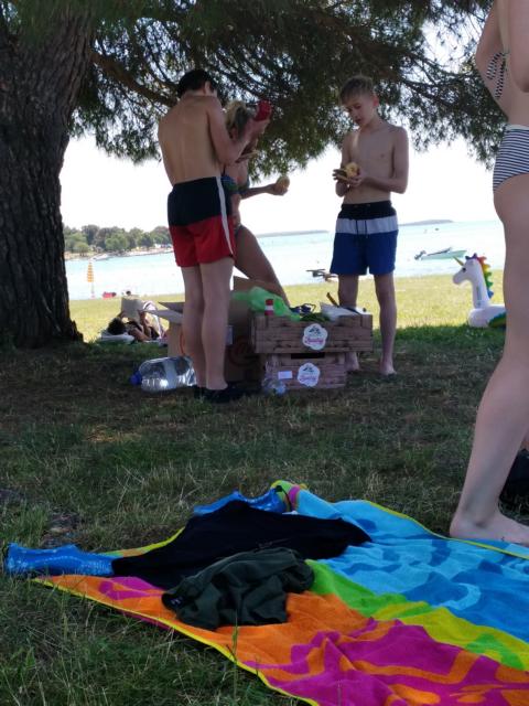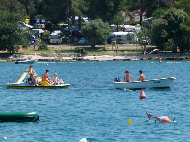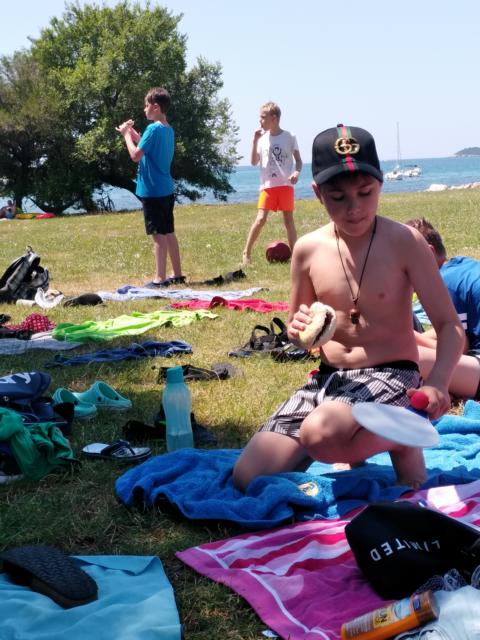 Am Dienstag fuhren wir direkt nach dem Frühstück nach Villas Rubin. Nachdem wir angekommen waren, machten wir uns fürs Schwimmen fertig. Wir kamen 5 Minuten später mit der in Pula gekauften Ananas-Luftmatratze, die wir aus Versehen im Wasser kaputt gemacht haben, zurück an Land, legten sie bei uns an den Platz und gingen wieder zurück ins Wasser. Um die Mittagszeit herum teilten wir uns in 3 Gruppen auf und liehen uns Tretboote, mit denen wir aufs Meer fuhren, aus. Da die Boote anmontierte Rutschen hatten und man super von ihnen aus springen konnte, hatten wir alle sehr viel Spaß. Wir endeckten, dass man sich super an die Tretboote hinten dran hängen konnte. Dabei konnte man super schnorcheln und sich dabei die schöne Unterwasserwelt anschauen. Nach einer halben Stunde kam das erste Boot wieder zurück an Land, weil sie am Anfang nicht gut aufgepasst hatten und daher nicht wussten, dass die Leihfrist eine Stunde betrug. Als die Stunde vergangen war, blieb die eine Gruppe unfreiwillig länger auf dem Wasser, da der Rudermechanismus sich verklemmt hatte und sie sich selbstständig nicht mehr bewegen konnten. Das andere Boot, was noch auf dem Wasser war, musste dem Bootsverleih Bescheid geben, dass die eine Gruppe, die auf dem Wasser festsaß, abgeschleppt werden musste. Die Gruppe, die noch ca. 20 Minuten im Wasser ziellos herumrumgetrieben war, mussten mit eigener Kraft gegen das Boot schwimmen, da sie sonst gegen eine große Yacht getrieben währen. Nachdem sie dann 10 Minuten später mit dem Motorboot abgeschleppt worden waren und sicher an Land gekommen waren, freuten sich alle wieder festen Boden unter den Füßen zu haben. Ein Teil der Mannschaft ging danach nochmal ins Wasser und die anderen spielten Basketball und schauten bei dem Handballcamp zu, was währenddessen stattfand. Müde führen wir nach Hause und ließen den Abend mit Fußball auf der Straße und ein paar Runden Werwolf ausklingen.