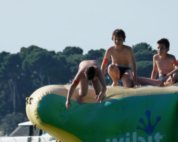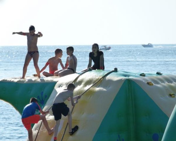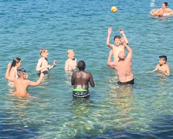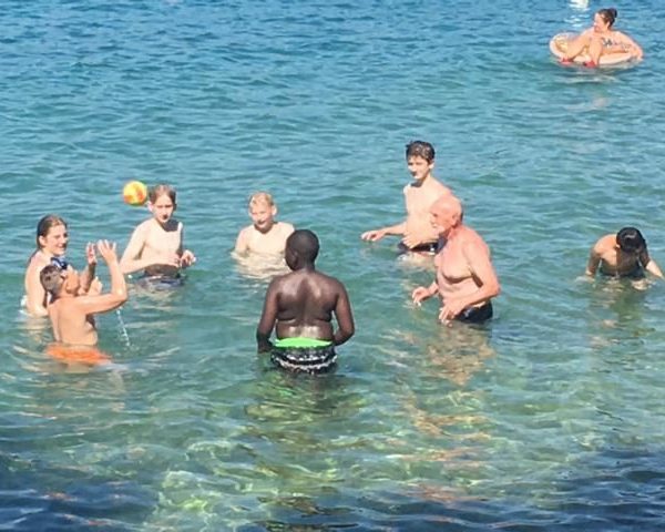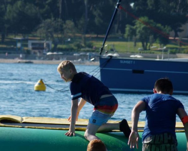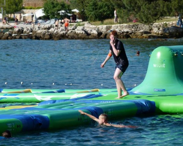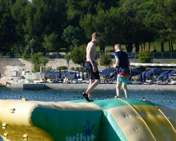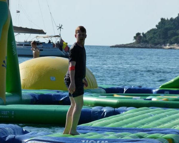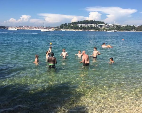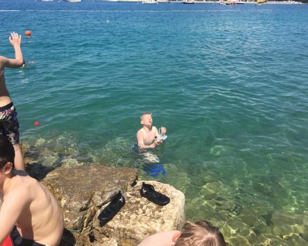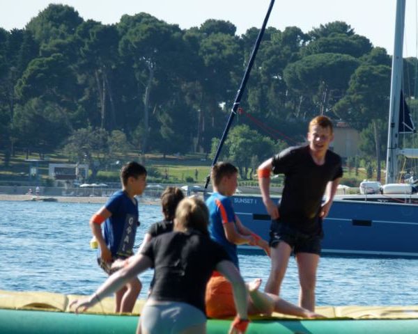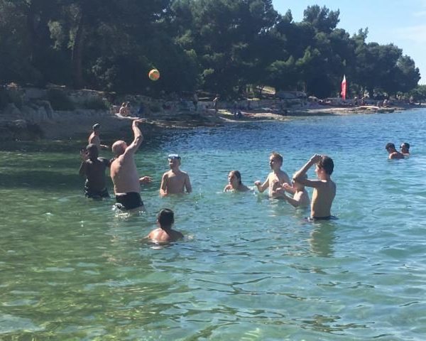 Wir sind mit dem Auto zum Parkplatz Punta Corrente gefahren, allerdings hatten wir noch ein gutes Stück zu Fuß zu laufen (Autofahrverbot) und so sind wir nach einer halben Stunde am Strand angekommen. Wir hatten eine Hüpfburg mitten im Meer gesehen und wollten unbedingt alle da drauf. Trainer und Betreuer ermöglichten uns die Riesengaudi und so verbrachten wir eine Stunde auf dieser Riesen-Wasser-Hüpfburg. Dort hatten wir so viel Spaß beim Klettern, Fangen-spielen und Ins-Wasser-springen, was bei dem einen oder anderen auch kleinere Blessuren hinterlassen hatte. Dann schlug Trainer vor, mehrere Spiele auf der großen Wiese zu spielen und wir bildeten Gruppen. Auf dem Programm stand: Fußball, Wikinger-Schach, Tischtennis-Rundlauf und Boccia. Das hat alles sehr viel Spaß gemacht. Erwähnenswert ist, dass beim Wikinger-Schach das „Damen-Team“ (bestehend aus Liv und Chiara sowie den Betreuerinnen Joni, Kerstin und Sonja) gewonnen hat. Um uns wieder etwas abzukühlen, sind wir zurück zum Kiesstrand gegangen, haben Melone und Eis gegessen und im Wasser Volleyball gespielt. Danach dürften wir alle noch im Meer schnorcheln – unter Wasser gab es jede Menge interessante Muscheln (z.B. große Steckmuscheln, genannt „Store“ – die stecken bis zur Hälfte im Sand) und Fische sowie Seeigel und Seegurken zu beobachten und nach einem ereignisreichen Tag sind wir müde nach Hause gefahren.