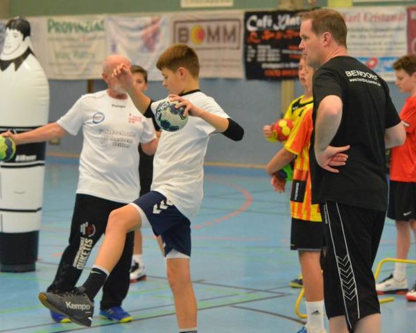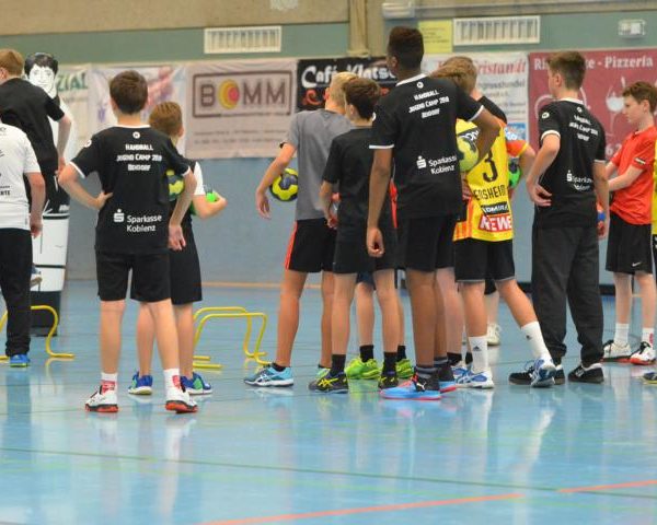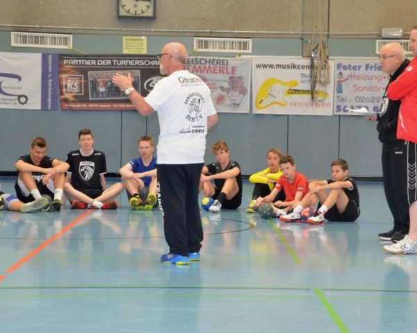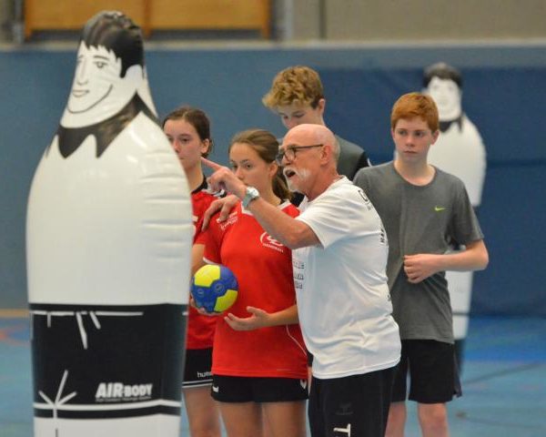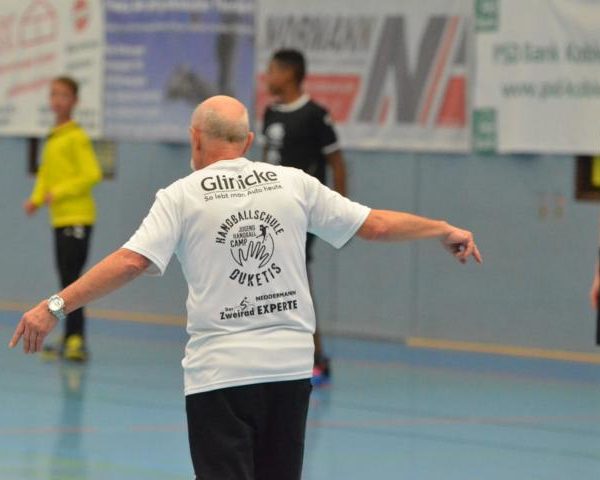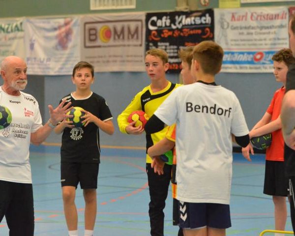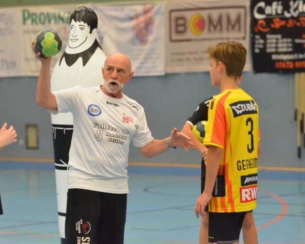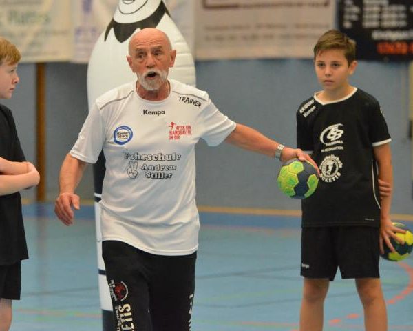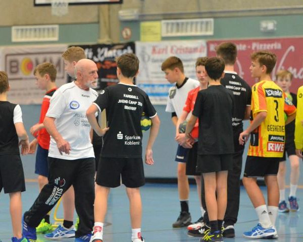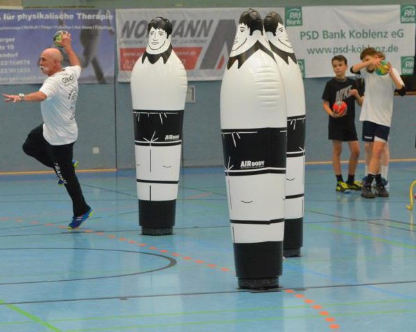 Kaum bin ich in Bendorf angekommen, empfängt mich schon mein guter Freund Paul, das Organisations-Talent. Wir begrüßen uns herzlich und erwarten gemeinsam die Camp-Teilnehmer, die nun nach und nach in der Sporthalle eintrudeln. Es sind Handballer dabei, die bereits seit der D-Jugend kommen und inzwischen A-Jugendliche sind – dementsprechend ist das „Hallo“ groß. Aber es sind auch wieder viele „neue“ Gesichter dabei, die erwartungsvoll schauen und endlich anfangen möchten. Während der Begrüßung und Einführungsrede kommt auch prompt die Frage, die ich schon insgeheim erwartet hatte: „Aber dieses Mal machen wir doch zum Abschied wieder das Hochsprung-Wettspringen, oder?“ Dazu muss ich erläutern, dass wir dieses „Wettspringen“ im vorletzten Jahr eingeführt haben, im letzten Jahr jedoch lief mir in der letzten Trainingseinheit die Zeit davon (wo war die bloß geblieben???) und wir konnten diesen Wettkampf nicht mehr durchführen. Ich hatte ein Jahr lang (also fast) ein schlechtes Gewissen und wurde gleich in den ersten Minuten damit konfrontiert…. geschieht mir ganz recht. Aber nachdem ich mein Versprechen gegeben habe, dass wir dieses Mal ganz bestimmt wieder den Hochsprung-Wettkampf durchführen – übrigens mit dem Trampolin über die große Weichmatte – waren alle beruhigt und es konnte endlich losgehen. Es wurden zu Beginn 4 Stationen aufgebaut, die Anforderungen stellten an die Koordination, an die Balancefähigkeit, die Körperstabilisation und auch eine gute Balltechnik war gefragt. Anschließend ging es im Spiel 3 gegen 3 um Schnelligkeit, Passgenauigkeit und die Schulung des Auges für den „freien Mitspieler“. Dann war auch schon Zeit zum Mittagessen gekommen. Nach der Mittagspause freuten sich alle auf das Üben der Balltechnik und die Schulung zur Verbesserung der Wurftechnik. Anhand der Fotos kann man erkennen, dass hier mit viel Eifer und Ehrgeiz trainiert wurde. Aber hier und da musste ich eingreifen und korrigieren, was die Nachwuchshandballer sogleich annahmen und sofort versuchten umzusetzen und mit der Nachfrage „ist es jetzt besser?“ eine Bestätigung suchten. Das nenne ich Kritikfähigkeit und so macht das Trainieren auch Riesenspaß. Weil manche Übungen nach verbaler Erklärung nicht verstanden wurden, musste ich auch mal wieder richtig aktiv werden und die Übungen auch visuell darbieten. Ich hoffte insgeheim, dass ich die kommende Nacht ohne Muskelkrämpfe überstehen würde und dass sich der Muskelkater hoffentlich in Grenzen halten würde. Aber mein Einsatz lohnte sich, alle waren sprachlos, dass so ein „alter Mann“ noch so gut mit dem Ball umgehen kann. H A L L O ? Was heißt denn hier „alter Mann“? Ich werde es euch schon zeigen – morgen – sollte ich diesen erleben….