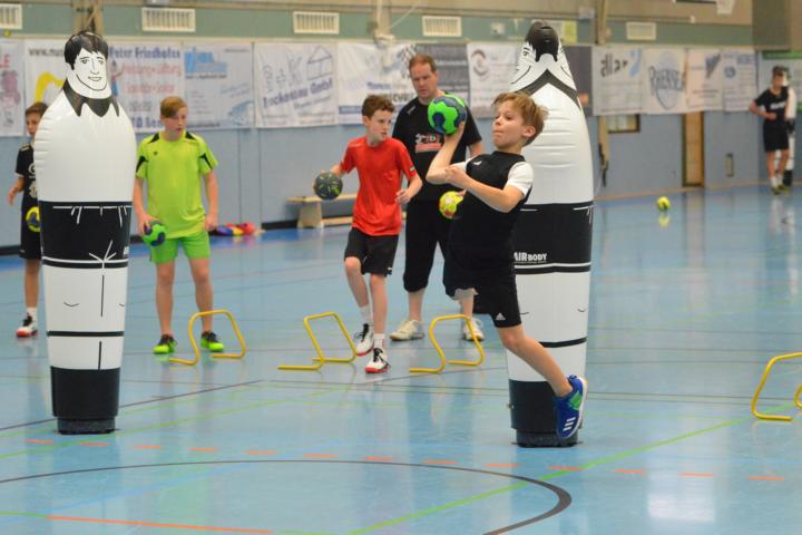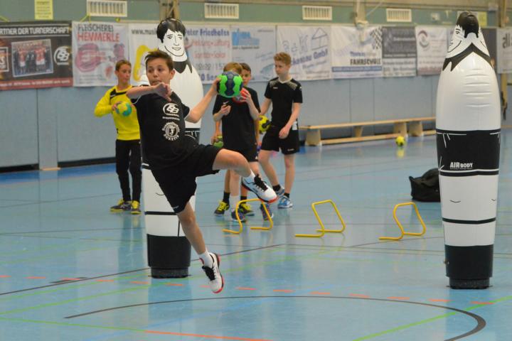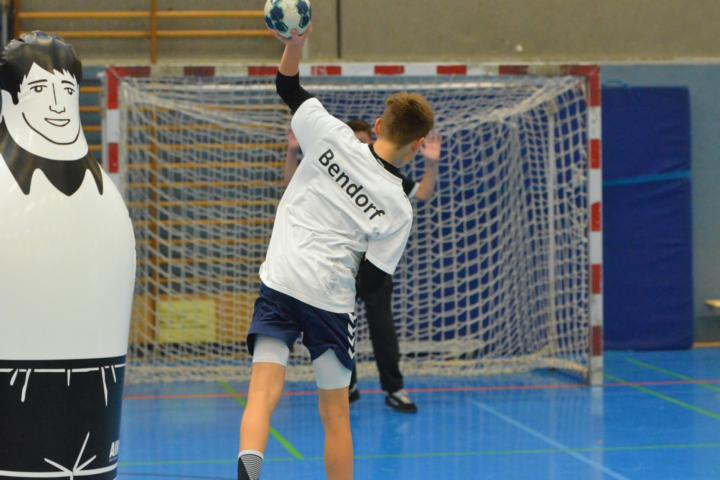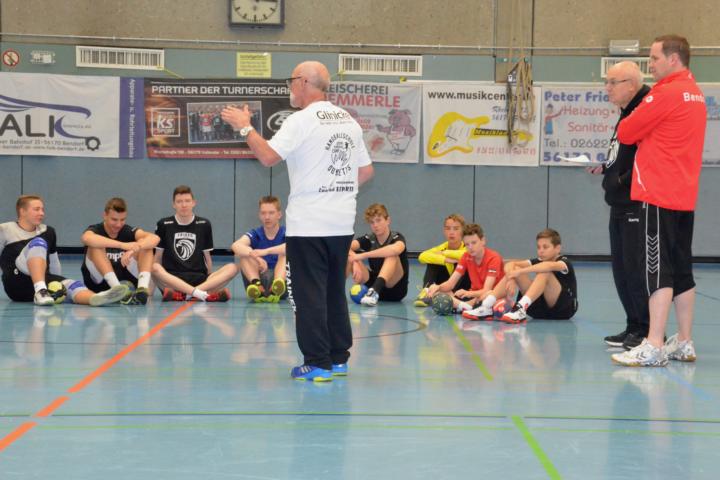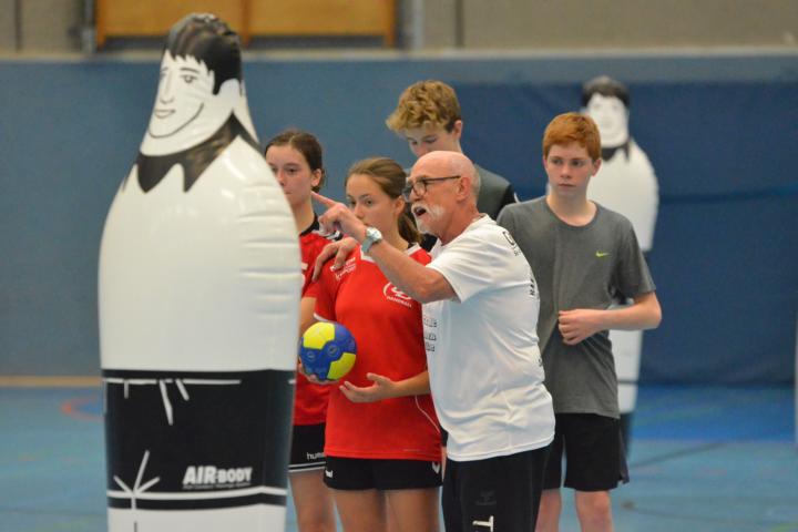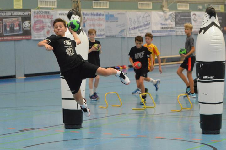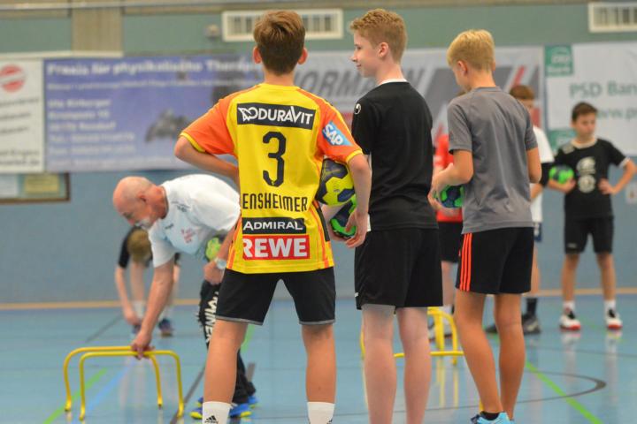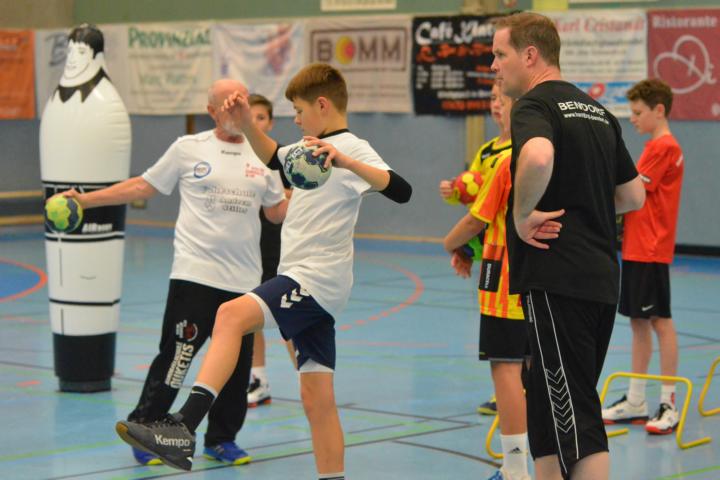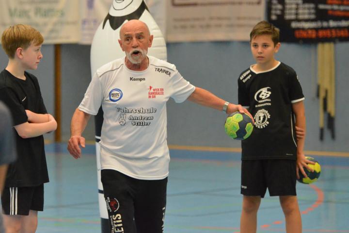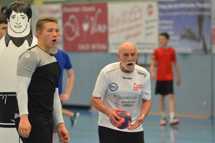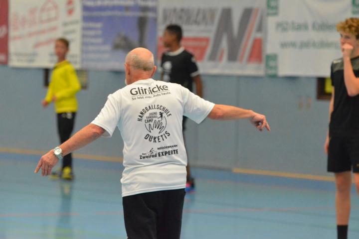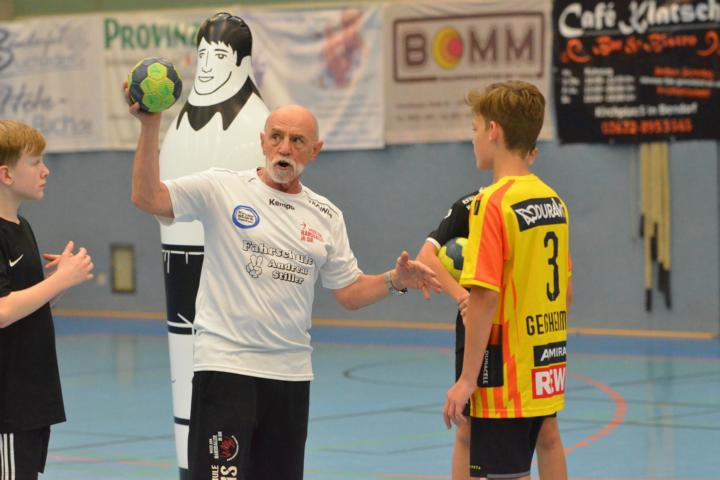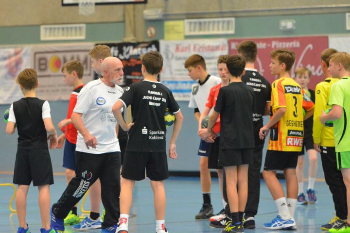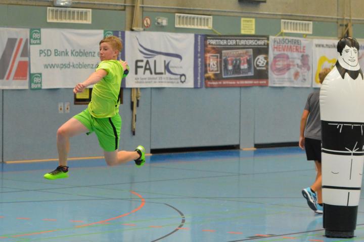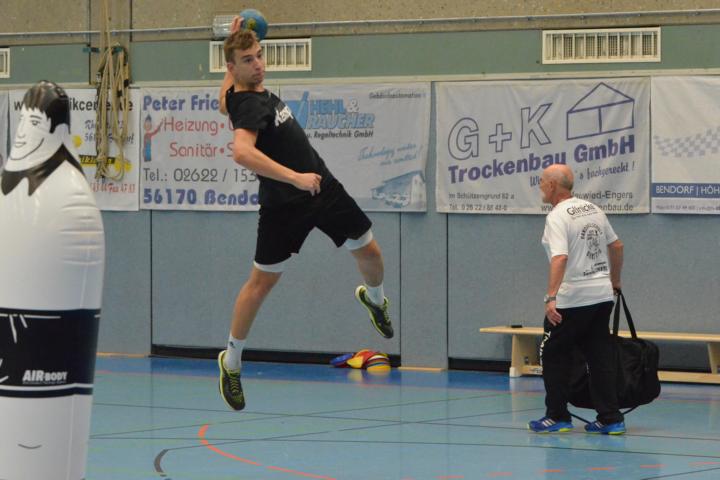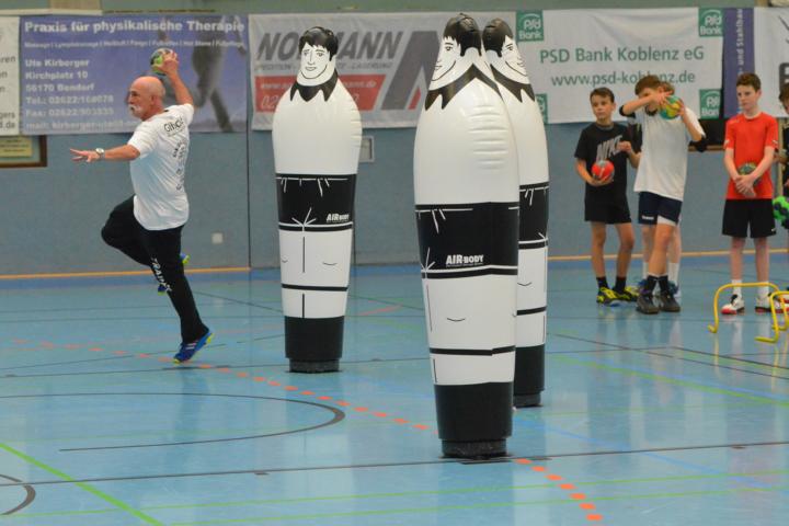 Kaum bin ich in Bendorf angekommen, empfängt mich schon mein guter Freund Paul, das Organisations-Talent. Wir begrüßen uns herzlich und erwarten gemeinsam die Camp-Teilnehmer, die nun nach und nach in der Sporthalle eintrudeln. Es sind Handballer dabei, die bereits seit der D-Jugend kommen und inzwischen A-Jugendliche sind – dementsprechend ist das „Hallo“ groß. Aber es sind auch wieder viele „neue“ Gesichter dabei, die erwartungsvoll schauen und endlich anfangen möchten. Während der Begrüßung und Einführungsrede kommt auch prompt die Frage, die ich schon insgeheim erwartet hatte: „Aber dieses Mal machen wir doch zum Abschied wieder das Hochsprung-Wettspringen, oder?“ Dazu muss ich erläutern, dass wir dieses „Wettspringen“ im vorletzten Jahr eingeführt haben, im letzten Jahr jedoch lief mir in der letzten Trainingseinheit die Zeit davon (wo war die bloß geblieben???) und wir konnten diesen Wettkampf nicht mehr durchführen. Ich hatte ein Jahr lang (also fast) ein schlechtes Gewissen und wurde gleich in den ersten Minuten damit konfrontiert…. geschieht mir ganz recht. Aber nachdem ich mein Versprechen gegeben habe, dass wir dieses Mal ganz bestimmt wieder den Hochsprung-Wettkampf durchführen – übrigens mit dem Trampolin über die große Weichmatte – waren alle beruhigt und es konnte endlich losgehen. Es wurden zu Beginn 4 Stationen aufgebaut, die Anforderungen stellten an die Koordination, an die Balancefähigkeit, die Körperstabilisation und auch eine gute Balltechnik war gefragt. Anschließend ging es im Spiel 3 gegen 3 um Schnelligkeit, Passgenauigkeit und die Schulung des Auges für den „freien Mitspieler“. Dann war auch schon Zeit zum Mittagessen gekommen. Nach der Mittagspause freuten sich alle auf das Üben der Balltechnik und die Schulung zur Verbesserung der Wurftechnik. Anhand der Fotos kann man erkennen, dass hier mit viel Eifer und Ehrgeiz trainiert wurde. Aber hier und da musste ich eingreifen und korrigieren, was die Nachwuchshandballer sogleich annahmen und sofort versuchten umzusetzen und mit der Nachfrage „ist es jetzt besser?“ eine Bestätigung suchten. Das nenne ich Kritikfähigkeit und so macht das Trainieren auch Riesenspaß. Weil manche Übungen nach verbaler Erklärung nicht verstanden wurden, musste ich auch mal wieder richtig aktiv werden und die Übungen auch visuell darbieten. Ich hoffte insgeheim, dass ich die kommende Nacht ohne Muskelkrämpfe überstehen würde und dass sich der Muskelkater hoffentlich in Grenzen halten würde. Aber mein Einsatz lohnte sich, alle waren sprachlos, dass so ein „alter Mann“ noch so gut mit dem Ball umgehen kann. H A L L O ? Was heißt denn hier „alter Mann“? Ich werde es euch schon zeigen – morgen – sollte ich diesen erleben….