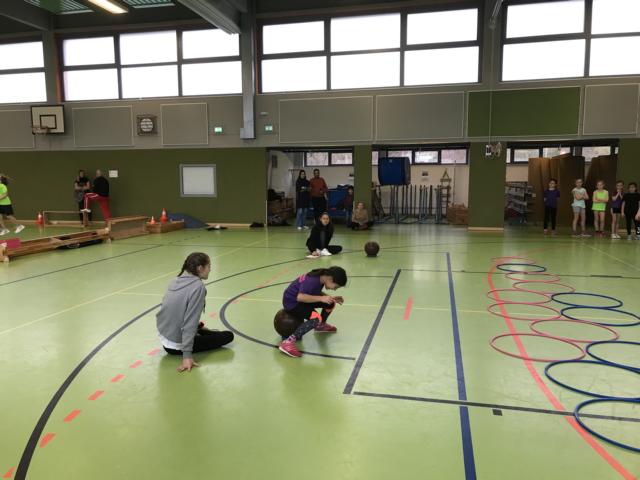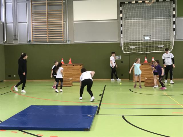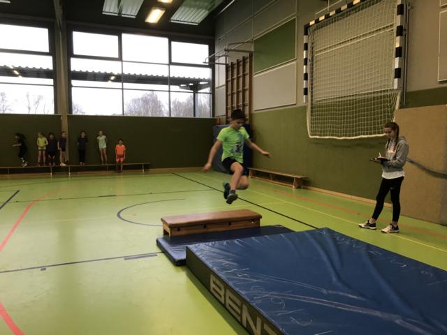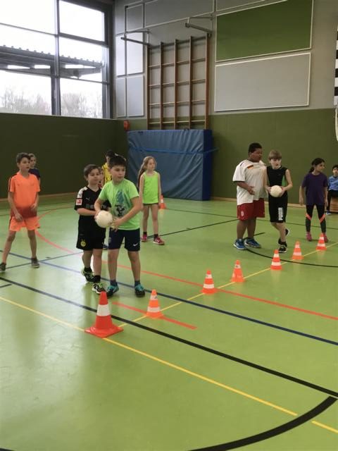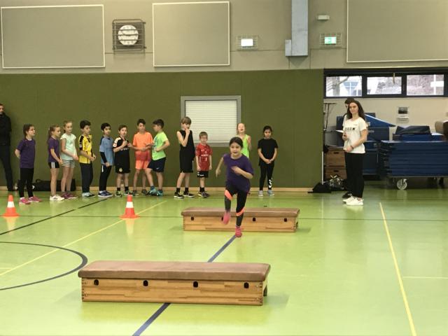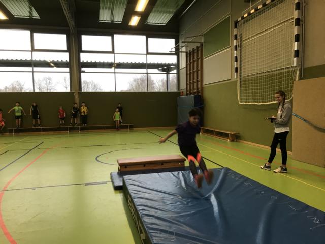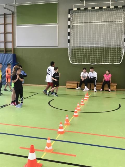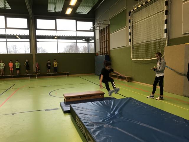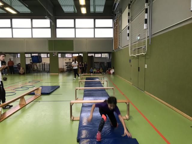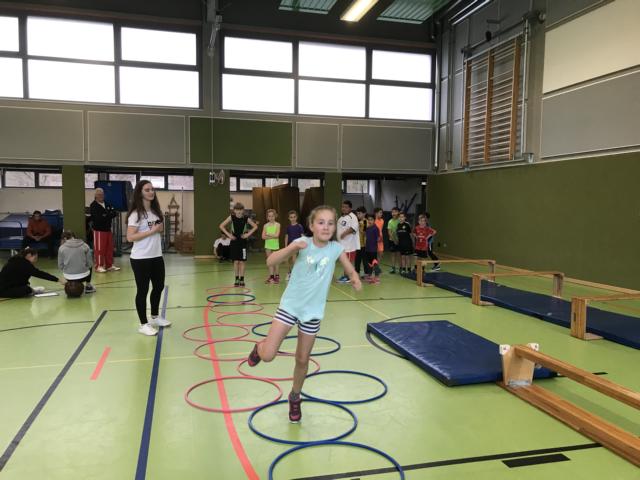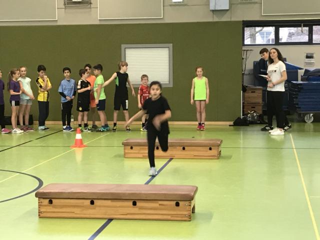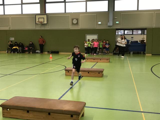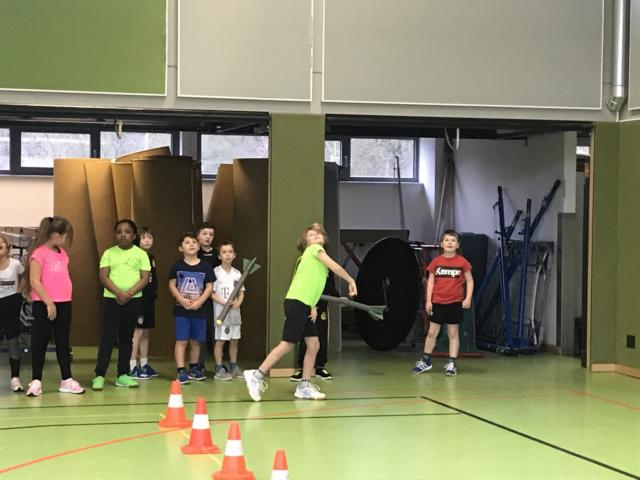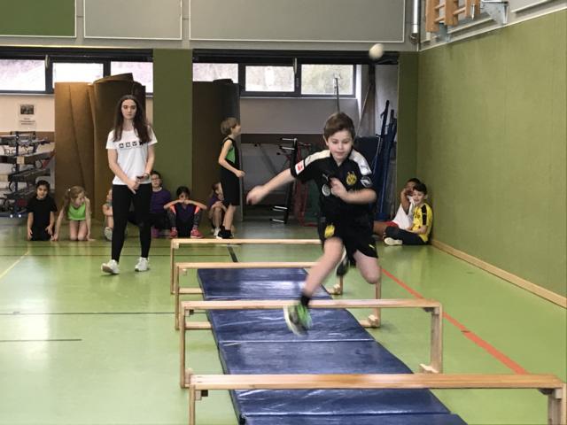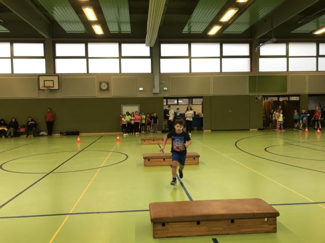 Begonnen wurde mit der Disziplin Leichtathletik: Speerwerfen, Hürdenspringen, Weitspringen. Nach einer kurzen Getränkepause ging es schon weiter mit dem Geschicklichkeitsparcours. Dann das erste Spiel: Hütchenabtreffball. Hierbei geht es darum, gegnerische Spieler abzuwerfen und dann die Hütchen umzuwerfen. Nach einer Spielzeit von 10 Minuten wird gewertet, welche Mannschaft wie viele Spieler abgeworfen bzw. Hütchen umgeworfen hat. Anschließend wurde Hockey gespielt. Nicht alle Schüler und Schülerinnen konnten sich im Vorfeld auf das Hockeyspiel vorbereiten. Zu einem gibt es nicht überall Hockeyschläger, zum anderen reicht der Platz in der Sporthalle einfach nicht dafür aus. Danach stand die Disziplin „Turnen“ auf dem Programm, wie z.B. Bockspringen usw. Vielen Kindern bereitete dieser „Bock“ schon immense Probleme, es war lustig zu sehen, mit welchen „Figuren“ manche Kinder den Bock bezwangen. Am Ende gab es eine Art „Biathlon“ – nur ohne Schnee, versteht sich. Das Team aus 12 Kindern wurde in 4x 3 Kinder geteilt. Die Dreiergruppe musste eine Wegstrecke zurücklegen und anschließend Bälle von Kästen abwerfen. Jedes Kind hatte dabei zwei Bälle. Verblieb nach allen geworfenen Bällen noch Ziele auf dem Kasten, so musste die komplette Mannschaft Strafrunden laufen, jeweils so viele, wie Ziele auf dem Kasten verblieben waren. Erst wenn das komplette Dreierteam am Ziel ankam, dürfte die nächste Dreiergruppe starten.