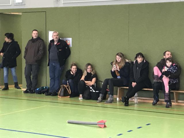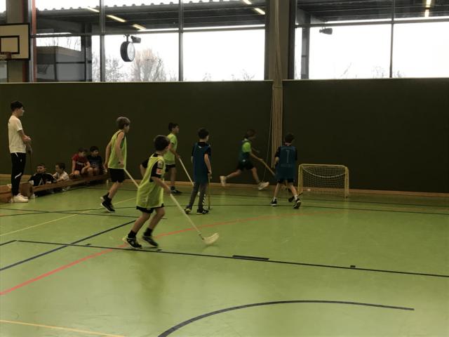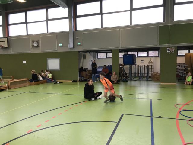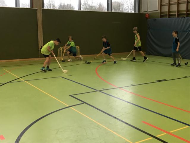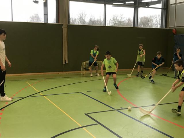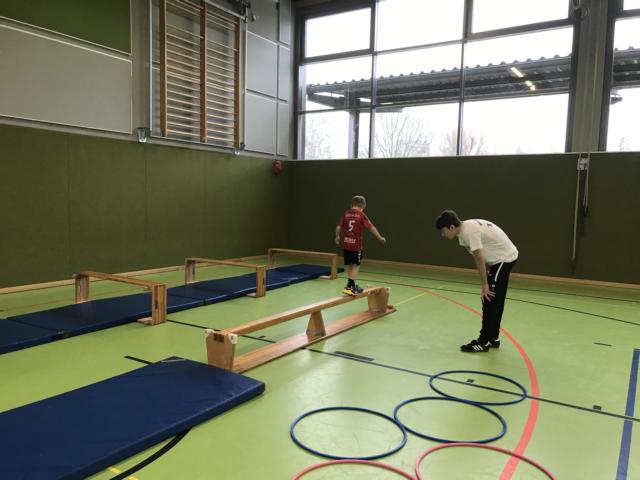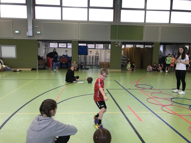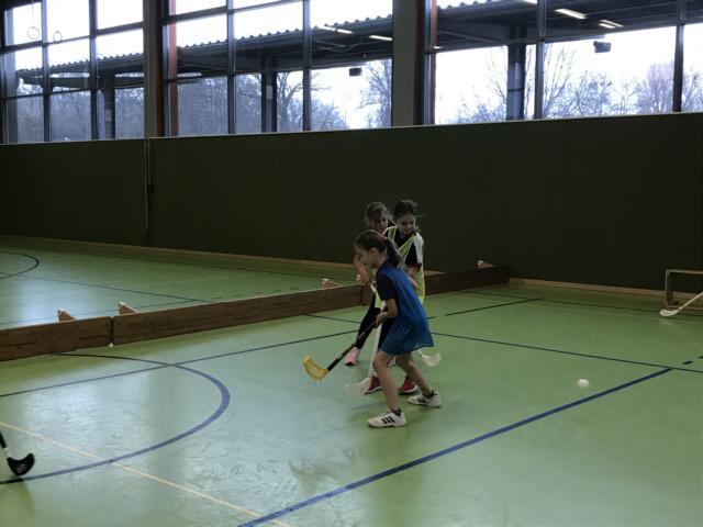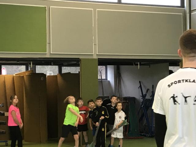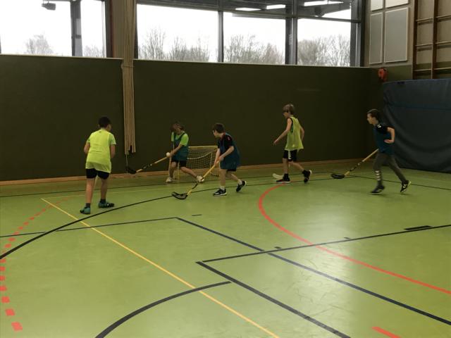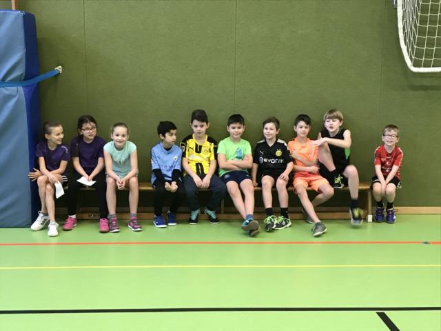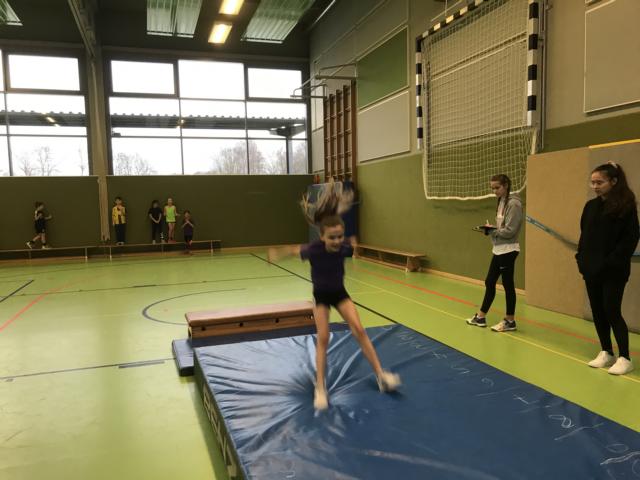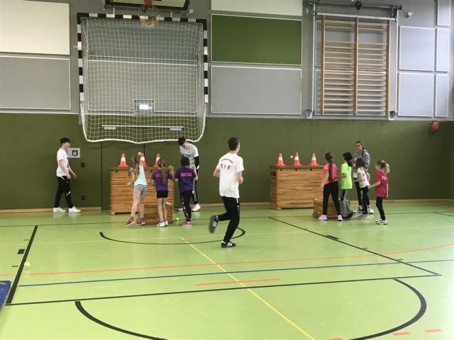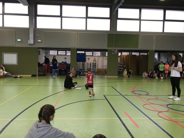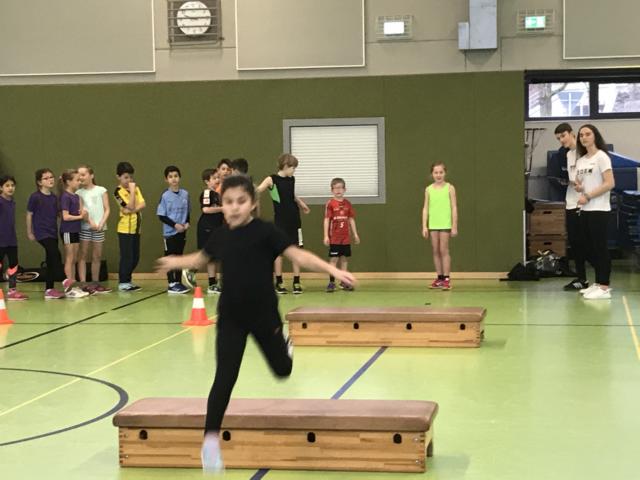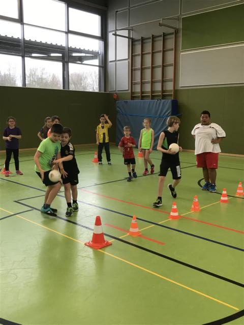 Begonnen wurde mit der Disziplin Leichtathletik: Speerwerfen, Hürdenspringen, Weitspringen. Nach einer kurzen Getränkepause ging es schon weiter mit dem Geschicklichkeitsparcours. Dann das erste Spiel: Hütchenabtreffball. Hierbei geht es darum, gegnerische Spieler abzuwerfen und dann die Hütchen umzuwerfen. Nach einer Spielzeit von 10 Minuten wird gewertet, welche Mannschaft wie viele Spieler abgeworfen bzw. Hütchen umgeworfen hat. Anschließend wurde Hockey gespielt. Nicht alle Schüler und Schülerinnen konnten sich im Vorfeld auf das Hockeyspiel vorbereiten. Zu einem gibt es nicht überall Hockeyschläger, zum anderen reicht der Platz in der Sporthalle einfach nicht dafür aus. Danach stand die Disziplin „Turnen“ auf dem Programm, wie z.B. Bockspringen usw. Vielen Kindern bereitete dieser „Bock“ schon immense Probleme, es war lustig zu sehen, mit welchen „Figuren“ manche Kinder den Bock bezwangen. Am Ende gab es eine Art „Biathlon“ – nur ohne Schnee, versteht sich. Das Team aus 12 Kindern wurde in 4x 3 Kinder geteilt. Die Dreiergruppe musste eine Wegstrecke zurücklegen und anschließend Bälle von Kästen abwerfen. Jedes Kind hatte dabei zwei Bälle. Verblieb nach allen geworfenen Bällen noch Ziele auf dem Kasten, so musste die komplette Mannschaft Strafrunden laufen, jeweils so viele, wie Ziele auf dem Kasten verblieben waren. Erst wenn das komplette Dreierteam am Ziel ankam, dürfte die nächste Dreiergruppe starten.