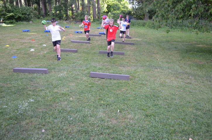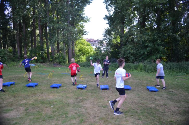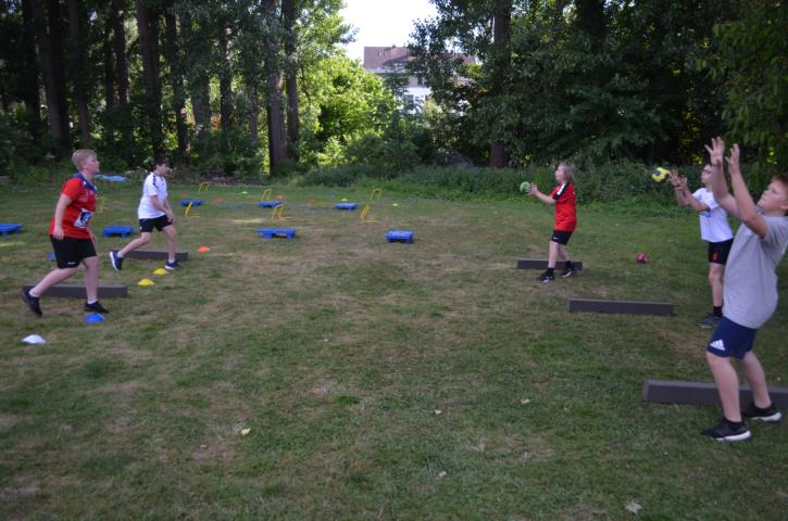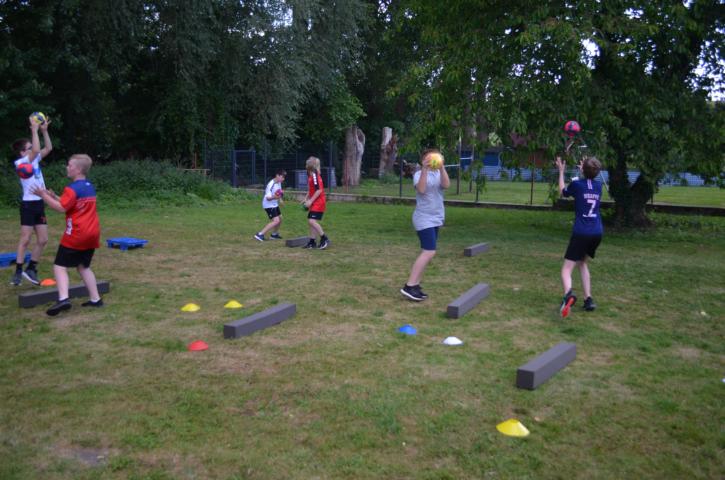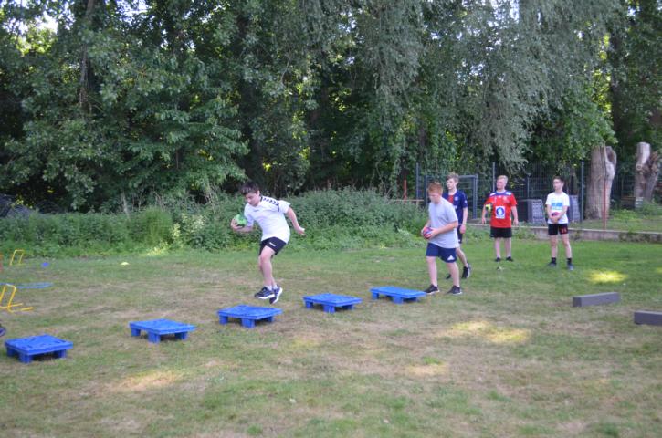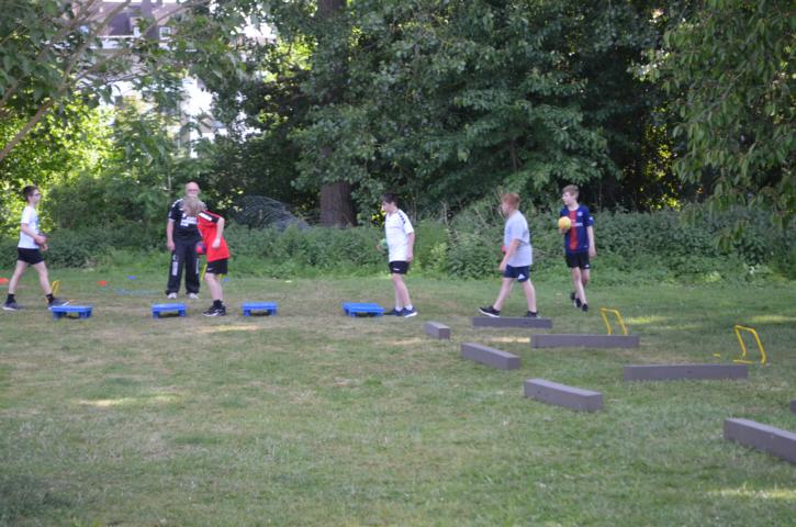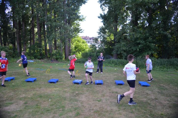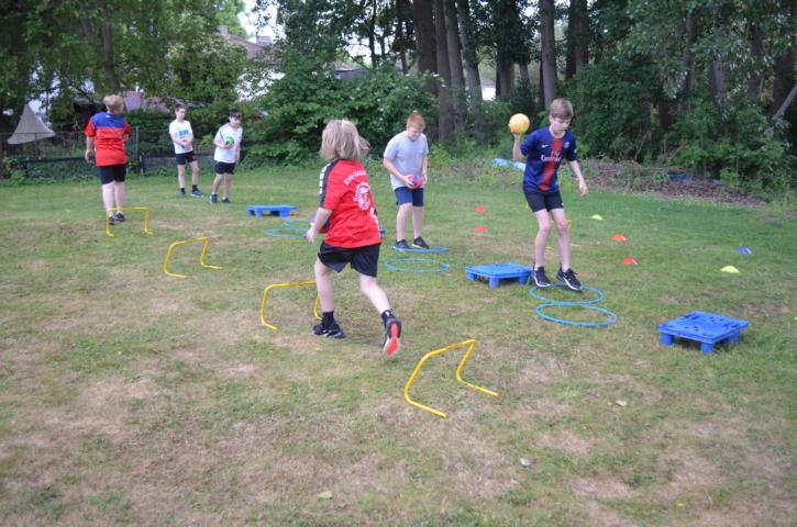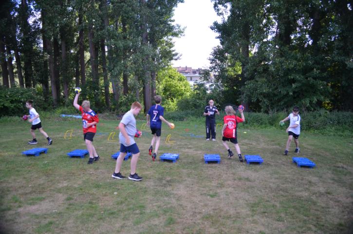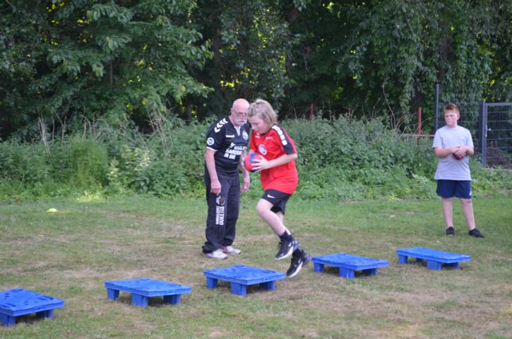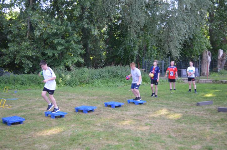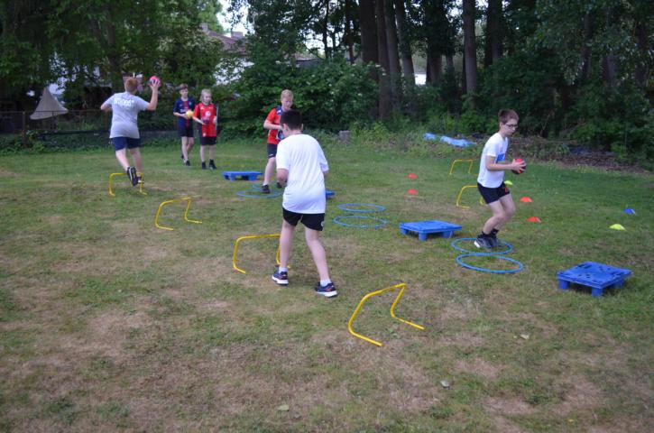 In das heutige Training mit meiner männlichen D-Jugend habe ich sehr viele Elemente aus der Koordination eingebaut, um die richtige Schrittfolge beim Sprungwurf einzustudieren. Dabei helfen mir die Steppbretter, um verschiedene Sprungfolgen zu üben und den richtigen Schrittrhythmus zu finden. Die „Pommes“ werden so auf dem Boden platziert, dass man hier sehr gut schnelle Richtungswechsel etc. trainiert. Das technische Element ist in dieser Trainingseinheit das genaue Passspiel über verschiedene Distanzen: zuerst den Schlagwurf aus sehr kurzer Entfernung, dann schrittweise erweitert bis hin zum Sprungwurf aus größerer Distanz. Ein genaues Passspiel ist beim Handball sehr wichtig, um technische Fehler zu vermeiden. Für die o.g. Aufgaben und Übungen haben sich die Spieler richtig gut aufgewärmt, natürlich auch mit koordinativen Elementen, wie z.B. mit der Koordinationsleiter, die bei keinem Training fehlen darf. Unterschiedliche Arten von Lauftechniken dienen gleichzeitig dazu, die Beine gut aufzuwärmen für das anschließende Üben des Sprungwurfs. Aber auch für Abwehrübungen sind schnelle Beine unerlässlich. Hier üben wir die richtige Stellung gegen Angreifer (Links- und Rechtshänder), allerdings ohne Körperkontakt. Gerade in der Abwehr ist eine korrekte Körperhaltung und eine richtige Schrittfolge wichtig, um den Angreifer frühzeitig zu stören und abzuwehren und diese Bewegungsabläufe müssen hier automatisiert werden. Ich würde zum jetzigen Zeitpunkt gerne noch viel mehr Abwehrkomponenten in die Trainingseinheit einbauen, es darf allerdings zurzeit noch kein Zweikampf oder jeglicher Körperkontakt stattfinden. Darum gehen im Moment nur „Trockenübungen“, die von mir so variiert und verpackt werden, damit es den Kids nicht langweilig wird.