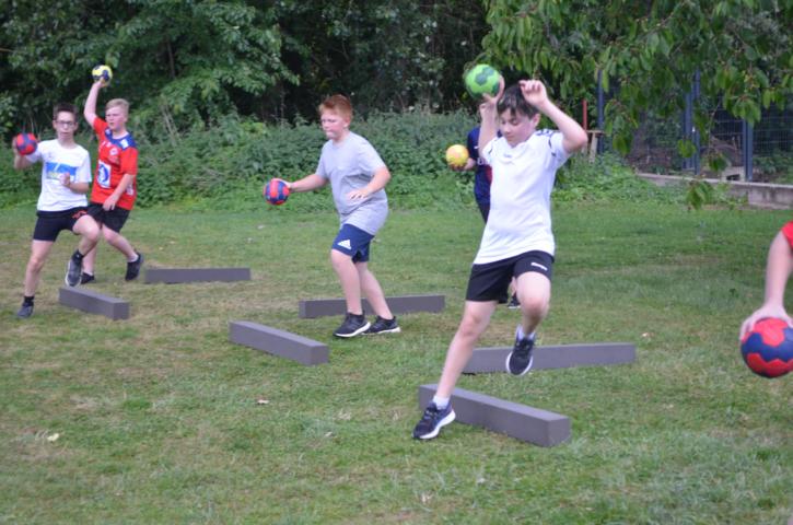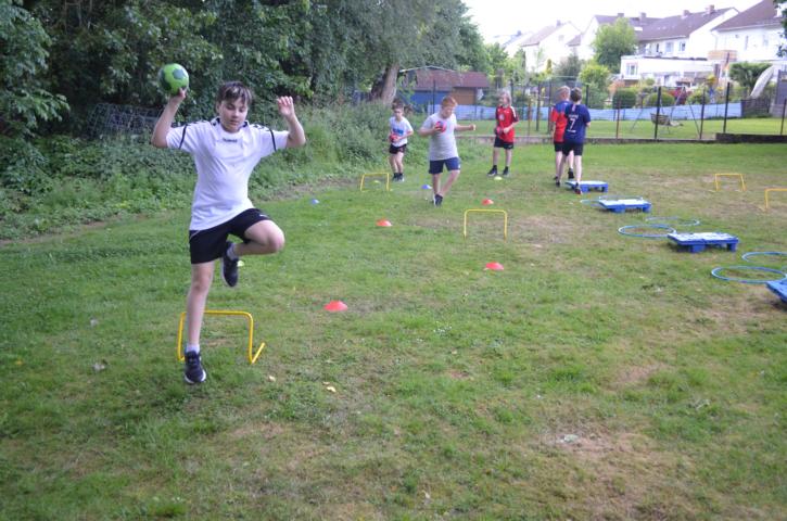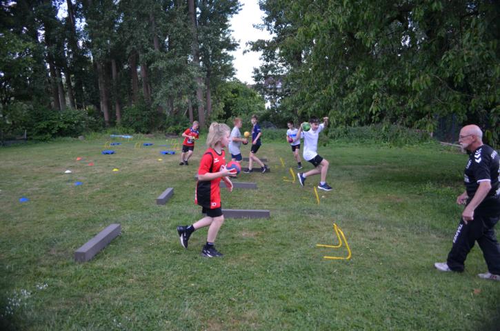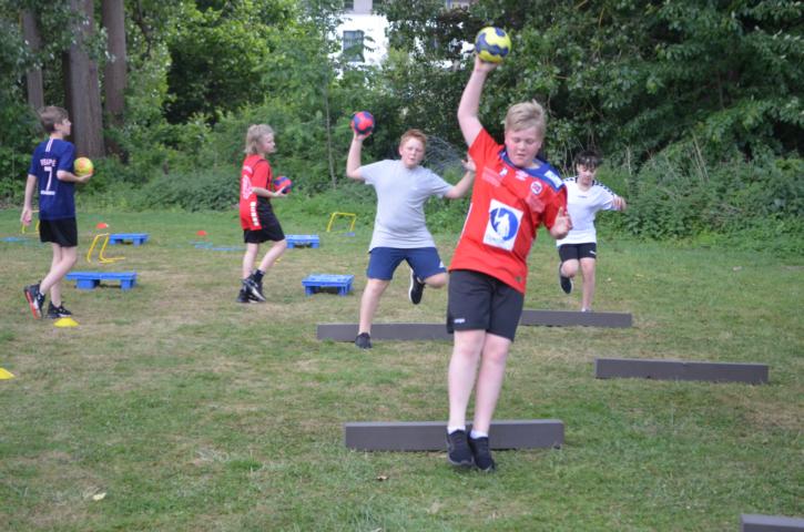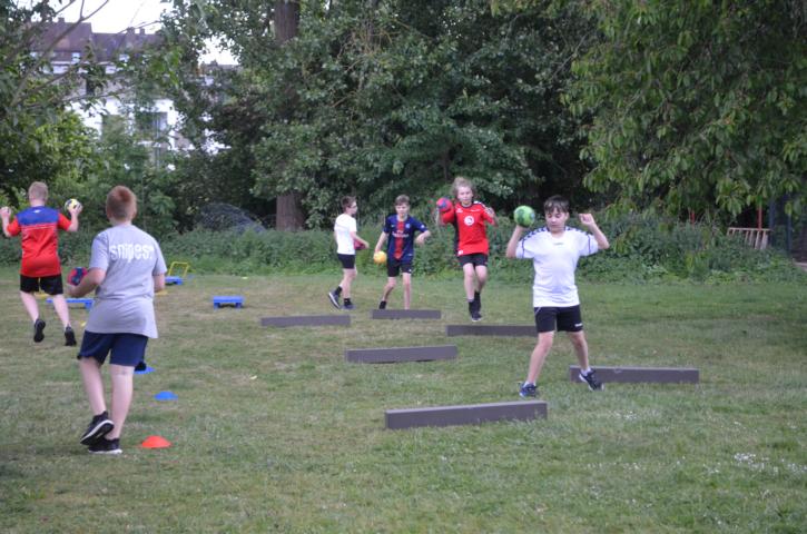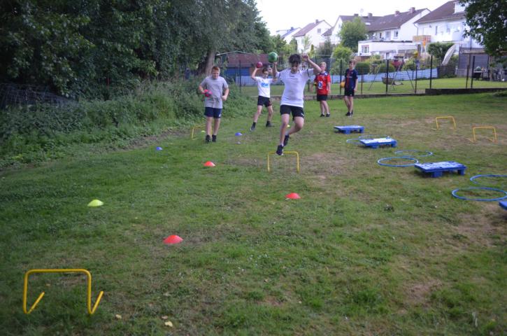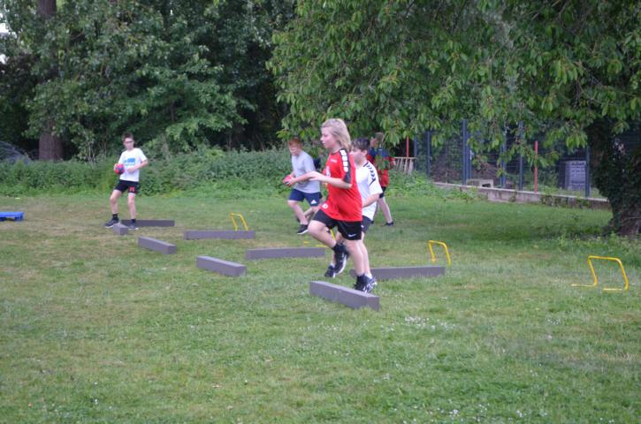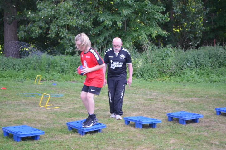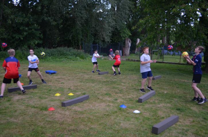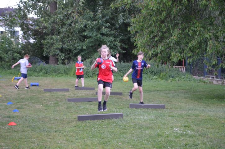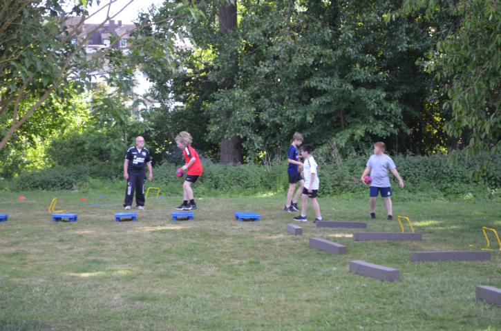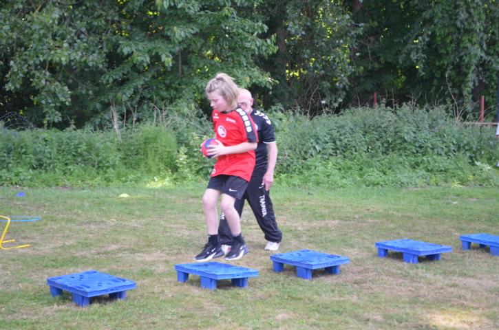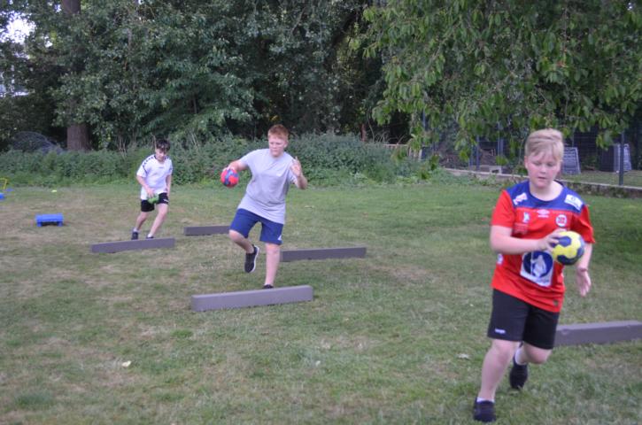 In das heutige Training mit meiner männlichen D-Jugend habe ich sehr viele Elemente aus der Koordination eingebaut, um die richtige Schrittfolge beim Sprungwurf einzustudieren. Dabei helfen mir die Steppbretter, um verschiedene Sprungfolgen zu üben und den richtigen Schrittrhythmus zu finden. Die „Pommes“ werden so auf dem Boden platziert, dass man hier sehr gut schnelle Richtungswechsel etc. trainiert. Das technische Element ist in dieser Trainingseinheit das genaue Passspiel über verschiedene Distanzen: zuerst den Schlagwurf aus sehr kurzer Entfernung, dann schrittweise erweitert bis hin zum Sprungwurf aus größerer Distanz. Ein genaues Passspiel ist beim Handball sehr wichtig, um technische Fehler zu vermeiden. Für die o.g. Aufgaben und Übungen haben sich die Spieler richtig gut aufgewärmt, natürlich auch mit koordinativen Elementen, wie z.B. mit der Koordinationsleiter, die bei keinem Training fehlen darf. Unterschiedliche Arten von Lauftechniken dienen gleichzeitig dazu, die Beine gut aufzuwärmen für das anschließende Üben des Sprungwurfs. Aber auch für Abwehrübungen sind schnelle Beine unerlässlich. Hier üben wir die richtige Stellung gegen Angreifer (Links- und Rechtshänder), allerdings ohne Körperkontakt. Gerade in der Abwehr ist eine korrekte Körperhaltung und eine richtige Schrittfolge wichtig, um den Angreifer frühzeitig zu stören und abzuwehren und diese Bewegungsabläufe müssen hier automatisiert werden. Ich würde zum jetzigen Zeitpunkt gerne noch viel mehr Abwehrkomponenten in die Trainingseinheit einbauen, es darf allerdings zurzeit noch kein Zweikampf oder jeglicher Körperkontakt stattfinden. Darum gehen im Moment nur „Trockenübungen“, die von mir so variiert und verpackt werden, damit es den Kids nicht langweilig wird.