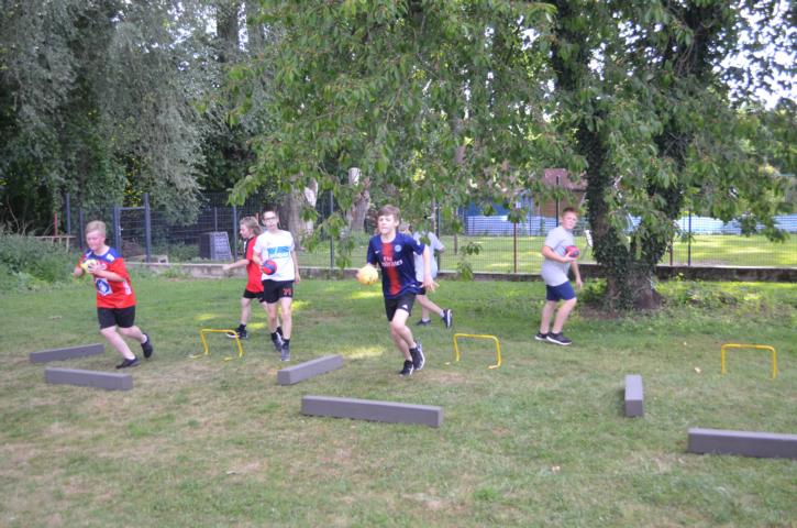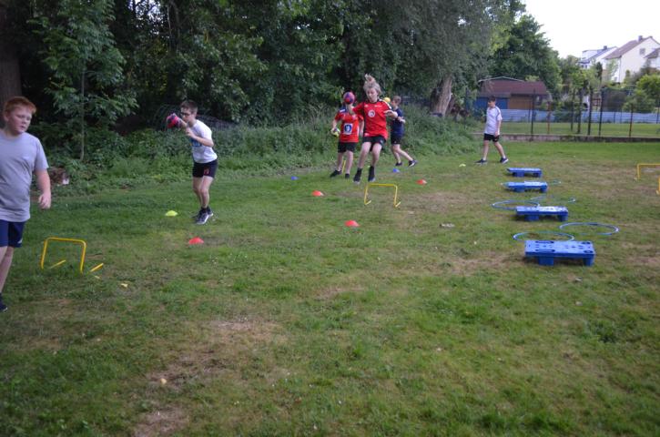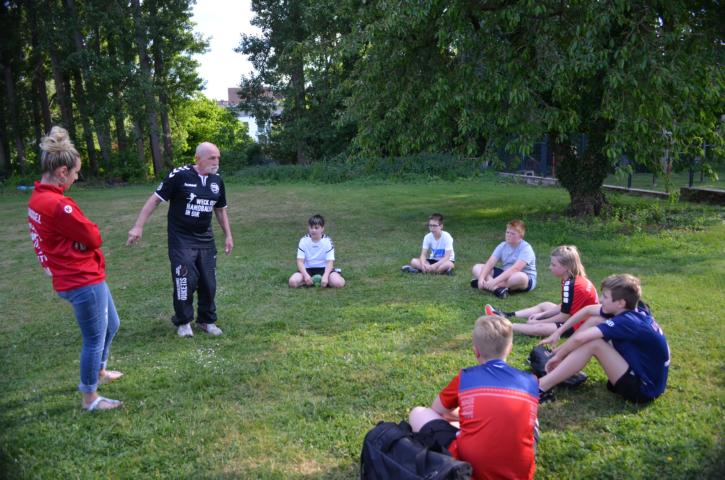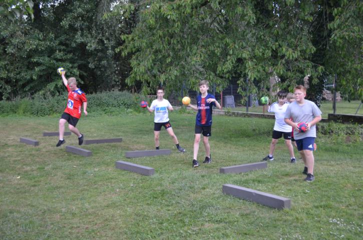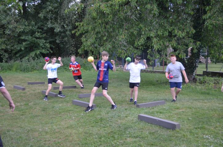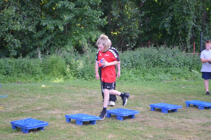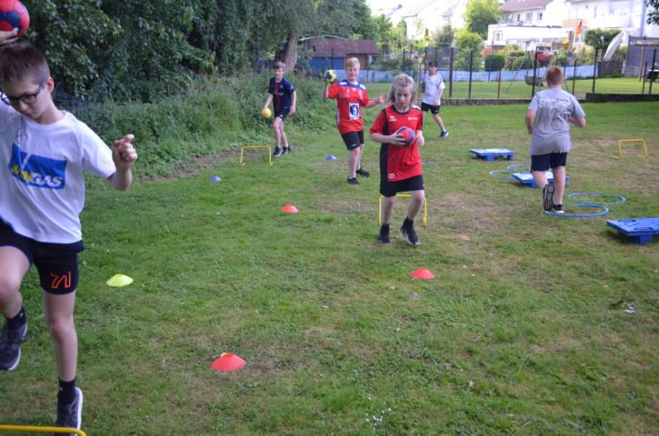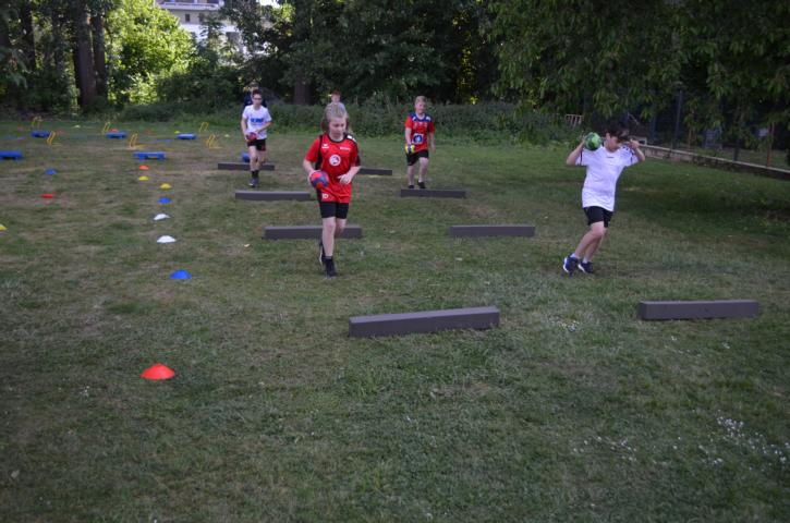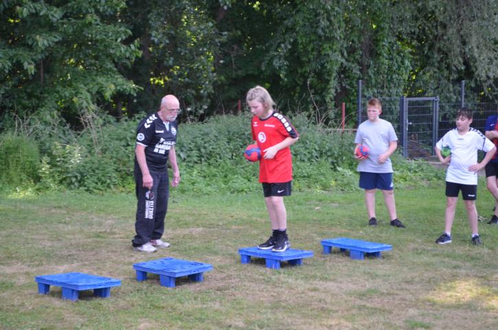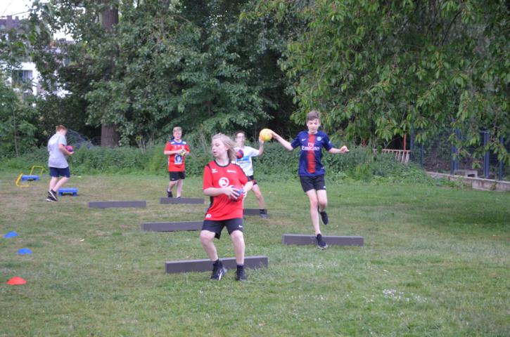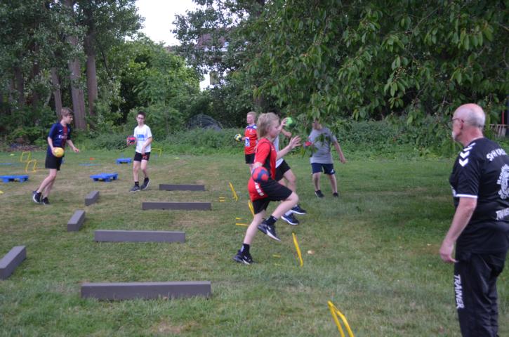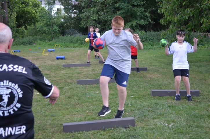 In das heutige Training mit meiner männlichen D-Jugend habe ich sehr viele Elemente aus der Koordination eingebaut, um die richtige Schrittfolge beim Sprungwurf einzustudieren. Dabei helfen mir die Steppbretter, um verschiedene Sprungfolgen zu üben und den richtigen Schrittrhythmus zu finden. Die „Pommes“ werden so auf dem Boden platziert, dass man hier sehr gut schnelle Richtungswechsel etc. trainiert. Das technische Element ist in dieser Trainingseinheit das genaue Passspiel über verschiedene Distanzen: zuerst den Schlagwurf aus sehr kurzer Entfernung, dann schrittweise erweitert bis hin zum Sprungwurf aus größerer Distanz. Ein genaues Passspiel ist beim Handball sehr wichtig, um technische Fehler zu vermeiden. Für die o.g. Aufgaben und Übungen haben sich die Spieler richtig gut aufgewärmt, natürlich auch mit koordinativen Elementen, wie z.B. mit der Koordinationsleiter, die bei keinem Training fehlen darf. Unterschiedliche Arten von Lauftechniken dienen gleichzeitig dazu, die Beine gut aufzuwärmen für das anschließende Üben des Sprungwurfs. Aber auch für Abwehrübungen sind schnelle Beine unerlässlich. Hier üben wir die richtige Stellung gegen Angreifer (Links- und Rechtshänder), allerdings ohne Körperkontakt. Gerade in der Abwehr ist eine korrekte Körperhaltung und eine richtige Schrittfolge wichtig, um den Angreifer frühzeitig zu stören und abzuwehren und diese Bewegungsabläufe müssen hier automatisiert werden. Ich würde zum jetzigen Zeitpunkt gerne noch viel mehr Abwehrkomponenten in die Trainingseinheit einbauen, es darf allerdings zurzeit noch kein Zweikampf oder jeglicher Körperkontakt stattfinden. Darum gehen im Moment nur „Trockenübungen“, die von mir so variiert und verpackt werden, damit es den Kids nicht langweilig wird.