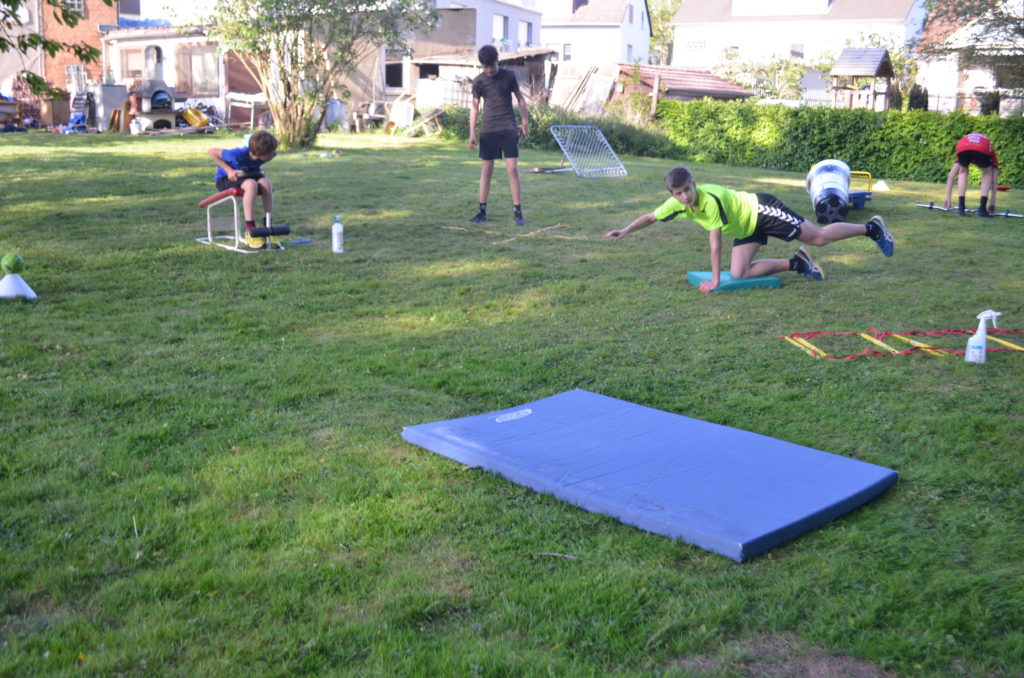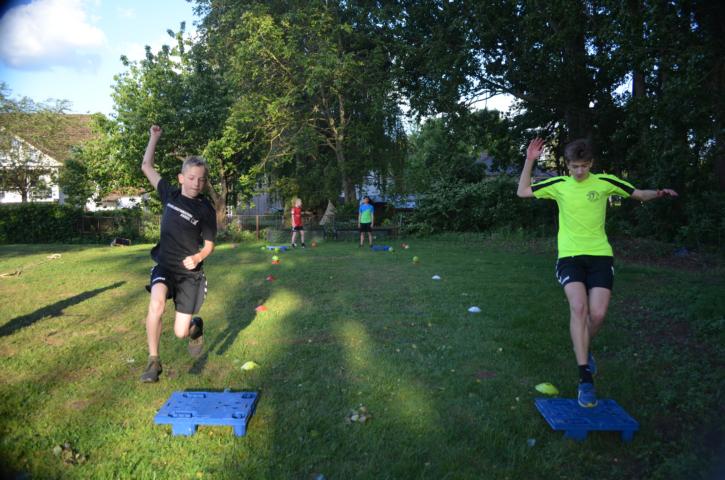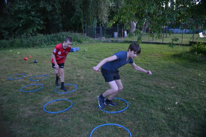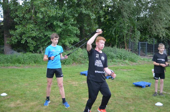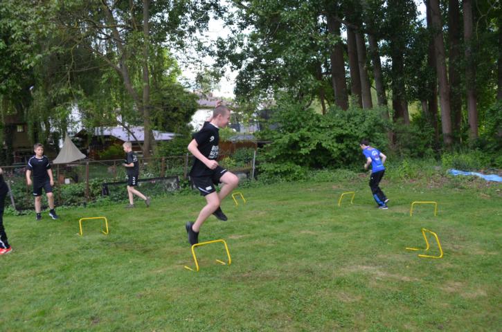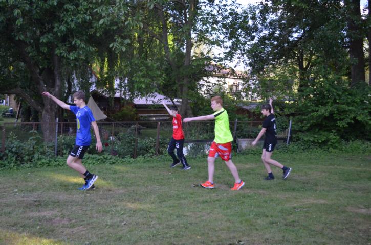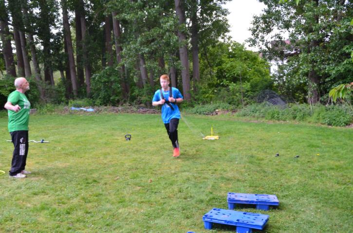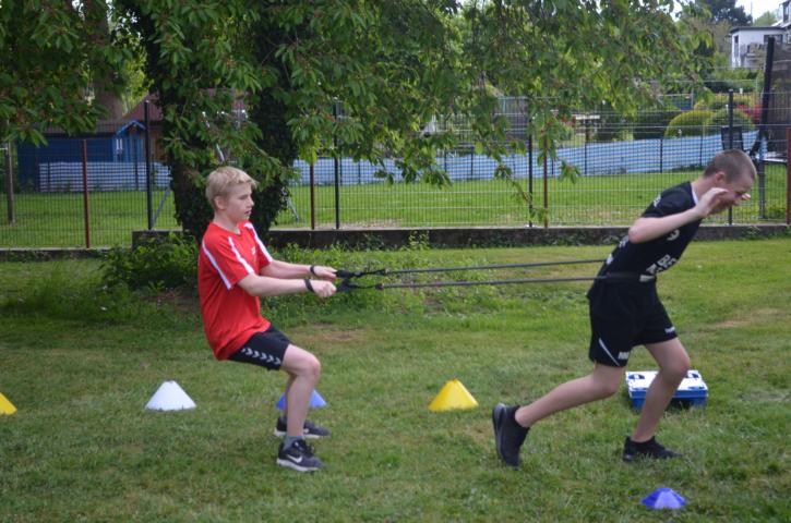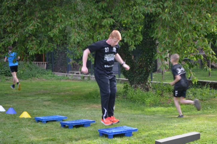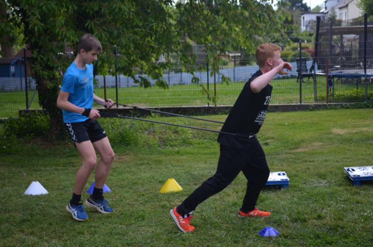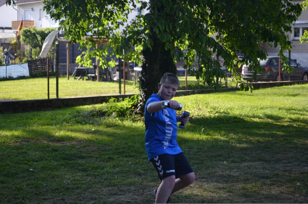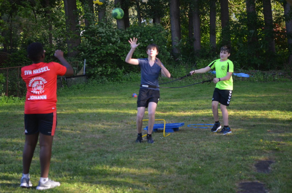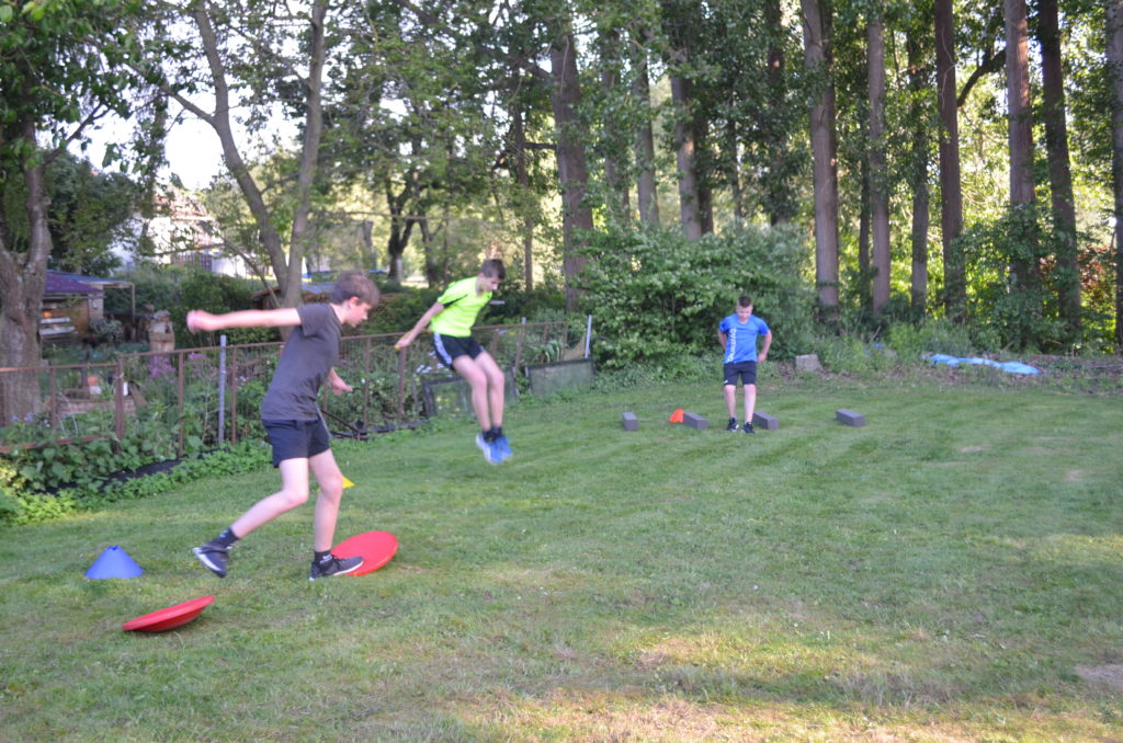 Das Üben unter erschwerten Bedingungen ist sinnvoll, da die Spieler sich im eigentlichen Spiel dann umso leichter tun. Bezogen auf den Sprungwurf ist es deshalb besonders hilfreich, Hindernisse einzusetzen, gegen welche sich die Spieler durchsetzen müssen. Bei mir im Garten kommen hier die Trainingsbuddies und die Power-Bungee-Gurte zum Einsatz sowie kleinere Hindernisse auf dem Rasen.