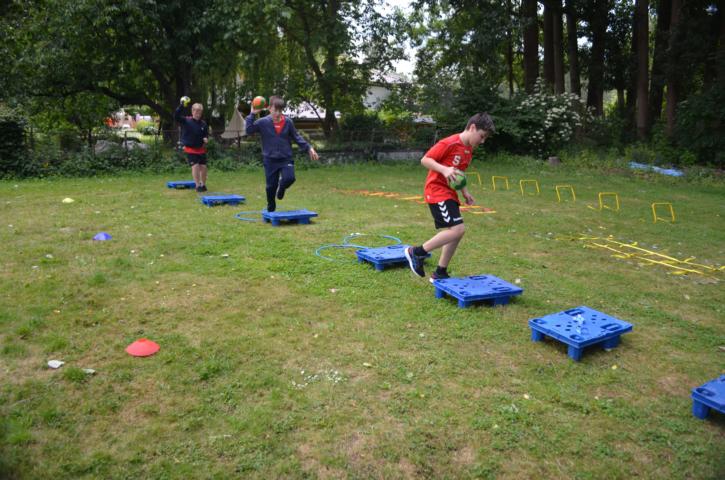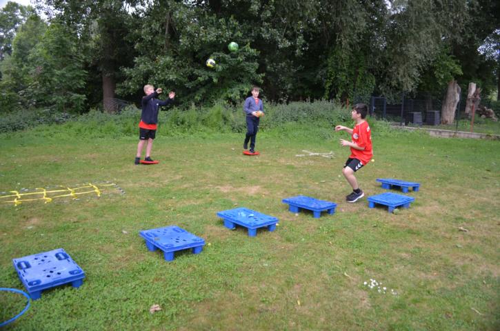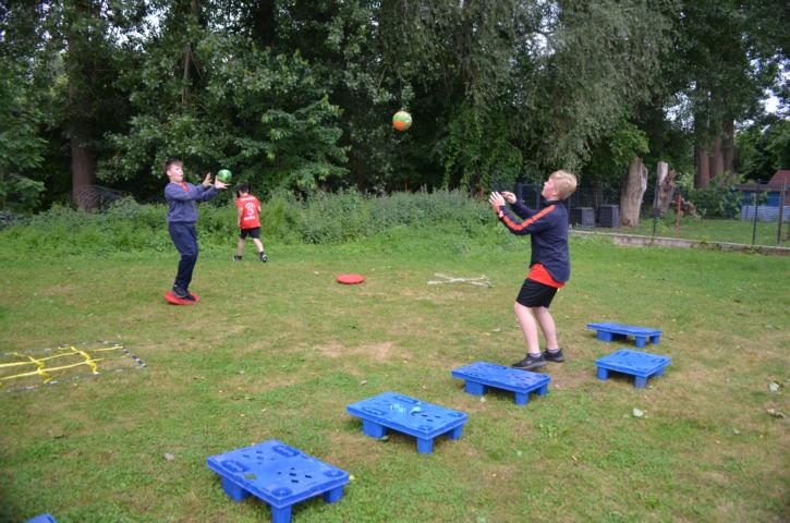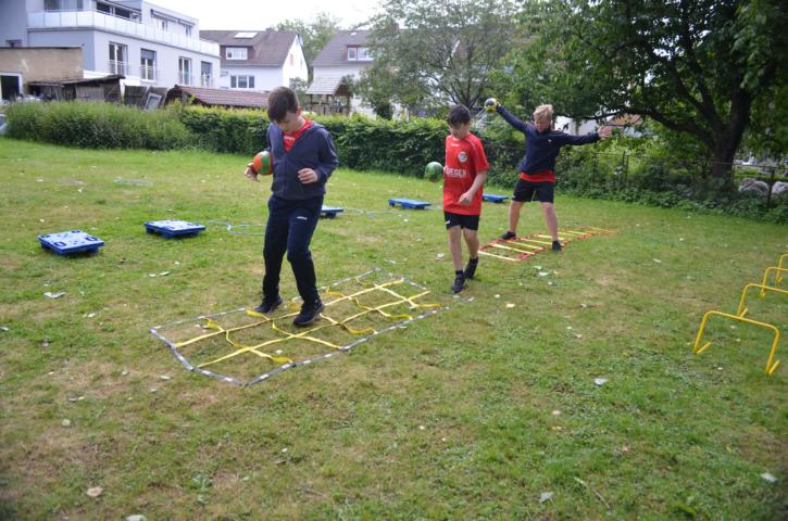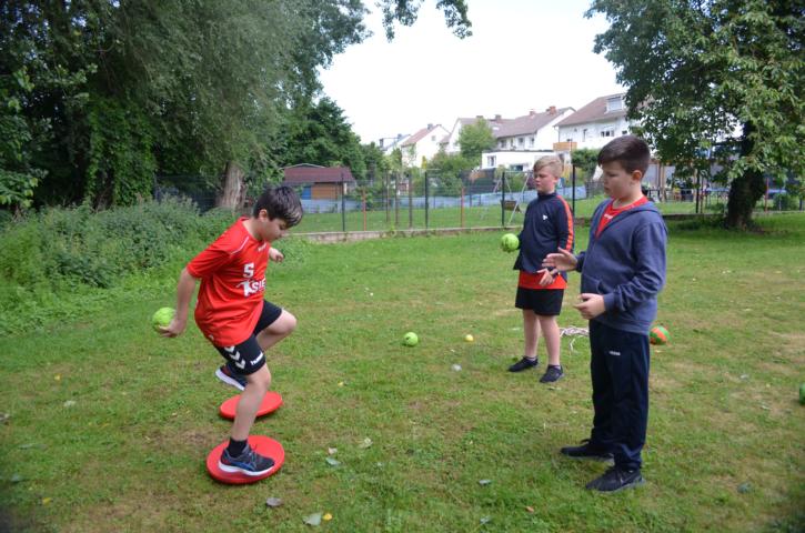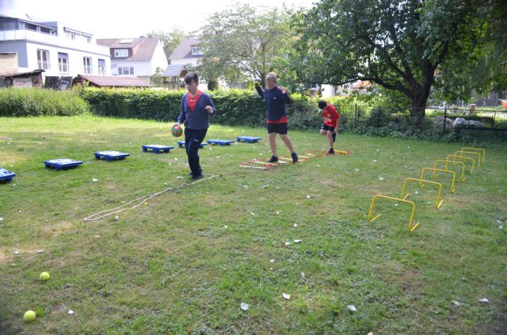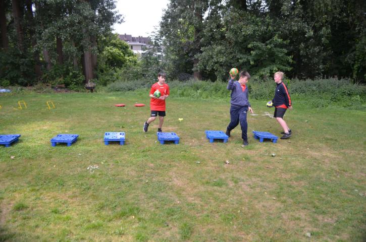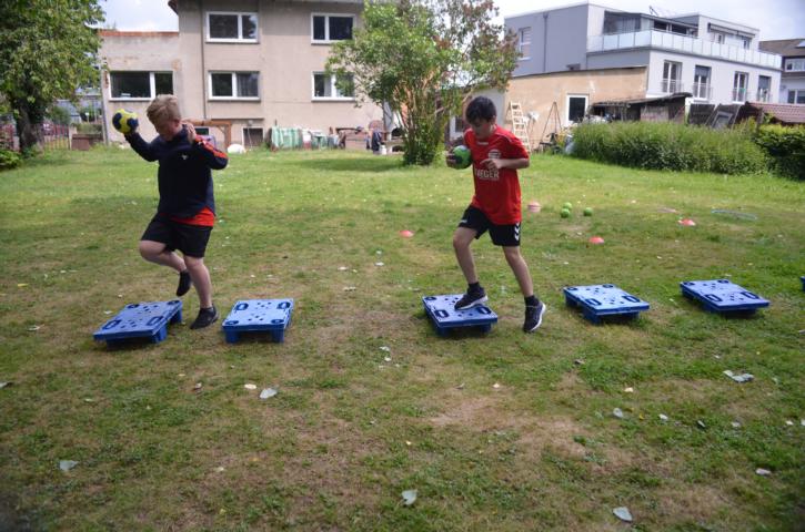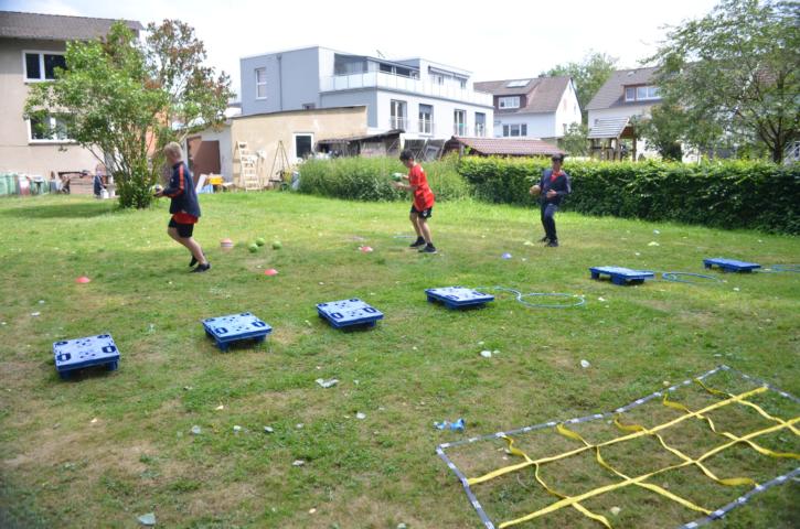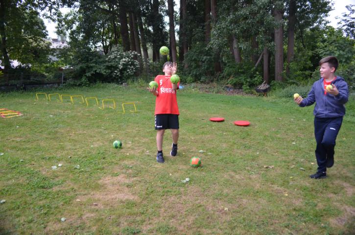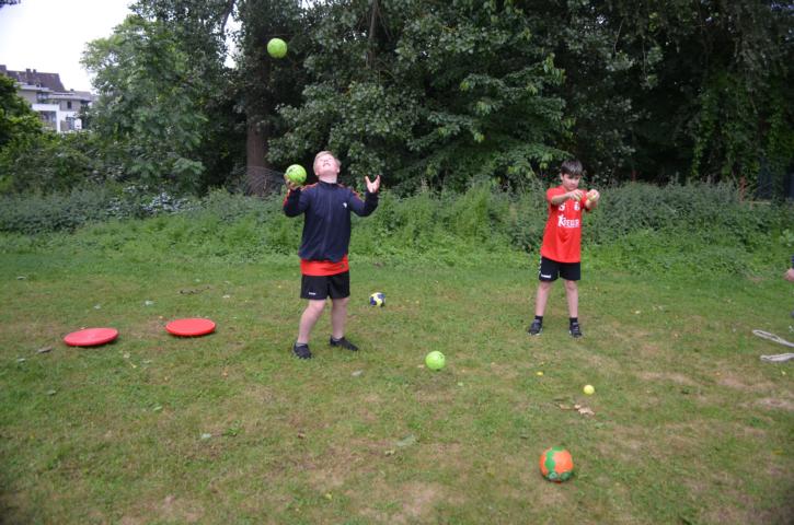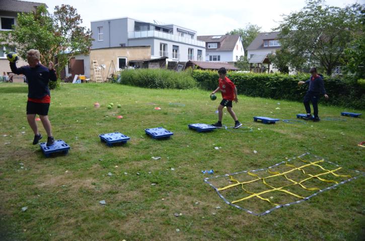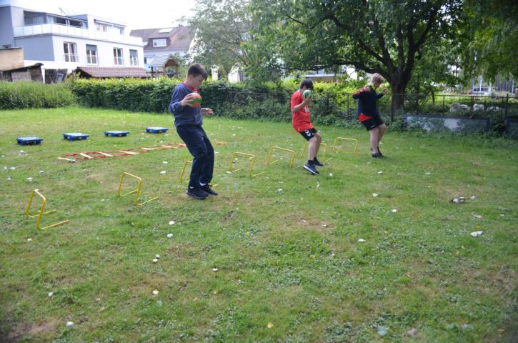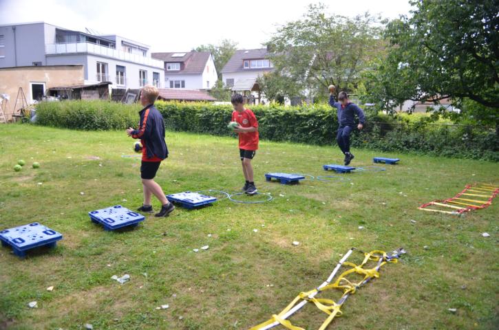 Zum Einsatz kommen heute neben kleinen Handbällen auch Tennisbälle. Der Tennisball ist ein kostengünstiges Spiel- und Sportobjekt mit vielseitigen Möglichkeiten. Wegen seines geringen Gewichts aber dafür guter Griffigkeit eignet er sich sehr gut für die Schulung koordinativer Fähigkeiten. Ich setze ihn heute u.a. beim Jonglieren ein. Auf den Bildern ist sehr gut zu erkennen, dass es anfangs Schwierigkeiten bereitet, zwei Tennisbälle gleichzeitig zu kontrollieren. Im weiteren Verlauf der Übungen funktioniert es aber immer besser und am Ende klappt es doch schon ganz gut. Eine weitere Herausforderung stellen die beiden Koordinationsleitern (einfach und dreifach) dar. Hier ist Rhythmusgefühl gefragt und die Orientierungsfähigkeit. Viele verschiedene Schrittfolgen müssen hier koordiniert werden. Die kleinen Hürden bereiten noch so manche Probleme, vor allem beim seitlichen Überspringen. Hier fehlt eine fließende Bewegung, die Kinder bremsen vor der Hürde ab und verlieren den Schwung. Viele Wiederholungen sorgen aber dafür, dass die Kinder bald ihren Rhythmus finden und es eine fließende Bewegung gibt. Auf den Steppbrettern gilt es, Sprünge zu variieren. Auf dem ersten Steppbrett wird beidbeinig gelandet, auf den Boden dann mit dem rechten Fuß gelandet und abgesprungen, um auf dem zweiten Steppbrett dann wieder beidbeinig zu landen. Danach wird auf dem Boden mit dem linken Bein gelandet und abgesprungen, um auf dem dritten Steppbrett wieder beidbeinig zu landen, etc. Das erfordert neben Rhythmusgefühl und Sprungkraft auch höchste Konzentration.