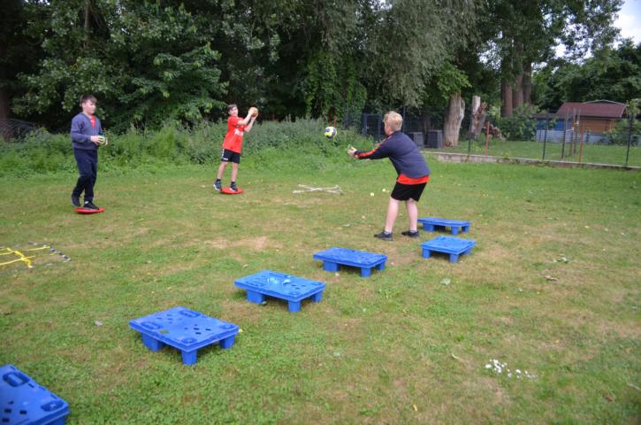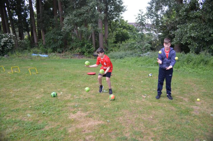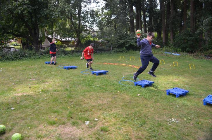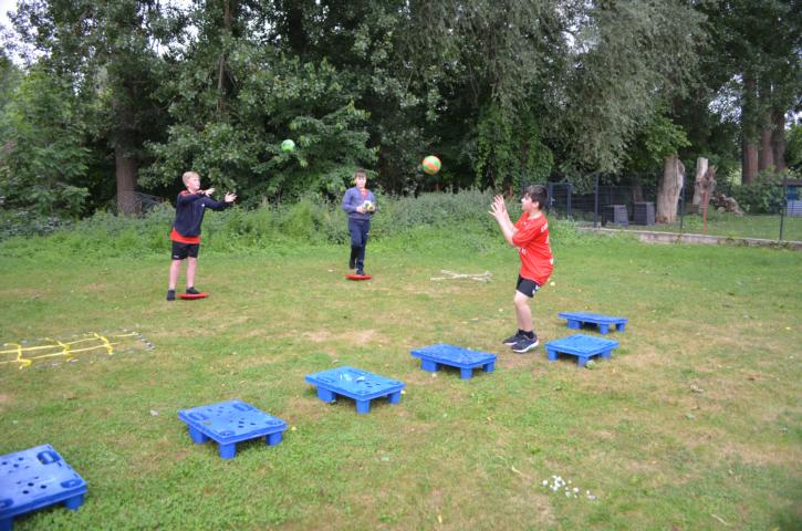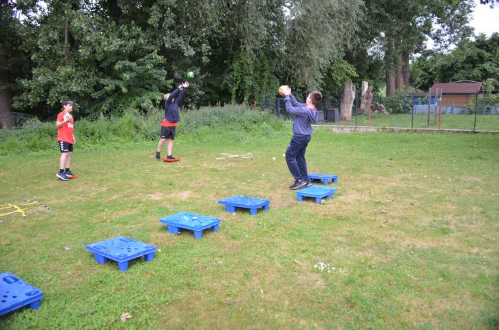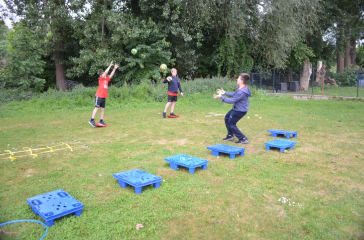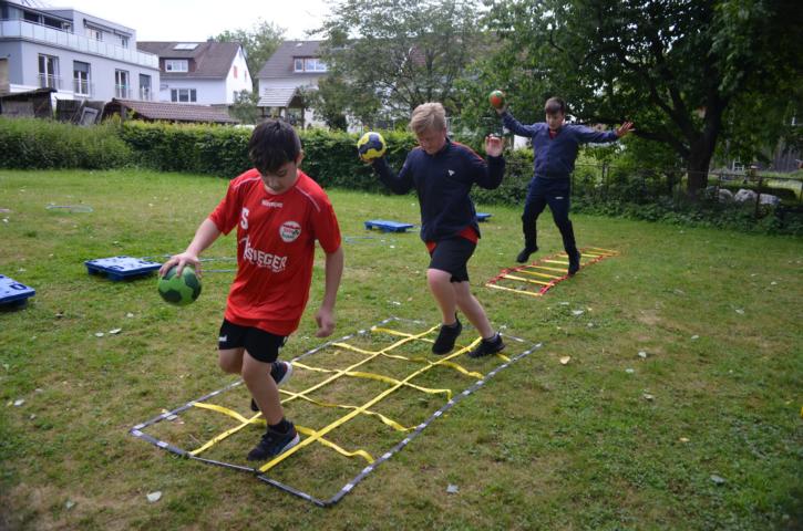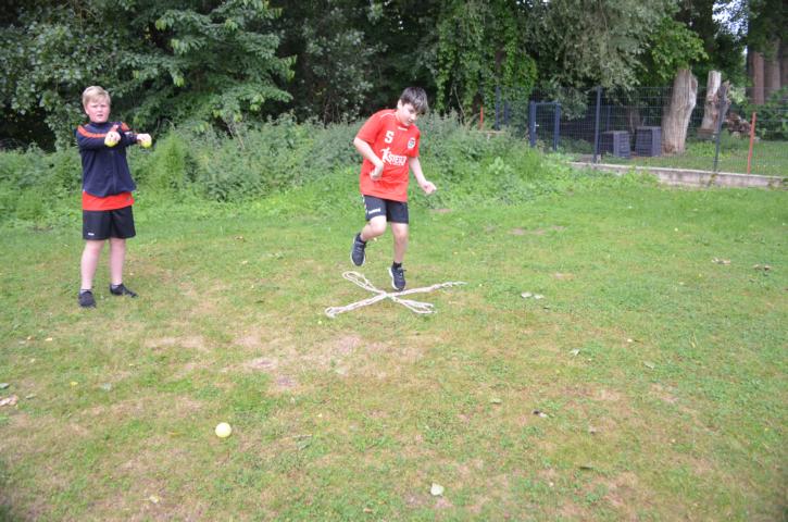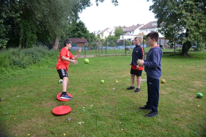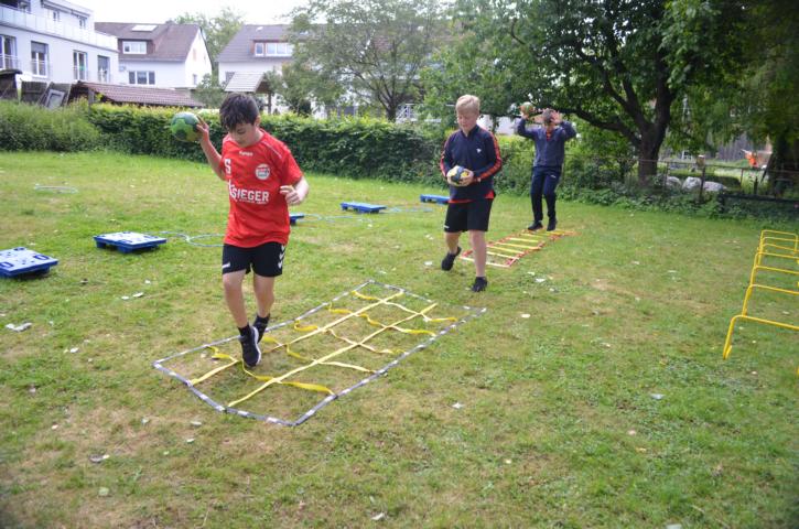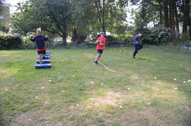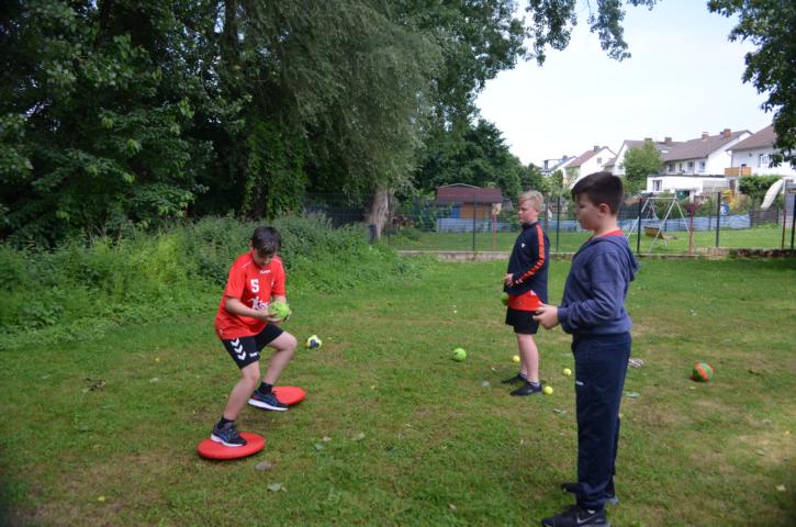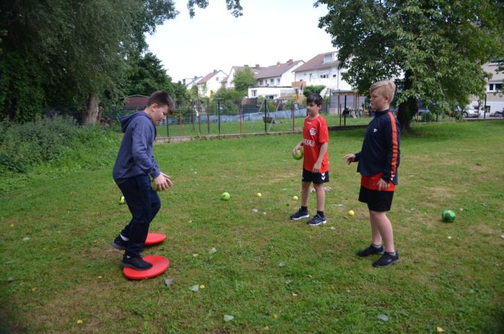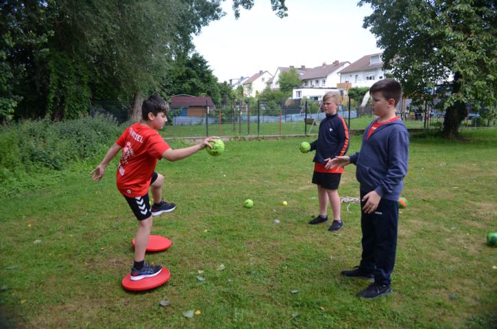 Zum Einsatz kommen heute neben kleinen Handbällen auch Tennisbälle. Der Tennisball ist ein kostengünstiges Spiel- und Sportobjekt mit vielseitigen Möglichkeiten. Wegen seines geringen Gewichts aber dafür guter Griffigkeit eignet er sich sehr gut für die Schulung koordinativer Fähigkeiten. Ich setze ihn heute u.a. beim Jonglieren ein. Auf den Bildern ist sehr gut zu erkennen, dass es anfangs Schwierigkeiten bereitet, zwei Tennisbälle gleichzeitig zu kontrollieren. Im weiteren Verlauf der Übungen funktioniert es aber immer besser und am Ende klappt es doch schon ganz gut. Eine weitere Herausforderung stellen die beiden Koordinationsleitern (einfach und dreifach) dar. Hier ist Rhythmusgefühl gefragt und die Orientierungsfähigkeit. Viele verschiedene Schrittfolgen müssen hier koordiniert werden. Die kleinen Hürden bereiten noch so manche Probleme, vor allem beim seitlichen Überspringen. Hier fehlt eine fließende Bewegung, die Kinder bremsen vor der Hürde ab und verlieren den Schwung. Viele Wiederholungen sorgen aber dafür, dass die Kinder bald ihren Rhythmus finden und es eine fließende Bewegung gibt. Auf den Steppbrettern gilt es, Sprünge zu variieren. Auf dem ersten Steppbrett wird beidbeinig gelandet, auf den Boden dann mit dem rechten Fuß gelandet und abgesprungen, um auf dem zweiten Steppbrett dann wieder beidbeinig zu landen. Danach wird auf dem Boden mit dem linken Bein gelandet und abgesprungen, um auf dem dritten Steppbrett wieder beidbeinig zu landen, etc. Das erfordert neben Rhythmusgefühl und Sprungkraft auch höchste Konzentration.