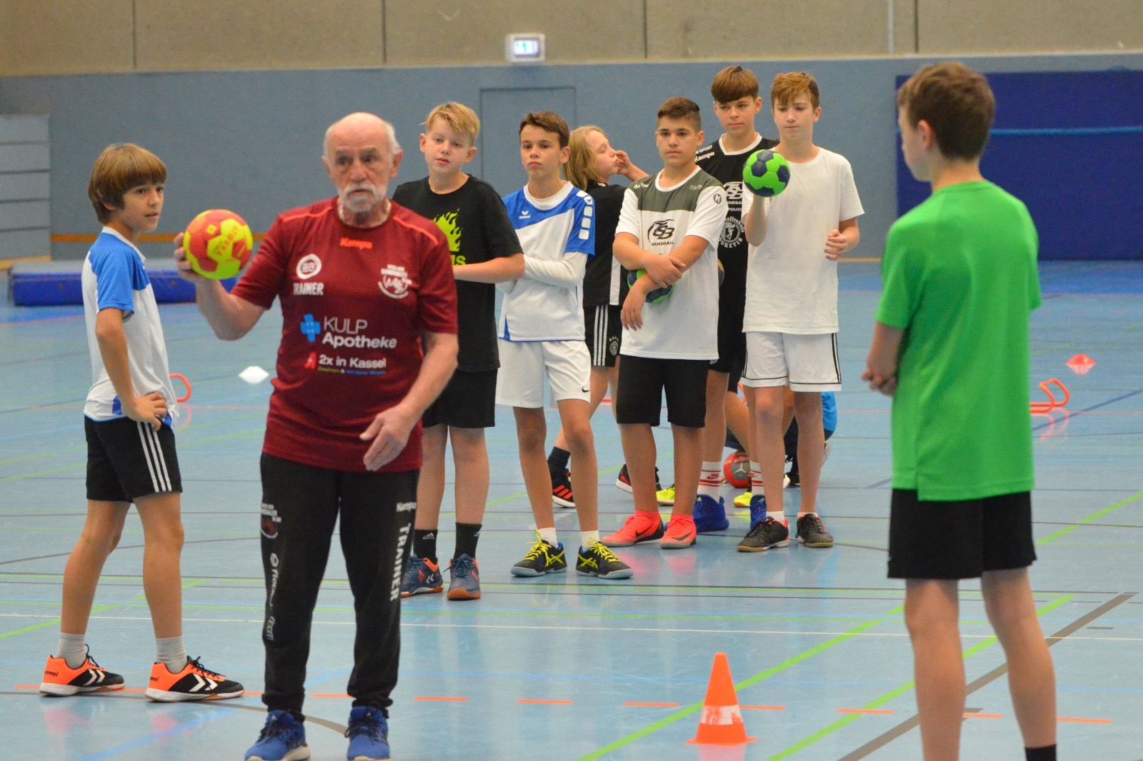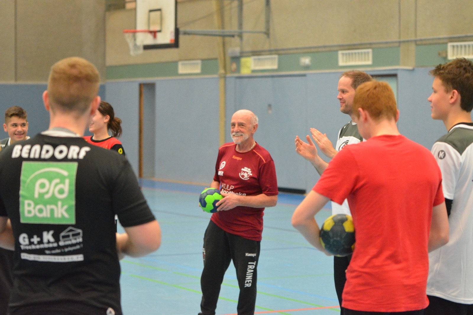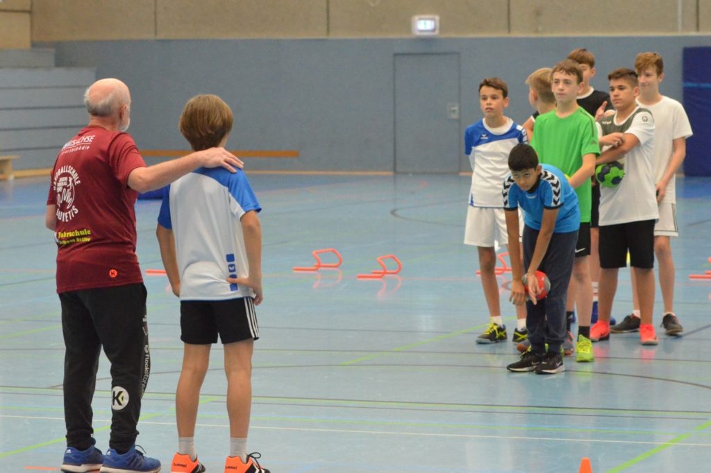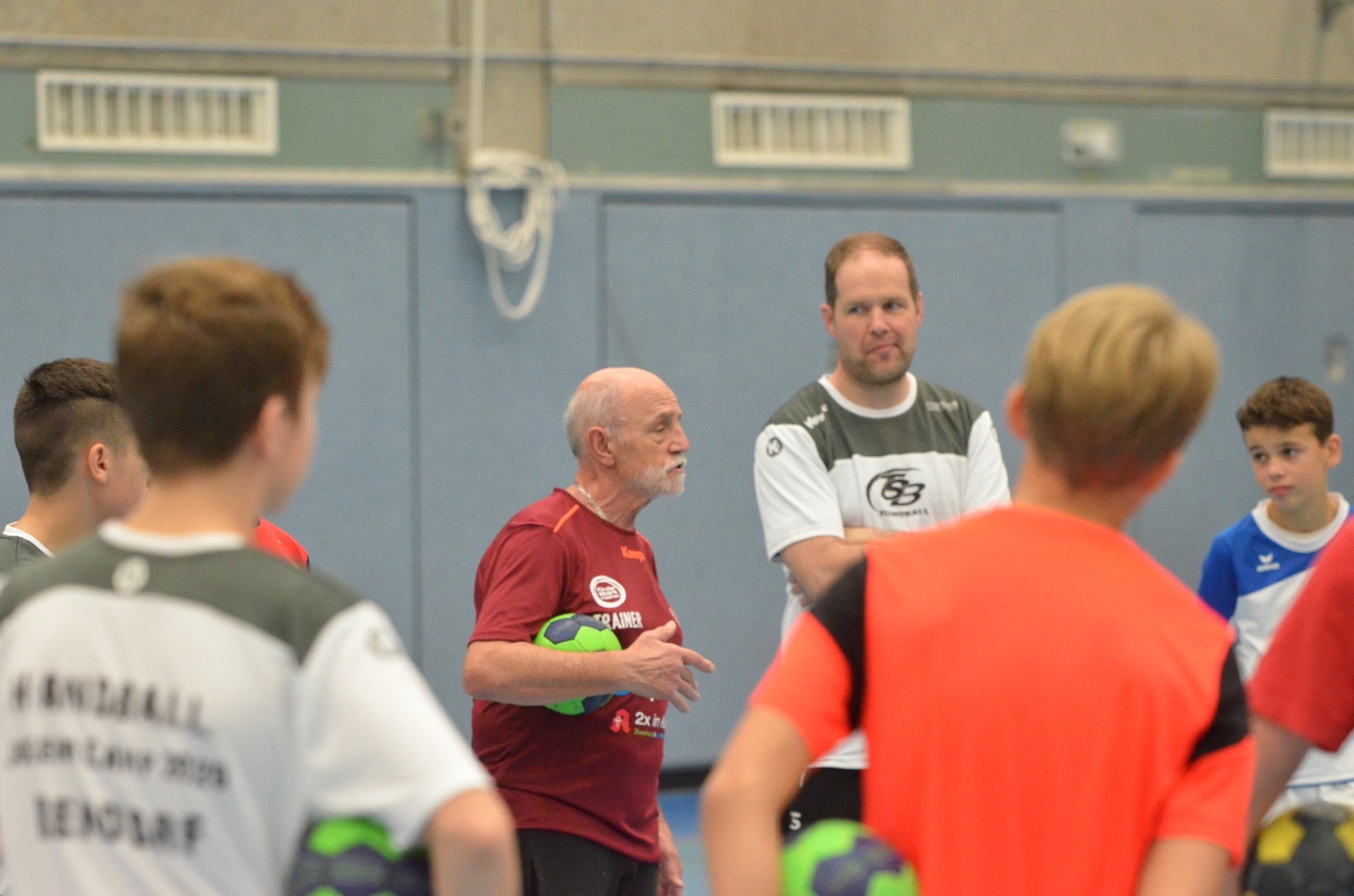Nach kurzer Pause beginnen wir schon mit der 2. Trainingseinheit, in der ich den Kindern meine Art Handballball zu spielen näher bringen möchte. Viele verschiedene Arten von Spielkombinationen gepaart mit einigen technischen Raffinessen kommen bei den Kids besonders gut an. Sie kommen gar nicht mehr aus dem Staunen heraus, als ich die Übungen voller Euphorie selbst vormache. Mir machen sie ja auch total viel Spaß. Da merkt man mir die 68 Jahre wirklich nicht an, ich bin wieder jung und stolz, dass die Nachwuchshandballer aufmerksam zuschauen und versuchen, die Übungen und so manche technische Raffinesse nachzumachen. Es werden kombinierte Komplexübungen gemacht, wobei die Spieler von allen Positionen zum Torwurf gebracht werden. Es wird gekreuzt, 1 gegen 1 gespielt, Übergänge mit und ohne Ball gelaufen und abschließend auf’s Tor geworfen. Die Kids zeigen keine Müdigkeit und machen voller Freude die Übungen. Alle gelungenen Aktionen werden sogar von den „heimischen“ Trainern mit Applaus belohnt.