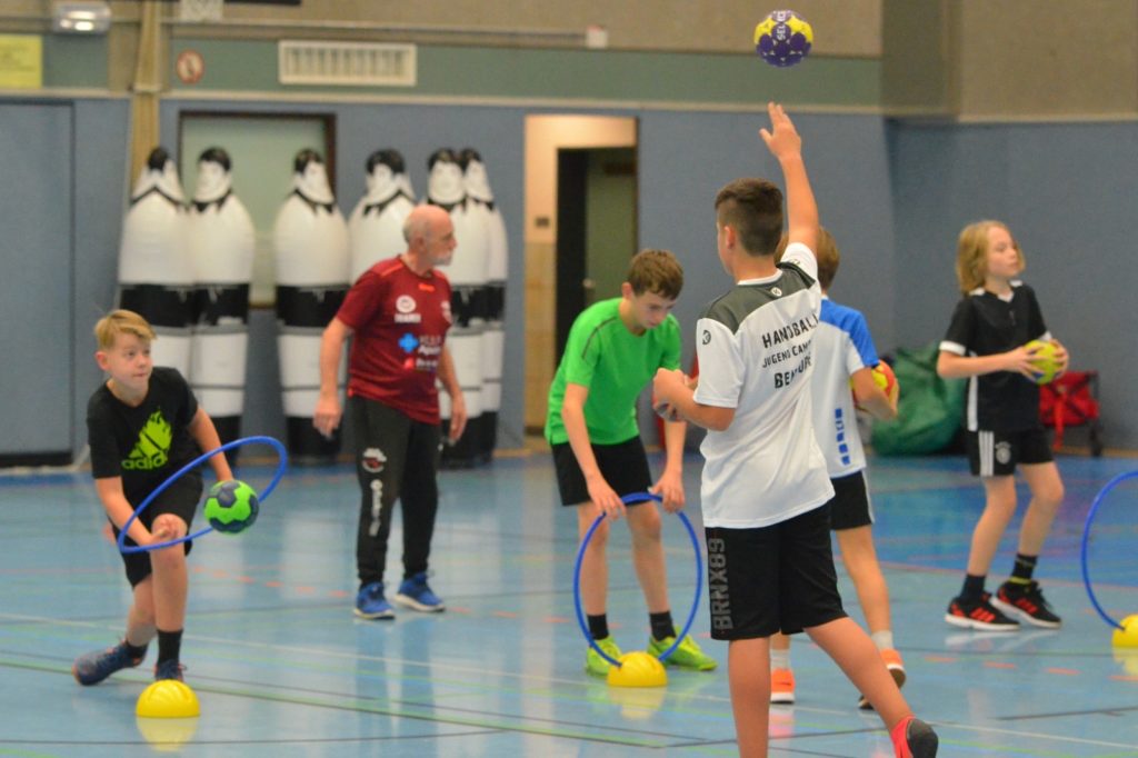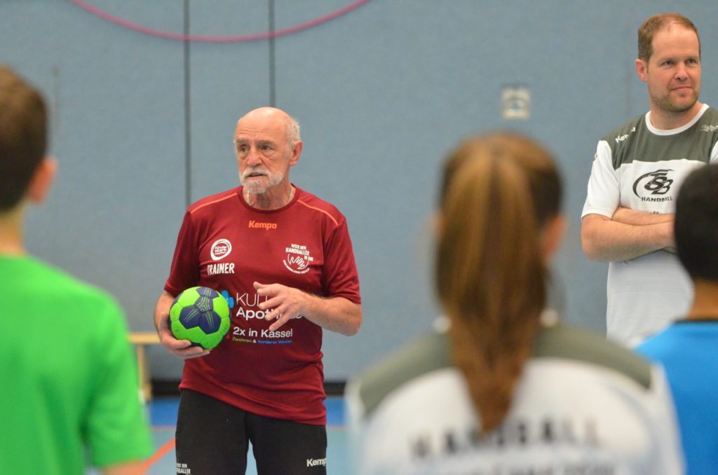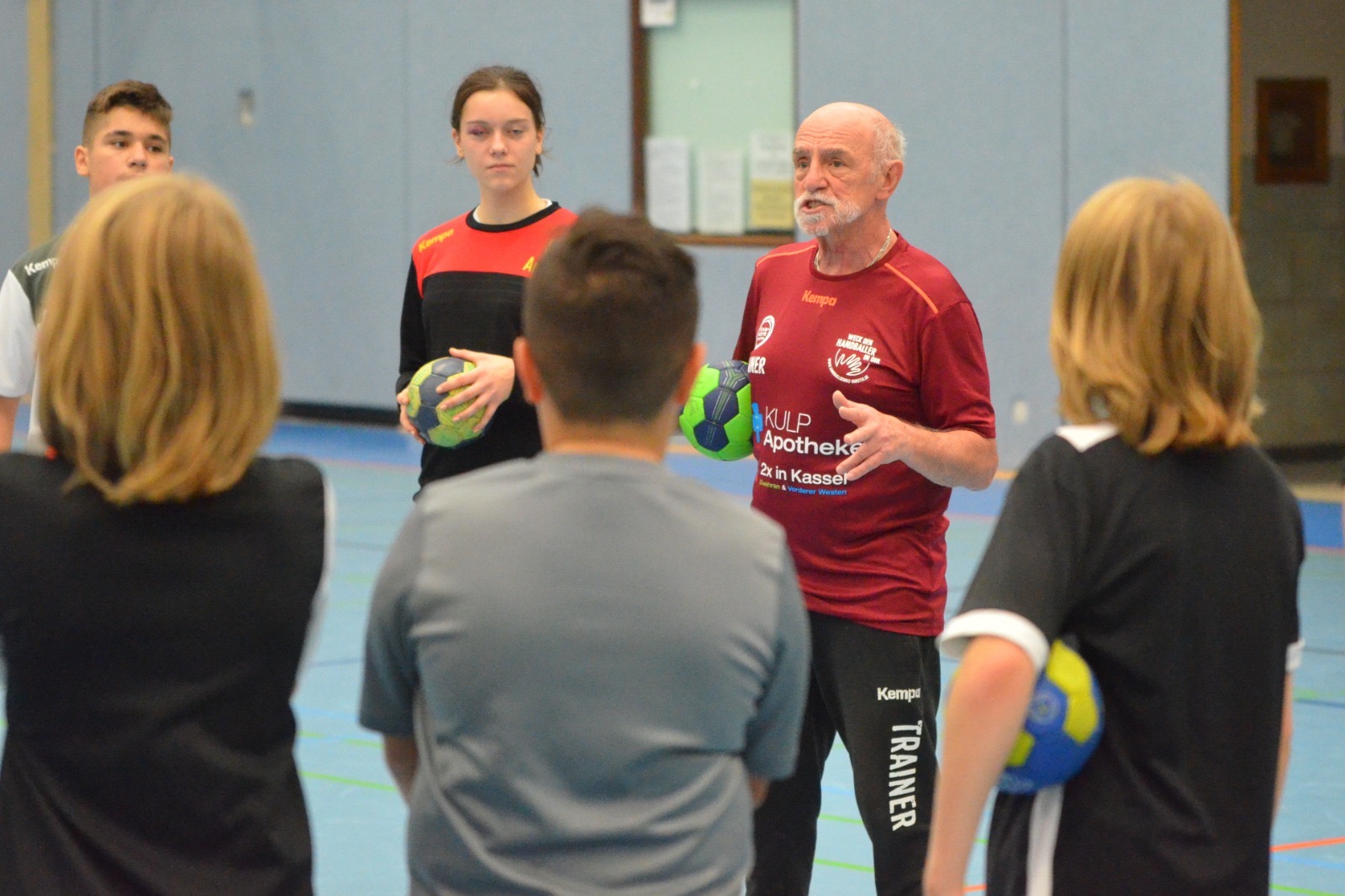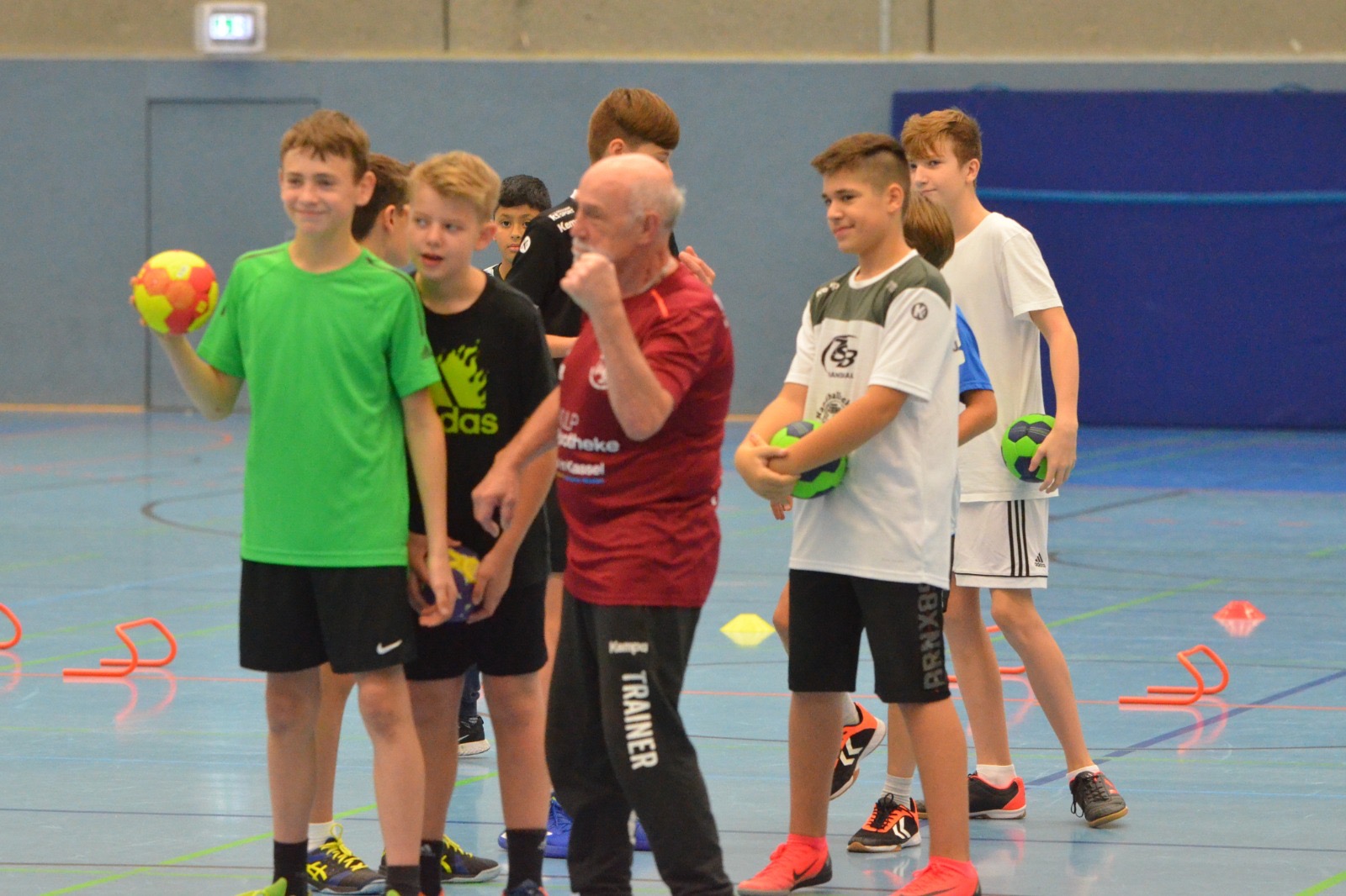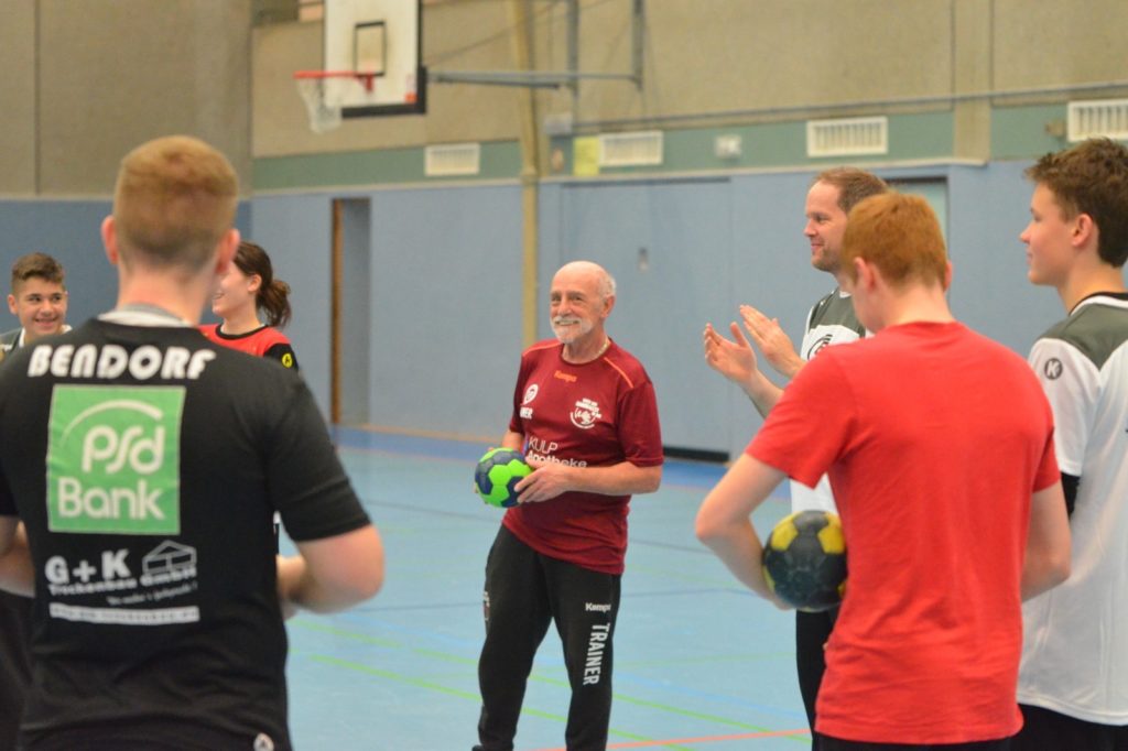 Nach kurzer Pause beginnen wir schon mit der 2. Trainingseinheit, in der ich den Kindern meine Art Handballball zu spielen näher bringen möchte. Viele verschiedene Arten von Spielkombinationen gepaart mit einigen technischen Raffinessen kommen bei den Kids besonders gut an. Sie kommen gar nicht mehr aus dem Staunen heraus, als ich die Übungen voller Euphorie selbst vormache. Mir machen sie ja auch total viel Spaß. Da merkt man mir die 68 Jahre wirklich nicht an, ich bin wieder jung und stolz, dass die Nachwuchshandballer aufmerksam zuschauen und versuchen, die Übungen und so manche technische Raffinesse nachzumachen. Es werden kombinierte Komplexübungen gemacht, wobei die Spieler von allen Positionen zum Torwurf gebracht werden. Es wird gekreuzt, 1 gegen 1 gespielt, Übergänge mit und ohne Ball gelaufen und abschließend auf’s Tor geworfen. Die Kids zeigen keine Müdigkeit und machen voller Freude die Übungen. Alle gelungenen Aktionen werden sogar von den „heimischen“ Trainern mit Applaus belohnt.