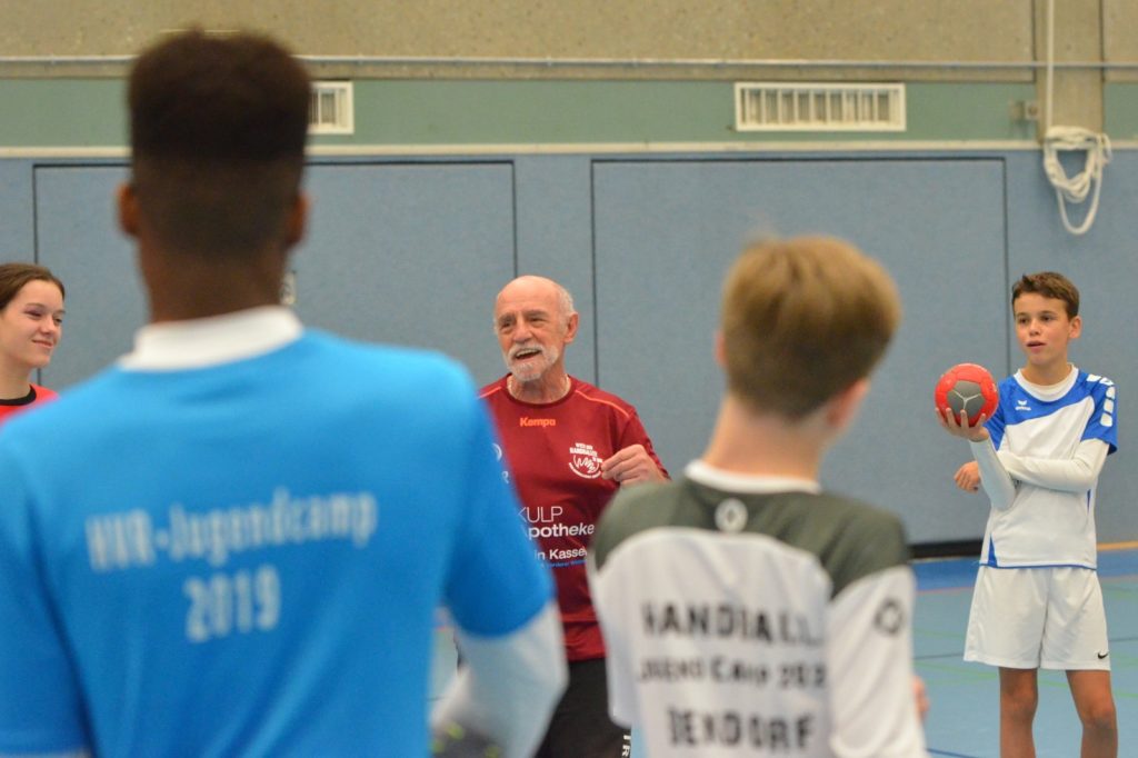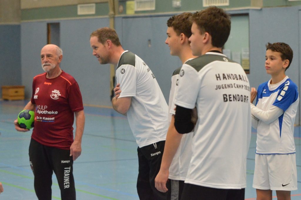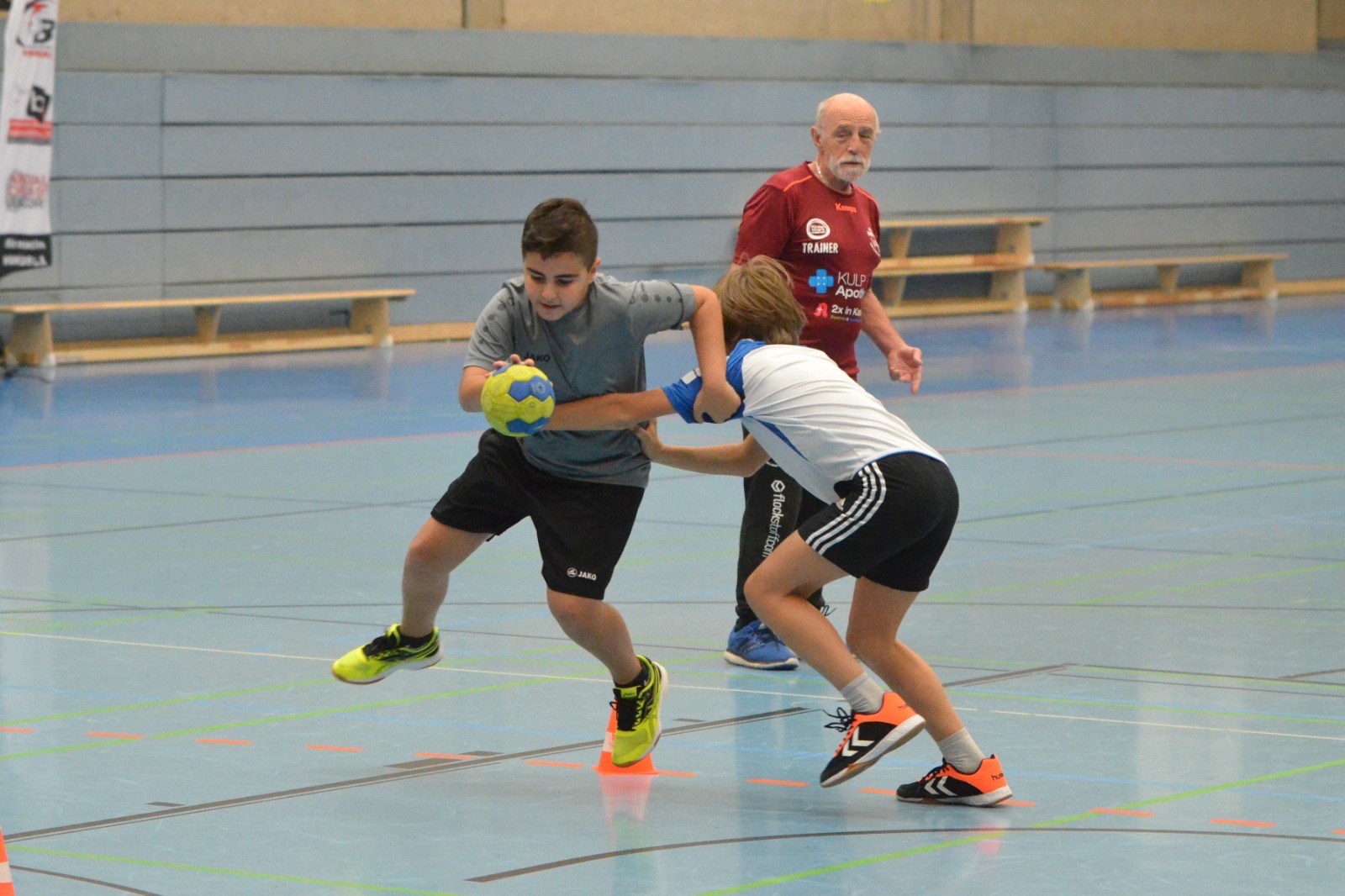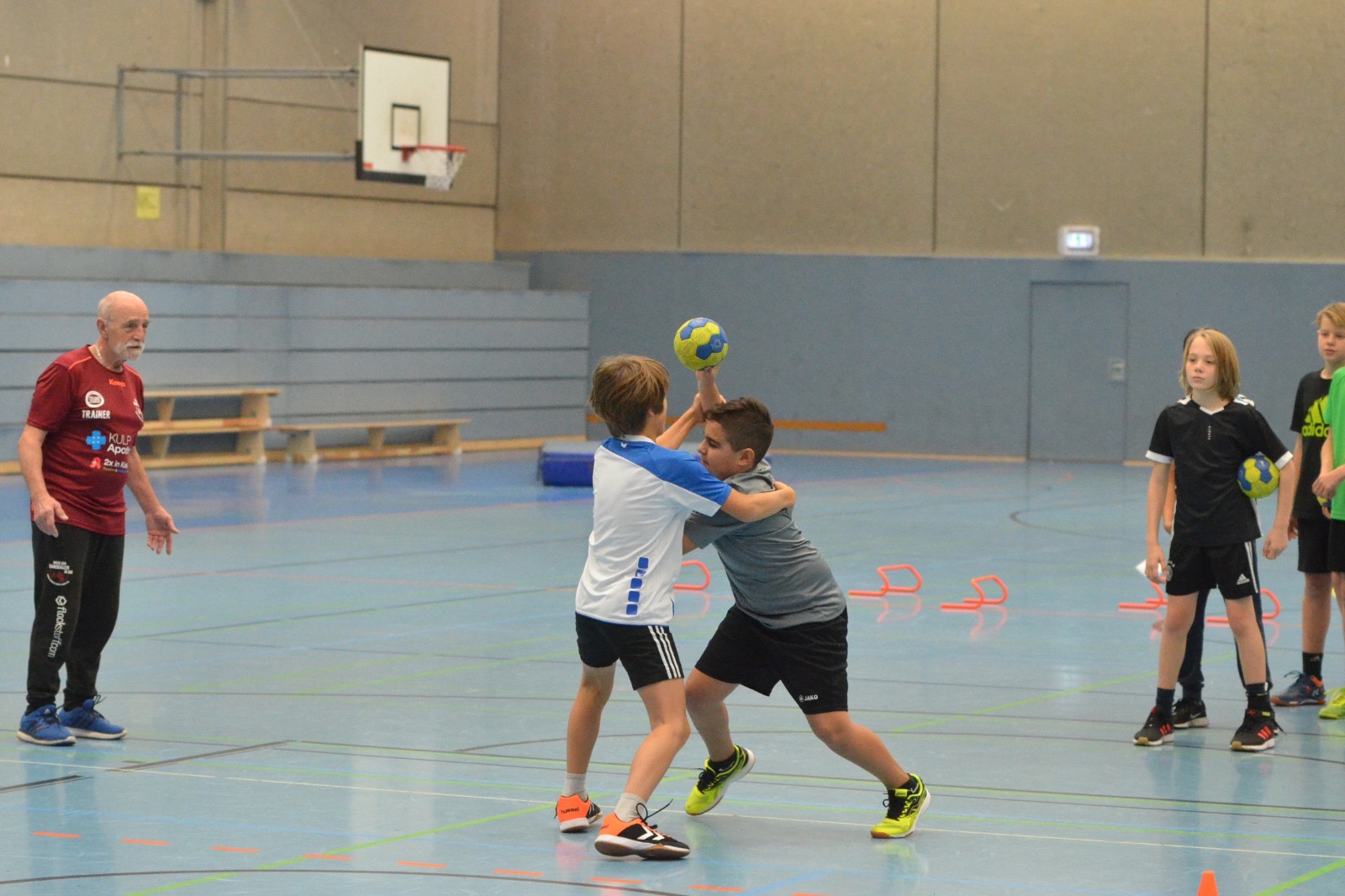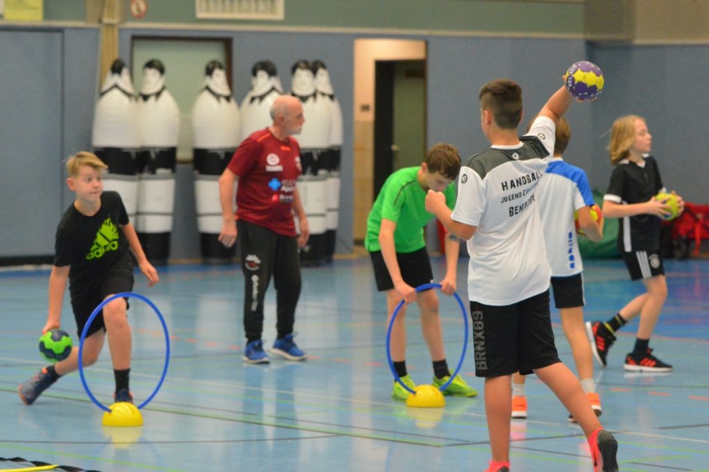 Nach kurzer Pause beginnen wir schon mit der 2. Trainingseinheit, in der ich den Kindern meine Art Handballball zu spielen näher bringen möchte. Viele verschiedene Arten von Spielkombinationen gepaart mit einigen technischen Raffinessen kommen bei den Kids besonders gut an. Sie kommen gar nicht mehr aus dem Staunen heraus, als ich die Übungen voller Euphorie selbst vormache. Mir machen sie ja auch total viel Spaß. Da merkt man mir die 68 Jahre wirklich nicht an, ich bin wieder jung und stolz, dass die Nachwuchshandballer aufmerksam zuschauen und versuchen, die Übungen und so manche technische Raffinesse nachzumachen. Es werden kombinierte Komplexübungen gemacht, wobei die Spieler von allen Positionen zum Torwurf gebracht werden. Es wird gekreuzt, 1 gegen 1 gespielt, Übergänge mit und ohne Ball gelaufen und abschließend auf’s Tor geworfen. Die Kids zeigen keine Müdigkeit und machen voller Freude die Übungen. Alle gelungenen Aktionen werden sogar von den „heimischen“ Trainern mit Applaus belohnt.