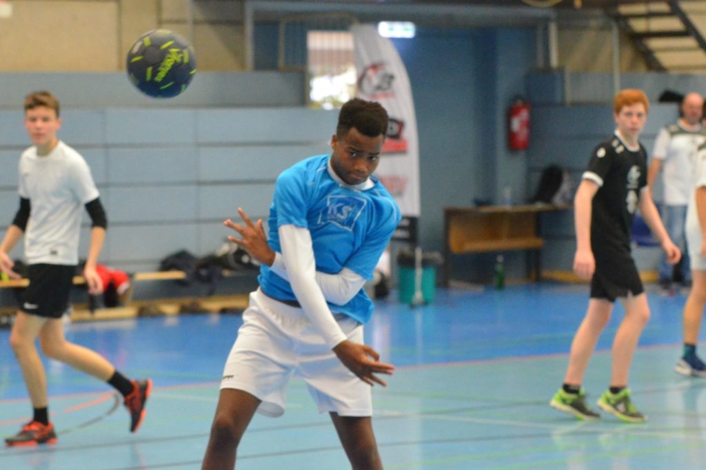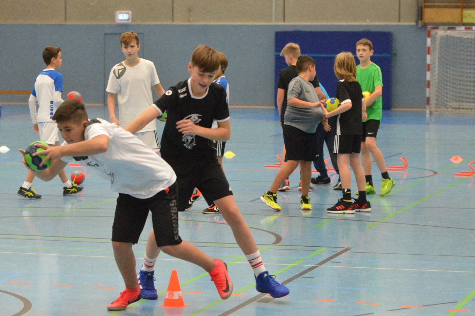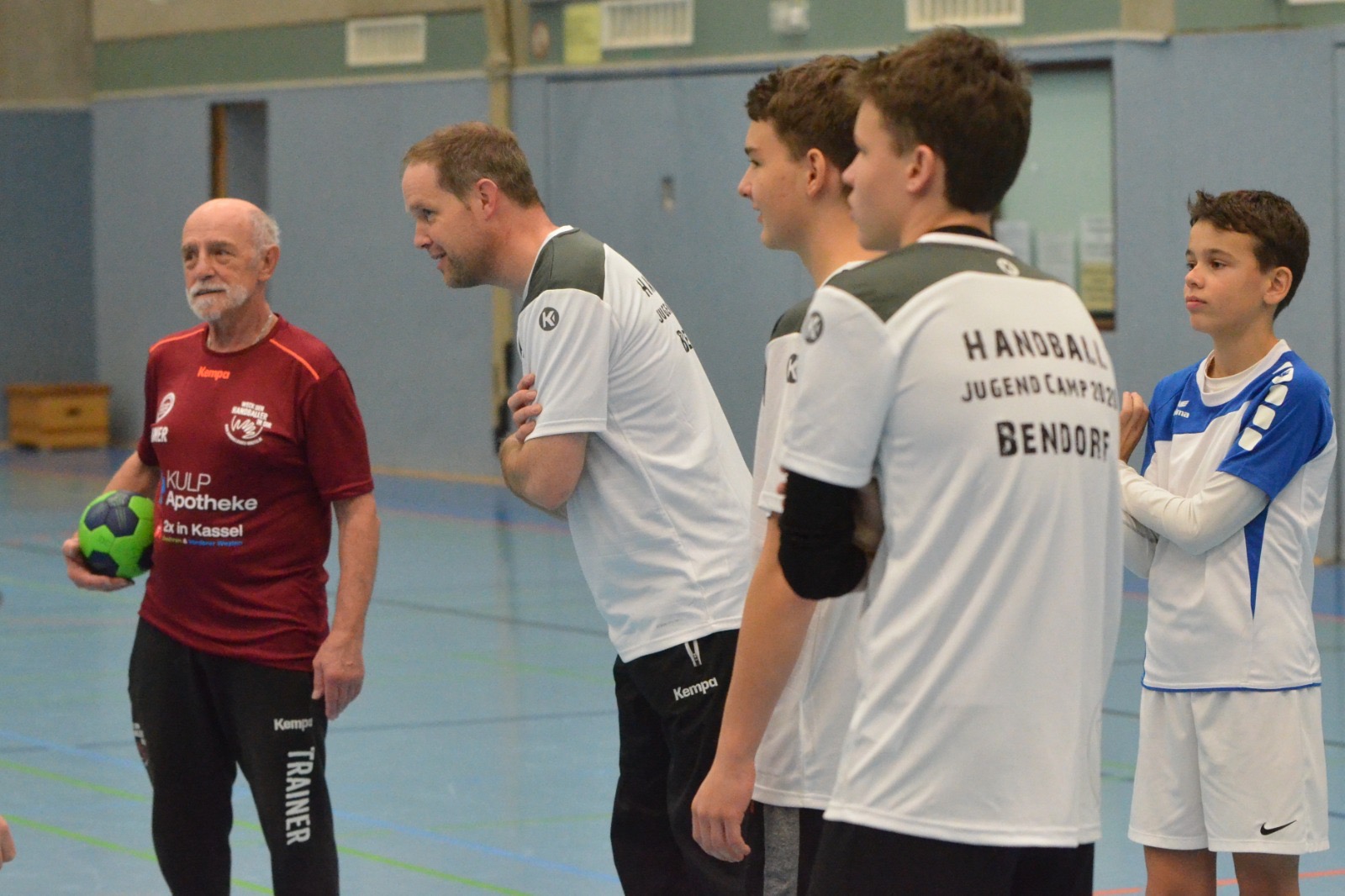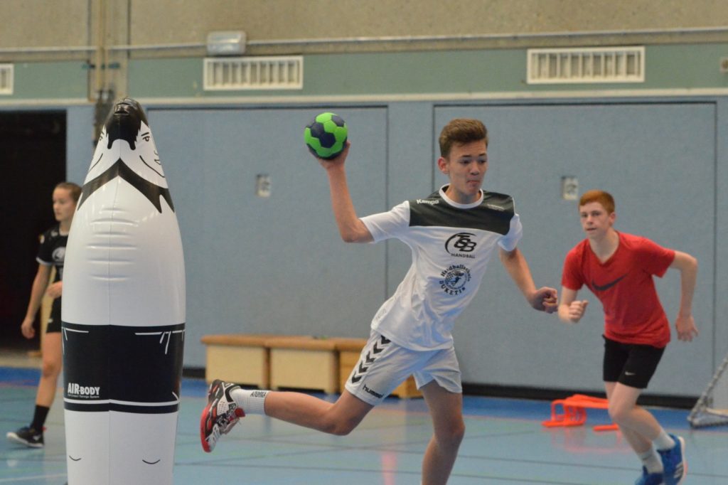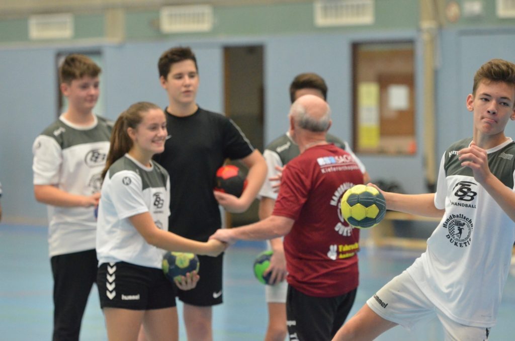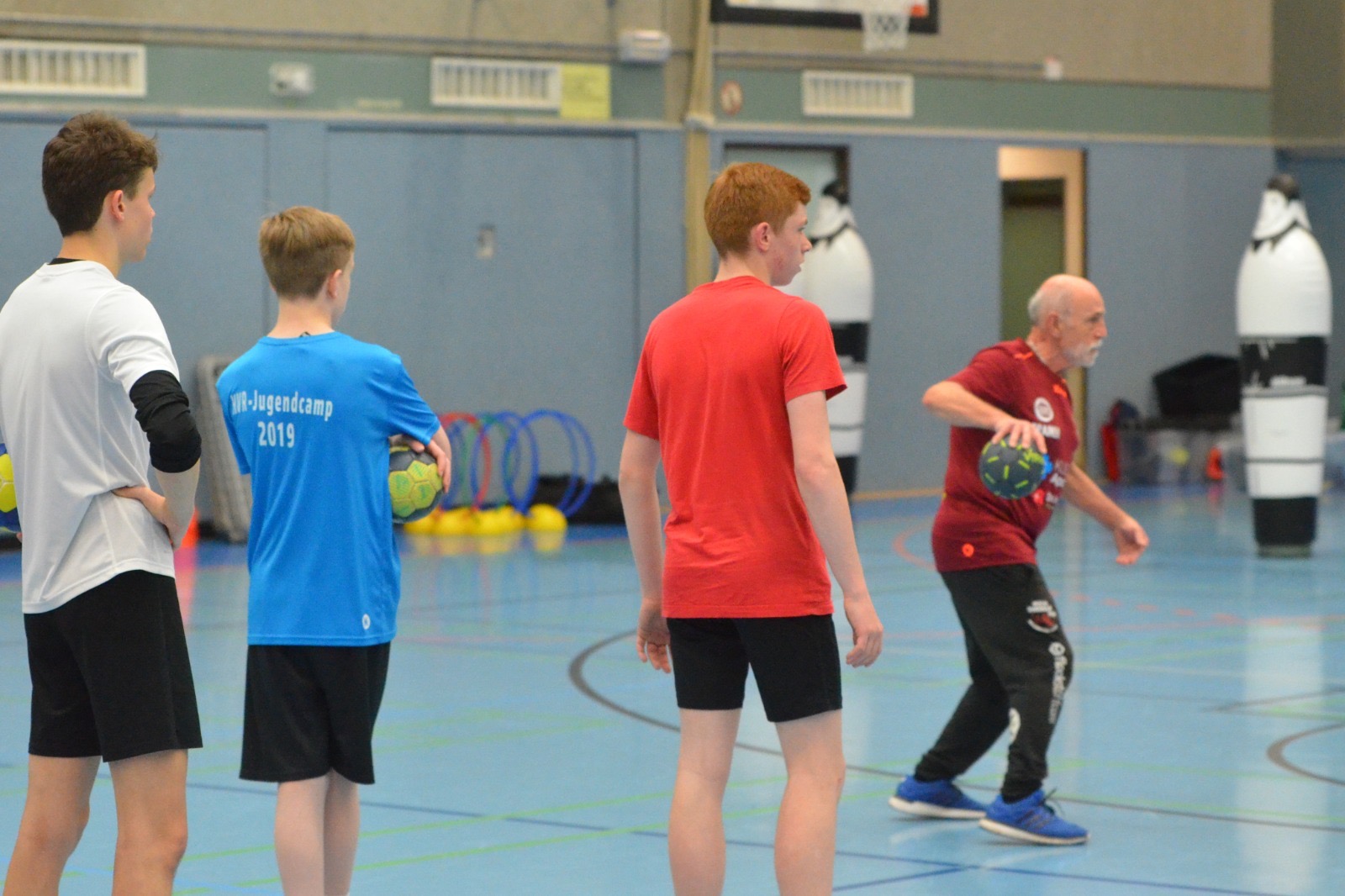 Im 1. Training des Tages von 09:00-10:30 Uhr wollen wir die festgestellten Defizite in der individuellen Abwehrarbeit reduzieren. Das sind z.B.: falsche Stellung zum Gegner, zu passives Verhalten, fehlende Aggressivität etc. Zunächst spreche ich die Jugendlichen an, dass es im Handball nicht allein darum geht, Tore zu werfen, sondern mindestens genauso wichtig ist ja auch das Tore verhindern. Während das Torewerfen richtig viel Spaß macht, ist oft die Abwehrarbeit bei den Kids uncool, langweilig und wenig attraktiv. Aber damit ist nun Schluss. Ich bringe die Expander und Bungeegurte ins Spiel und schon sind die Nachwuchshandballer mit ganzer Aufmerksamkeit bei der Sache. Der Ehrgeiz ist geweckt und die Abneigung gegen Abwehrarbeit ist wie weggefegt.