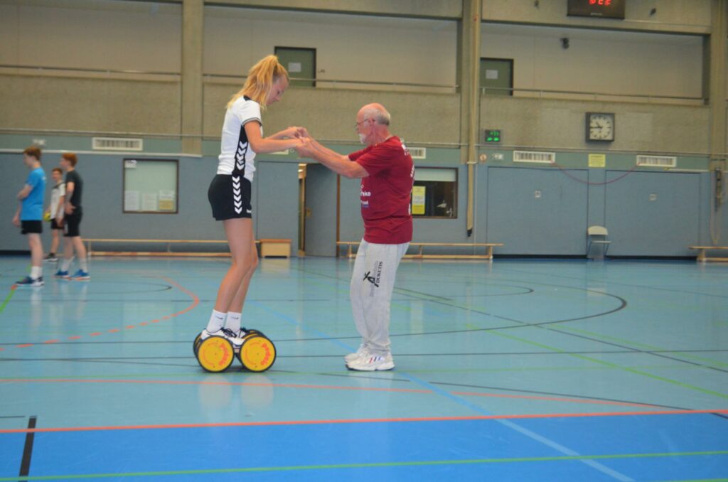Am zweiten Tag des Handballcamps geht es gleich in der ersten Trainingseinheit um Koordination. Hier kommen Hürden, Reifen und Seile zum Einsatz, um verschiedene Schrittkombinationen zu trainieren. Auch darf die Koordinationsleiter nicht fehlen. Alle Muskelpartien werden dabei beansprucht. Ich freue mich über die Unterstützung von vielen Jugendtrainern sowie des Trainers von der 1. Mannschaft von TS Bendorf. Dieser bringt die Blackrolls zum Einsatz. Es wird genau erklärt, wie man damit umgehen soll und für was das gut ist. Sie sind z.B. ideal zur Verbesserung der Beweglichkeit und Behandlung schmerzhafter Muskelverhärtungen. Im Anschluss übernehme ich die nächste Einheit mit den Pedalos. Klar braucht es seine Zeit, dieses tückische Gerät zu beherrschen, aber sobald man den „Dreh raushat“, kann man weitere Steigerungen einbauen. Der Handball wird hinzugenommen und jetzt versucht, während des Pedalofahrens den Ball zu prellen, zu passen, zu fangen etc. Trainiert wird hier an der Körperbeherrschung und an der Balance. Gegenseitiges Helfen erleichtert die Aufgaben und schon bald klappen die Übungen richtig gut. Danach soll das Abwehrverhalten im Spiel 1 gegen 1 mit Körperkontakt in drei Trainingsgruppen mit dynamischem Heraustreten geübt werden. Hier geht es ordentlich zur Sache und die Mädels schonen die Jungs genauso wenig, wie umgekehrt. Abwehrarbeit in kleinen Gruppen ist wichtig für die Abstimmung im Abwehrverband. Nachdem alle gut aufgewärmt und vorbereitet sind, wird die 3:2:1-Deckung geübt. O ja, diese Abwehrformation verlangt eine gute Beinarbeit und Kondition. Das Zusammenspiel bzw. die Absprache zwischen Vorgezogenem und Abwehrmitte muss gut funktionieren, um entstandene Lücken schnell zu schließen und bei Übergängen des Gegners muss das Übergeben/Übernehmen perfekt klappen. Durch verschiedene Komplexübungen, kann man dieses Abwehrsystem gut trainieren. Zur Freude der Kids stehen nun Wurfserien von verschiedenen Positionen auf dem Programm. Nach dem Mittagessen werden dann die Mannschaften gebildet, um unser traditionelles Abschlussturnier zu starten. Es ist toll zu sehen, mit welcher Begeisterung alle dabei sind. Ich kann von der Seite zuschauen und bin sehr stolz, wie schnell diese Jugendlichen ihre eingeübte Wurftechnik und die hart trainierte Abwehrarbeit sogleich umsetzen. So, nun heißt es, Abschied nehmen. Zuvor, wie es sich gehört, packen alle gemeinsam meine Trainingsgeräte in den Anhänger. Es fällt mir jedes Mal schwer loszufahren, aber dieses Mal weiß ich ja, dass bis zum nächsten Wiedersehen nicht viel Zeit vergehen wird, denn schon im Herbst, vom 22.-24.10.21 komme ich wieder, wenn es heißt: Power-Handballcamp in Bendorf mit Chef-Coach Iljo Duketis. – Also: bis bald!