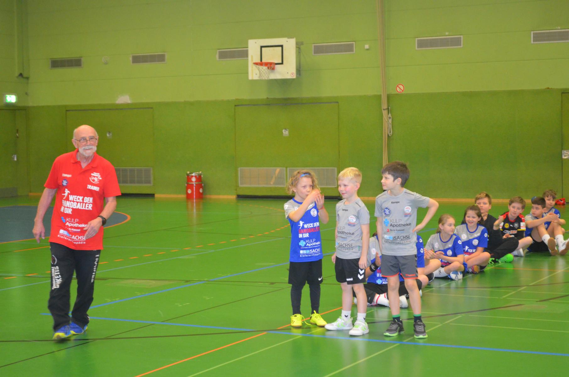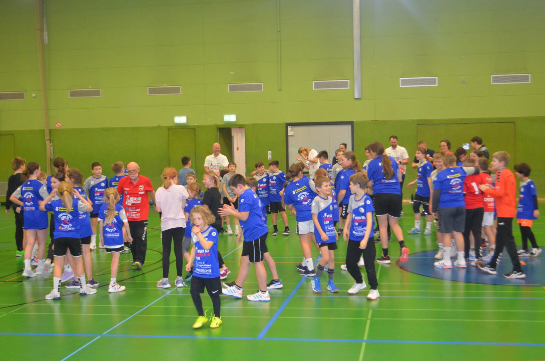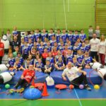 Wie es sich gehört, bin ich immer der Erste in der Sporthalle. Damit wir keine Zeit verlieren, verteile ich schon jetzt die Geräte für das Aufwärmprogramm in der Sporthalle. Dann werden den inzwischen eingetroffenen Kids die Erinnerungs-Shirts übergegeben, damit das Fotoshooting professionell durchgeführt werden kann. Das verläuft reibungslos, denn ich habe eine genaue Vorstellung davon, wer wo zu stehen hat, damit das Foto optisch perfekt wird. Beim Aufwärmtraining kommen handballspezifische Elemente zum Tragen, die für unser Handballspiel sehr wichtig sind. Danach übernimmt jeder Trainer seine Gruppe. Hermi und ich übernehmen die jüngeren Handballkids, wobei meine Gruppe mit Luftballons und Tennisbällen arbeitet und Hermi trainiert schon mehr handballspezifisch, insbesondere Wurftraining mit Zielvorgabe. Janka ist schon voll in ihrem Element mit der Obelix-Gruppe. Hier kommen die kleinen Gewichte, Medizinbälle und Bungeegurte zum Einsatz. Milan übt mit der Asterix-Gruppe das richtige Abwehrverhalten, wobei es um die richtige Schrittfolge geht. Dann wird das individuelle Spiel 1gegen1 geübt. Von Müdigkeit keine Spur, alle Gruppen trainieren sehr konzentriert. Erwähnenswert wäre noch, dass 5 Torleute mit dabei sind, also kommt auch das individuelle Torwarttraining nicht zu kurz. Bevor die Gruppen gewechselt werden, steht die Obstpause an, wo die Kids kräftig zulangen. Ja, das Vormittagstraining geht schnell vorüber und bevor es nun zum Mittagsessen geht, bilde ich noch 6 Mannschaften für das traditionelle Abschlussturnier, welches um 15:00 Uhr startet. Die Eltern, Geschwister und Freunde waren eingeladen, die Kinder bei den Spielen zu unterstützen. Es wurden sogar Trommeln mitgebracht, die für eine tolle Stimmung sorgen. Als die Mannschaften einlaufen, werden sie mit Applaus überschüttet. Die Zuschauer sehen nun tolle Spiele und das Turnier rundet das gesamte Handballcamp erfolgreich ab. Ich möchte mich bei meinem Trainerteam bedanken, bei den Betreuern, die jede Arbeit gerne übernehmen, bei unserem Küchenpersonal, die an beiden Tagen leckeres Essen vorbereitet haben und bei den Vätern, die mir immer beim Einladen meiner Requisiten in meinen großen Anhänger helfen. Ohne diese vielfältige Unterstützung könnte ein solches Handballcamp mit so vielen Kids nicht durchgeführt werden. Und eins darf ich nicht vergessen: Danke unserem Sponsor von Denn´s Bioladen, „Brachti“, der uns mit frischem Obst und Gemüse bestens versorgt hat. Dann auch ein großes Dankeschön an die Eltern, die meine Arbeit sehr schätzen und ihre Kinder gerne zu mir in Obhut geben. Und zuletzt ein dickes DANKESCHÖN allen Kindern, die mir sehr viel Freude beim Training geben. Ja, liebes Tagebuch, wenn ich ehrlich bin, muss ich gestehen, dass ich ausgepowert, aber trotzdem sehr glücklich bin. Jetzt ist Zeit, das Buch zu schließen. Vorher möchte ich noch darauf hinweisen, dass unser nächstes Handballcamp in den Osterferien wieder auf dem Sensenstein durchgeführt wird. Bis dahin bleibt alle am Ball, viel Erfolg und Freude beim Handballspielen! Bis dahin, euer Trainer