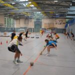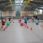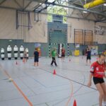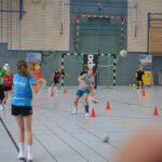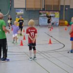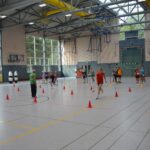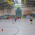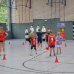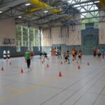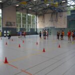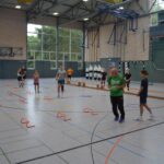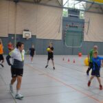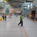 Ein kurzer Überblick über den Tagesplan, und schon geht es los. Wie immer zum Handballcampstart steht mein vorbereiteter Parcours auf dem Programm. So kann ich die individuellen Stärken und Schwächen der Teilnehmer einschätzen und meinen Trainingsplan entsprechend anpassen. Nach dem Aufwärmen geht es direkt zur individuellen Abwehrschulung. Hier merke ich schnell, dass es einiges zu korrigieren gibt – angefangen bei der Körperhaltung über die Schrittfolge bis hin zum frühen Rausgehen aus der Abwehr. Es folgen kleinere Spielformen, vor allem 1-gegen-1-Duelle. Jetzt sind alle langsam auf Betriebstemperatur, und der Ehrgeiz, die Zweikämpfe zu gewinnen, ist geweckt. Danach geht es auch schon zum Mittagessen.