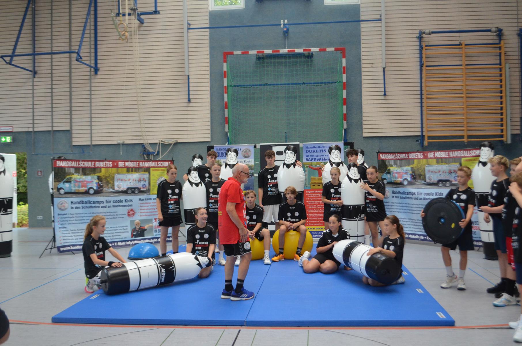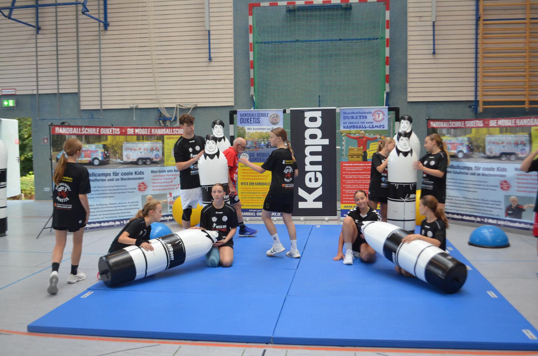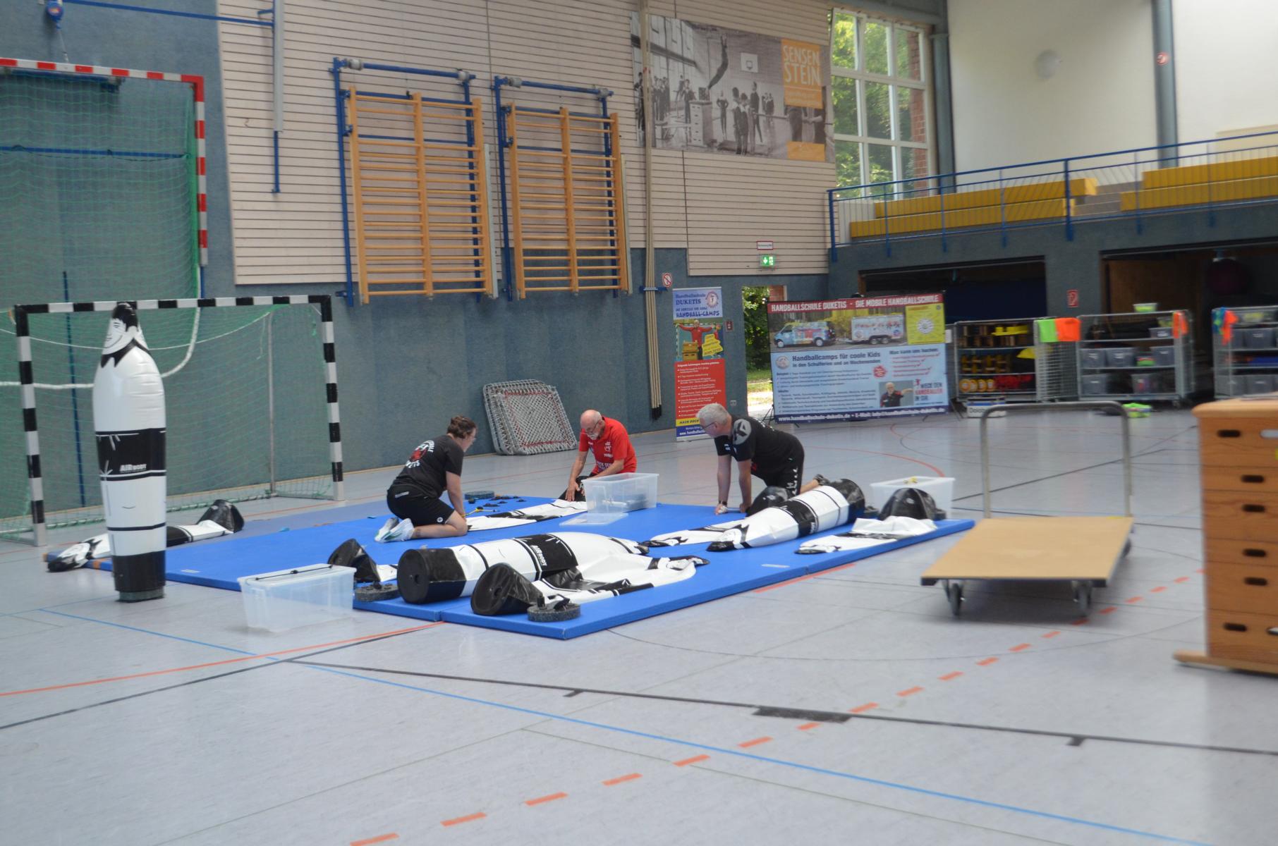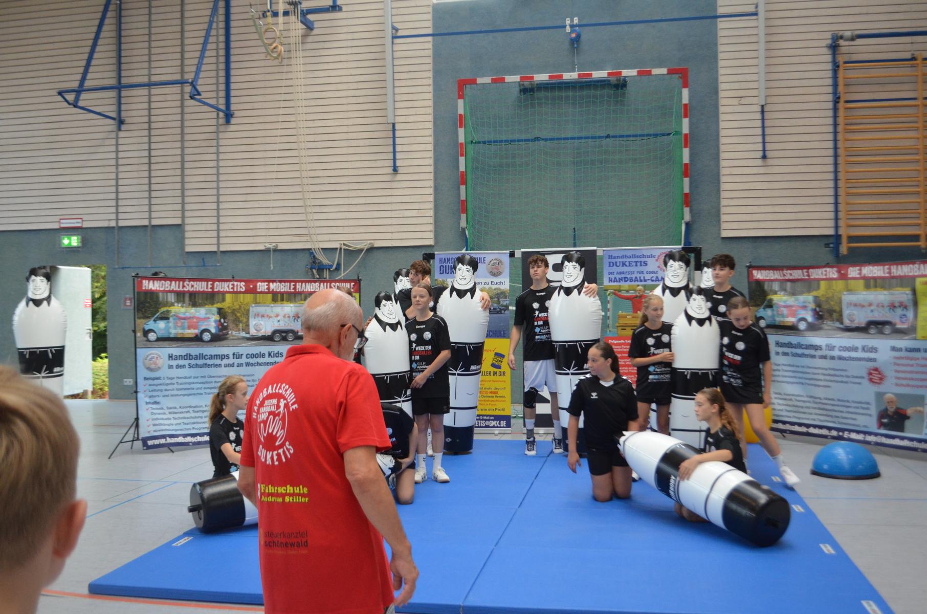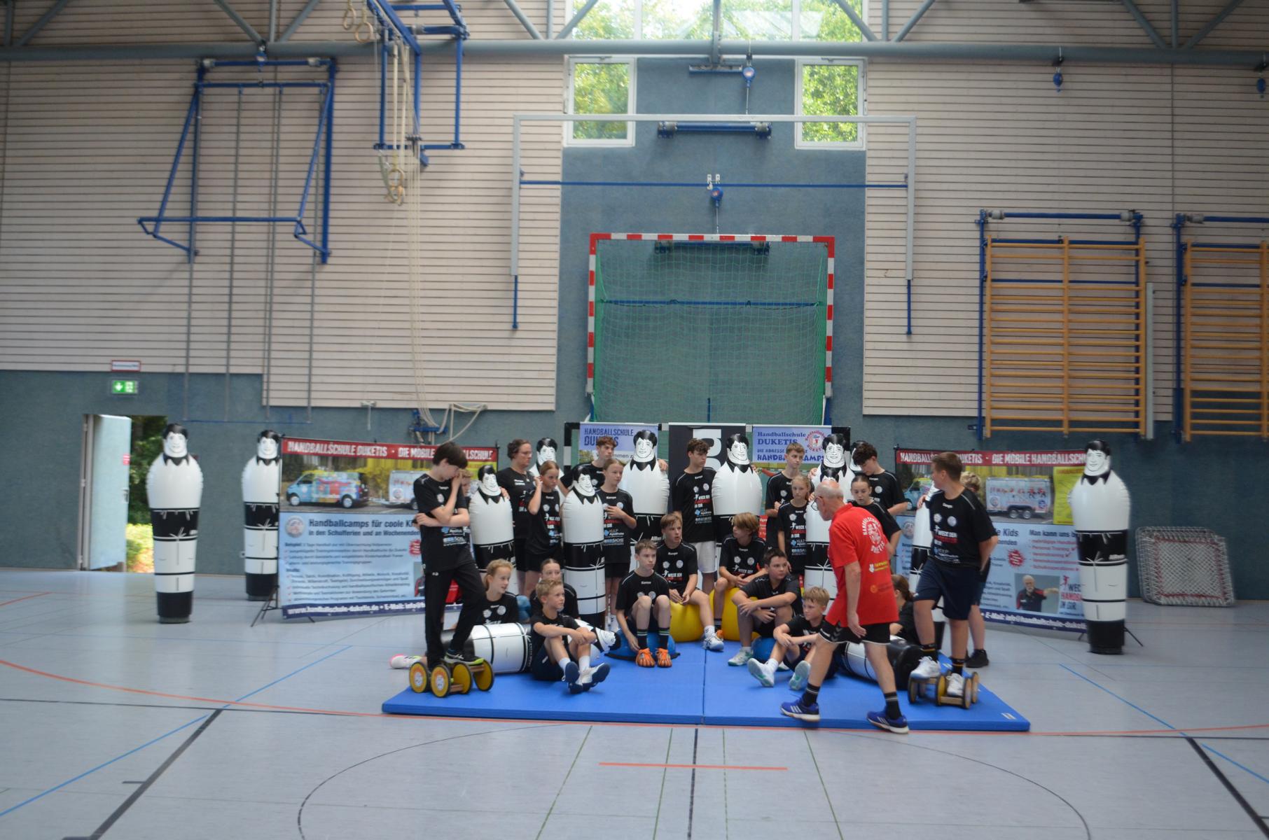 Jetzt steht die letzte Trainingseinheit auf dem Plan. Zum Aufwärmen gibt es Partnerübungen, die nicht nur Arme und Beine, sondern auch Lachmuskeln beanspruchen. Anschließend folgt ein knallharter Handballparcours, der von jedem alles fordert. Spätestens nun merkt man, dass vier Tage voller Training doch ihre Spuren hinterlassen haben. Jetzt geht´s ab zum Fotoshooting. Ich schiebe die Teens von rechts nach links von vorn nach hinten – so lange, bis das Bild perfekt ist. Nun werden die Geräte ordentlich in die Rollwagen gepackt und die AirBuddies sind so glücklich, dass die Luft rausgelassen wird und sie sich ausruhen dürfen. Sie wurden in den letzten Tagen sehr beansprucht, angerempelt und sogar umgestoßen. Davon müssen sie sich bis zum Herbstcamp erst einmal erholen. Zur Belohnung für das schnelle Abbauen und Aufräumen der Geräte gibt es jetzt – Trommelwirbel – das große Abschlussturnier! Die Tribüne ist voll, die Stimmung großartig, und jeder hat nur ein Ziel: zeigen, was man gelernt hat. Es wird gekämpft, gepasst, geworfen und gejubelt. Die Teens hauen großartige Spielzüge raus, als hätten sie heimlich nachts noch extra dafür trainiert.