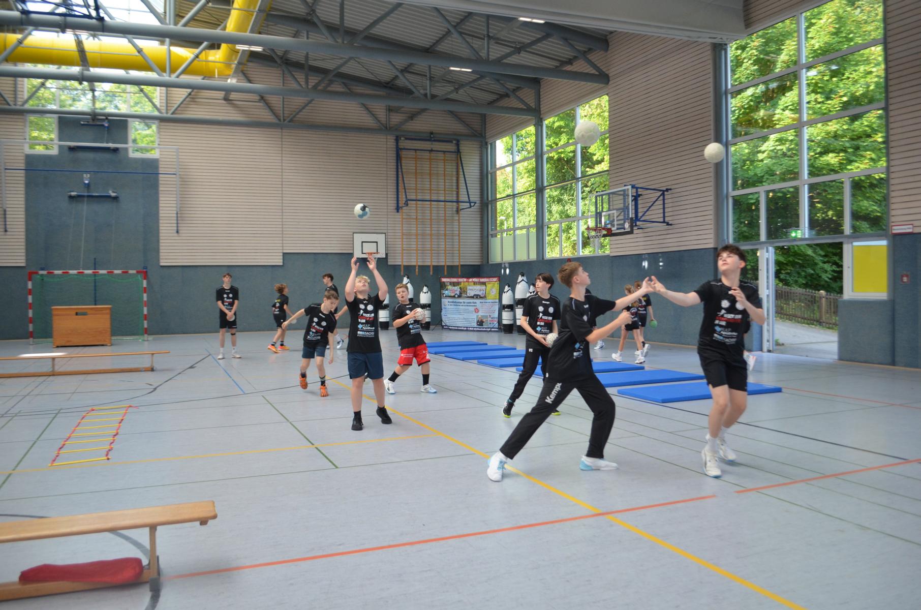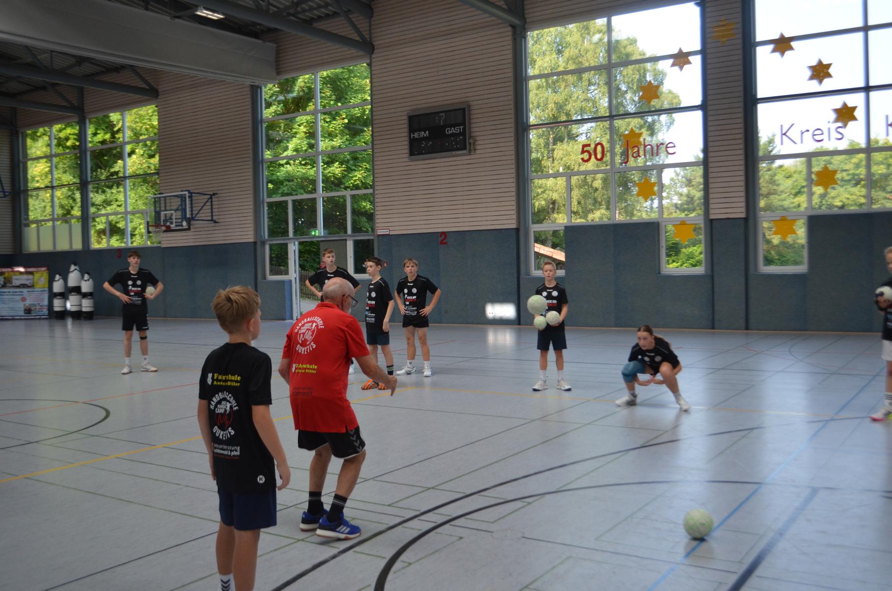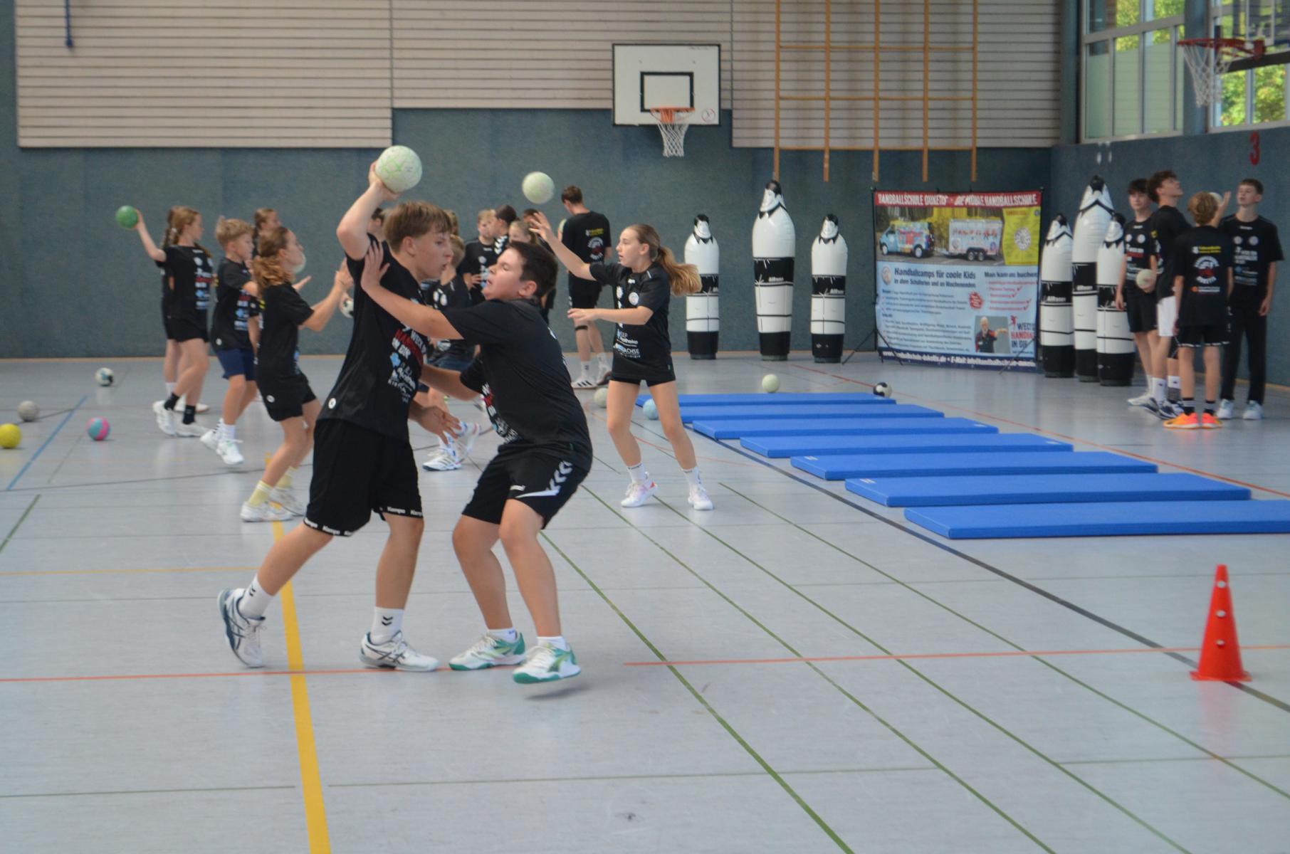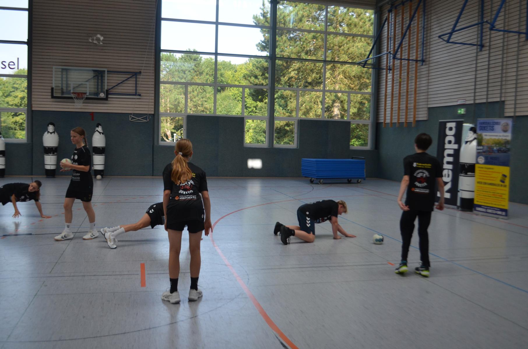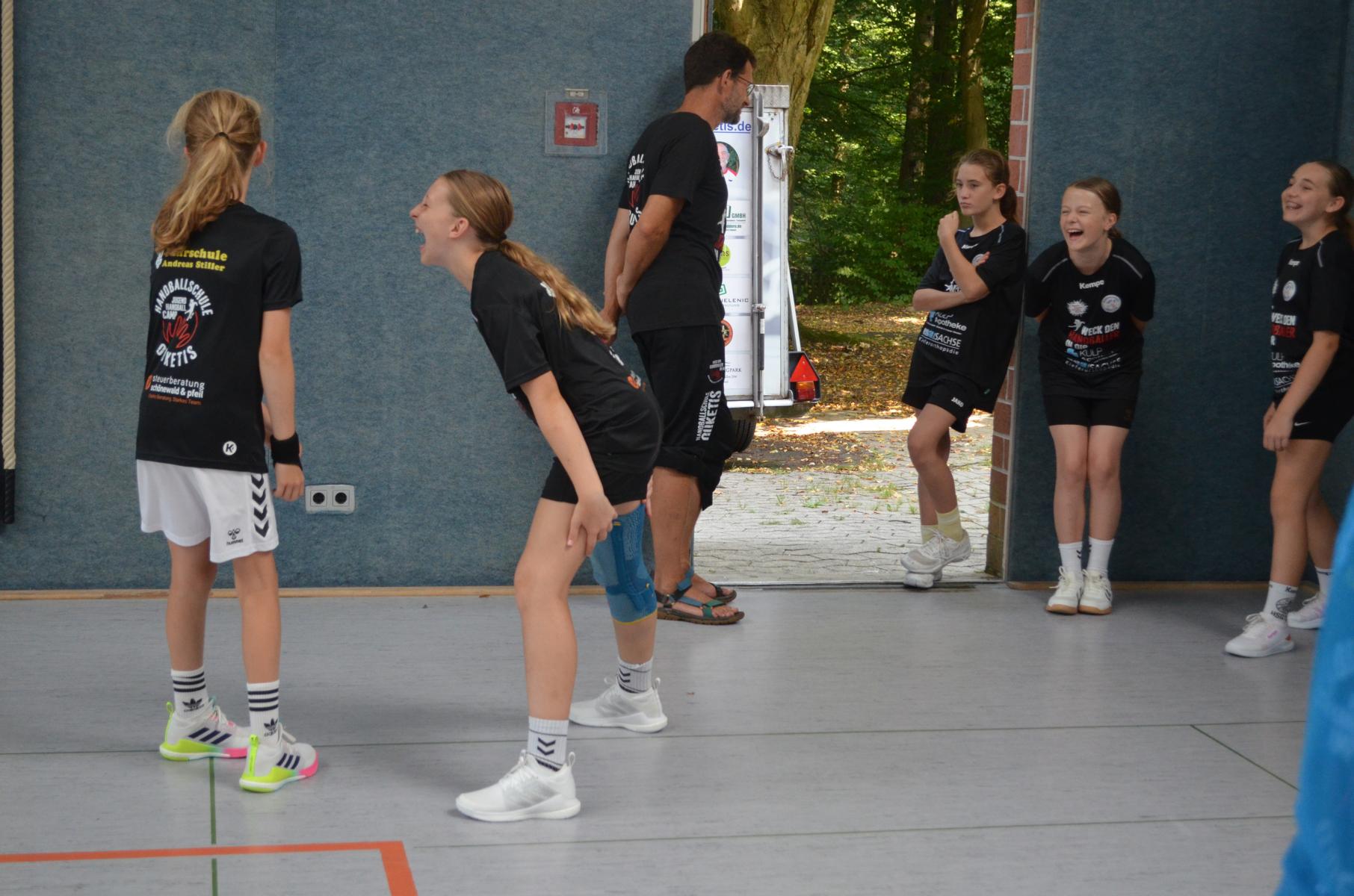 Jetzt steht die letzte Trainingseinheit auf dem Plan. Zum Aufwärmen gibt es Partnerübungen, die nicht nur Arme und Beine, sondern auch Lachmuskeln beanspruchen. Anschließend folgt ein knallharter Handballparcours, der von jedem alles fordert. Spätestens nun merkt man, dass vier Tage voller Training doch ihre Spuren hinterlassen haben. Jetzt geht´s ab zum Fotoshooting. Ich schiebe die Teens von rechts nach links von vorn nach hinten – so lange, bis das Bild perfekt ist. Nun werden die Geräte ordentlich in die Rollwagen gepackt und die AirBuddies sind so glücklich, dass die Luft rausgelassen wird und sie sich ausruhen dürfen. Sie wurden in den letzten Tagen sehr beansprucht, angerempelt und sogar umgestoßen. Davon müssen sie sich bis zum Herbstcamp erst einmal erholen. Zur Belohnung für das schnelle Abbauen und Aufräumen der Geräte gibt es jetzt – Trommelwirbel – das große Abschlussturnier! Die Tribüne ist voll, die Stimmung großartig, und jeder hat nur ein Ziel: zeigen, was man gelernt hat. Es wird gekämpft, gepasst, geworfen und gejubelt. Die Teens hauen großartige Spielzüge raus, als hätten sie heimlich nachts noch extra dafür trainiert.