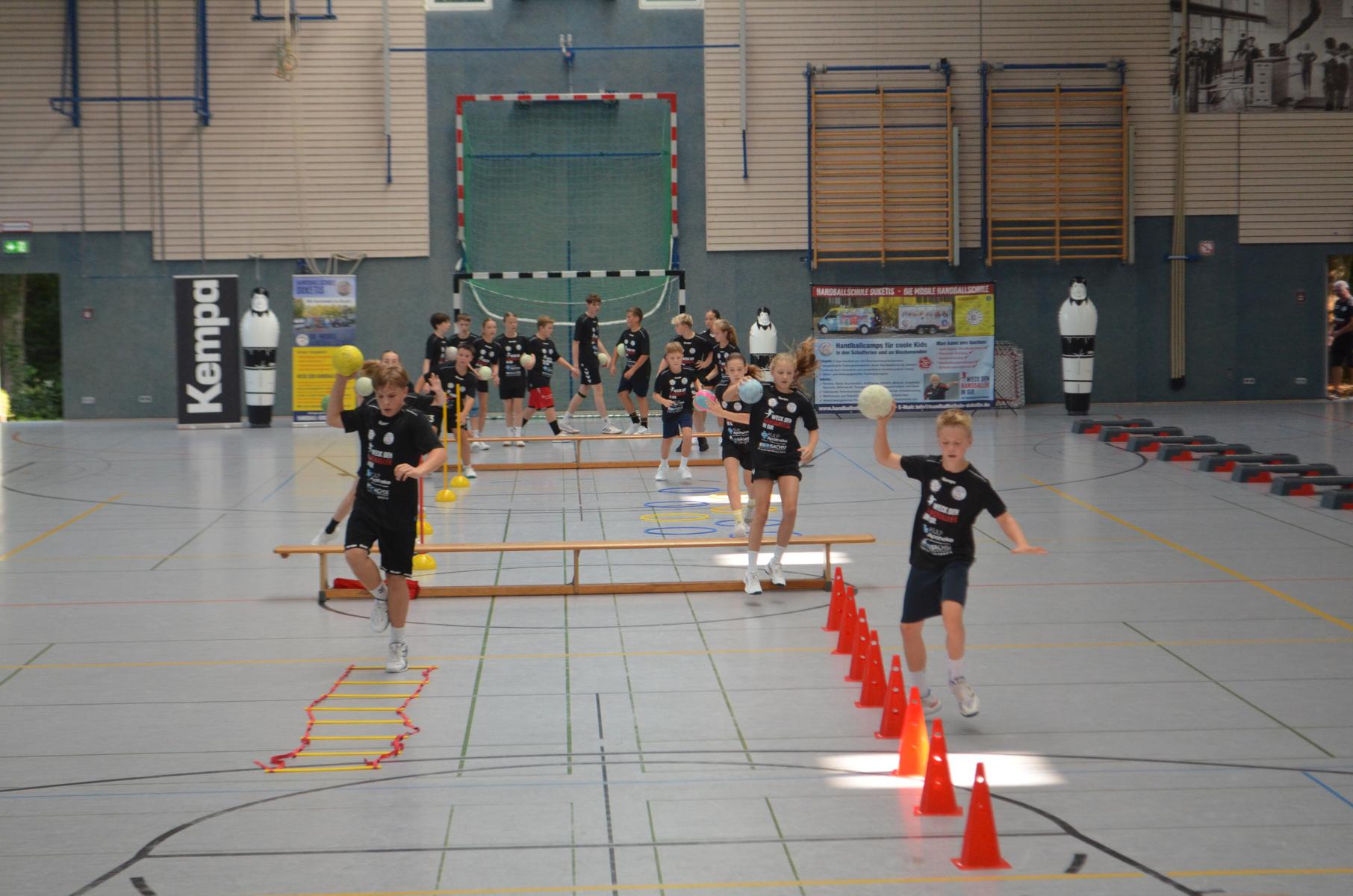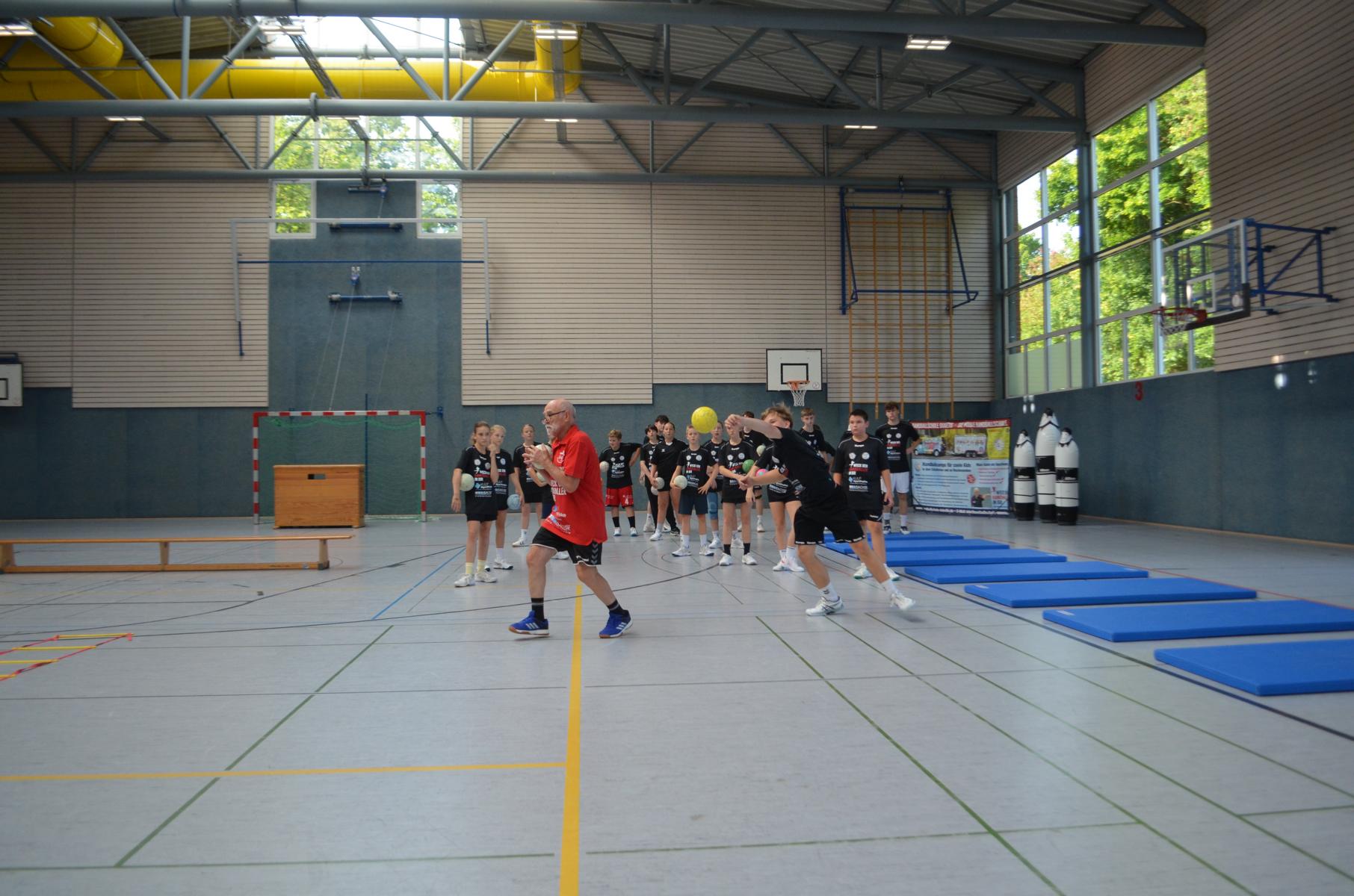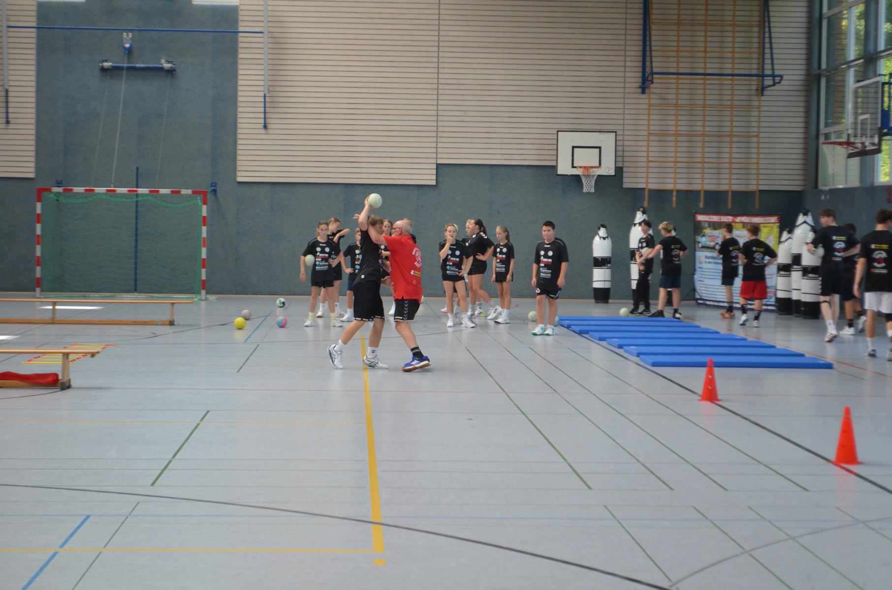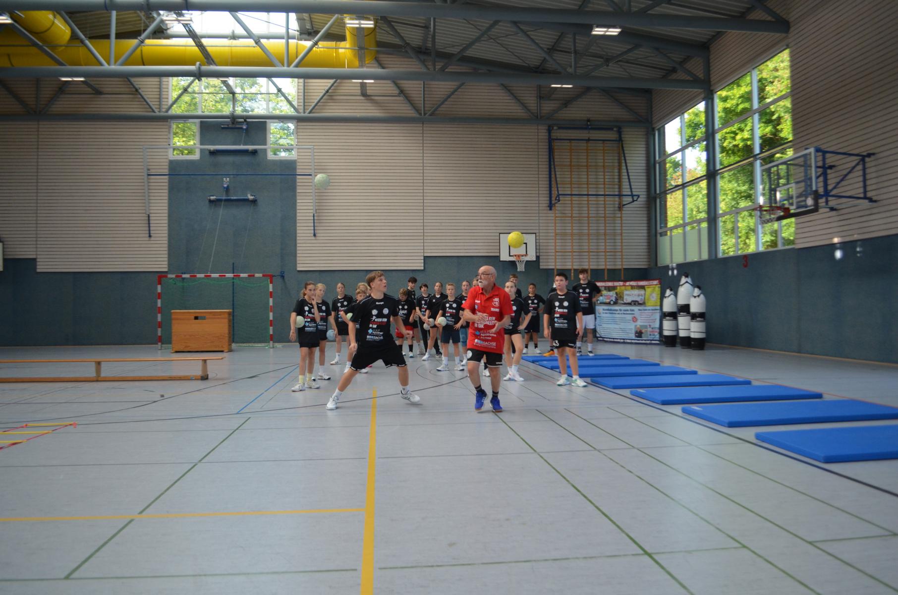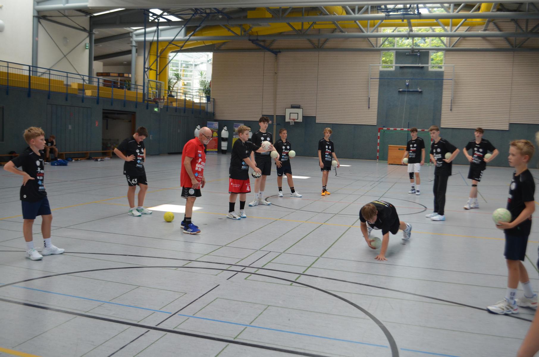 Jetzt steht die letzte Trainingseinheit auf dem Plan. Zum Aufwärmen gibt es Partnerübungen, die nicht nur Arme und Beine, sondern auch Lachmuskeln beanspruchen. Anschließend folgt ein knallharter Handballparcours, der von jedem alles fordert. Spätestens nun merkt man, dass vier Tage voller Training doch ihre Spuren hinterlassen haben. Jetzt geht´s ab zum Fotoshooting. Ich schiebe die Teens von rechts nach links von vorn nach hinten – so lange, bis das Bild perfekt ist. Nun werden die Geräte ordentlich in die Rollwagen gepackt und die AirBuddies sind so glücklich, dass die Luft rausgelassen wird und sie sich ausruhen dürfen. Sie wurden in den letzten Tagen sehr beansprucht, angerempelt und sogar umgestoßen. Davon müssen sie sich bis zum Herbstcamp erst einmal erholen. Zur Belohnung für das schnelle Abbauen und Aufräumen der Geräte gibt es jetzt – Trommelwirbel – das große Abschlussturnier! Die Tribüne ist voll, die Stimmung großartig, und jeder hat nur ein Ziel: zeigen, was man gelernt hat. Es wird gekämpft, gepasst, geworfen und gejubelt. Die Teens hauen großartige Spielzüge raus, als hätten sie heimlich nachts noch extra dafür trainiert.