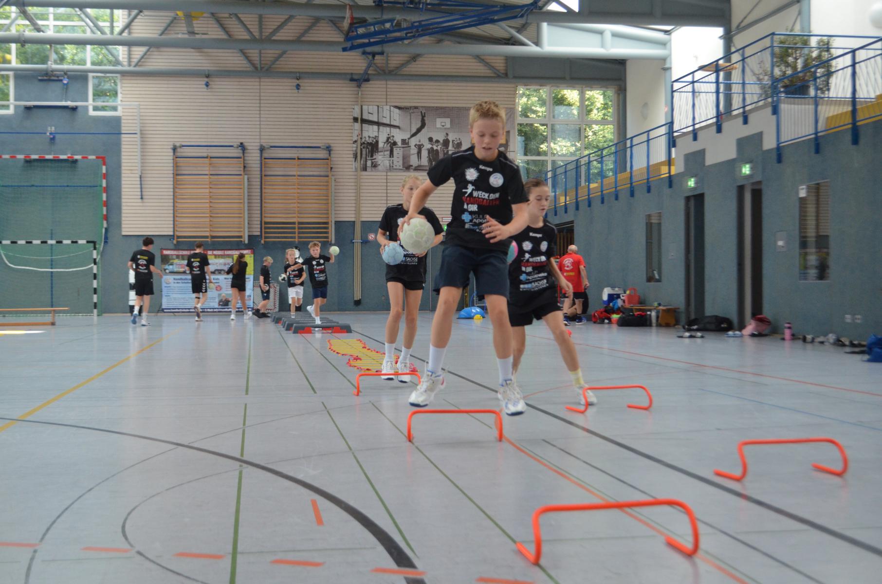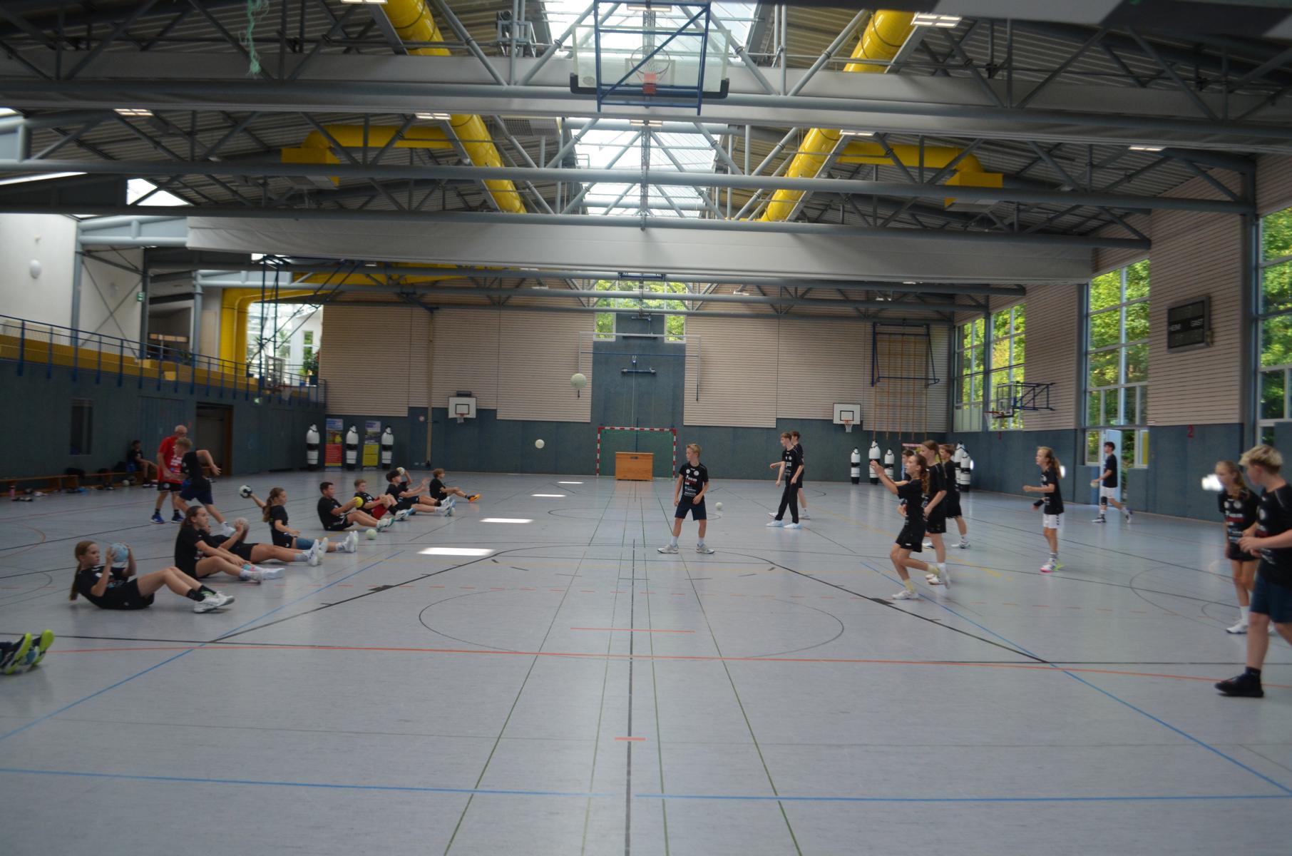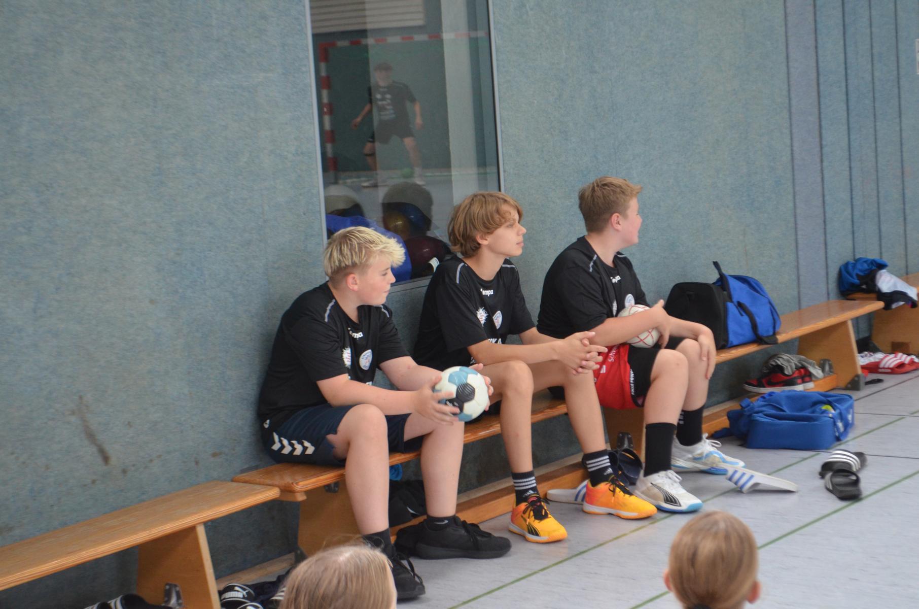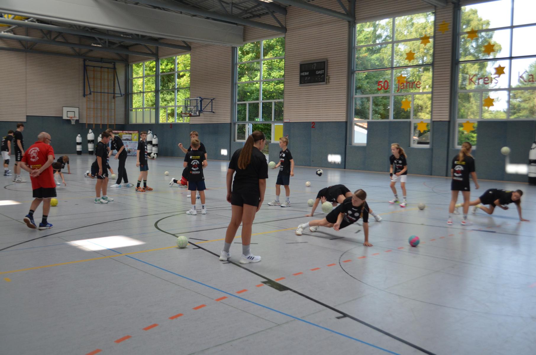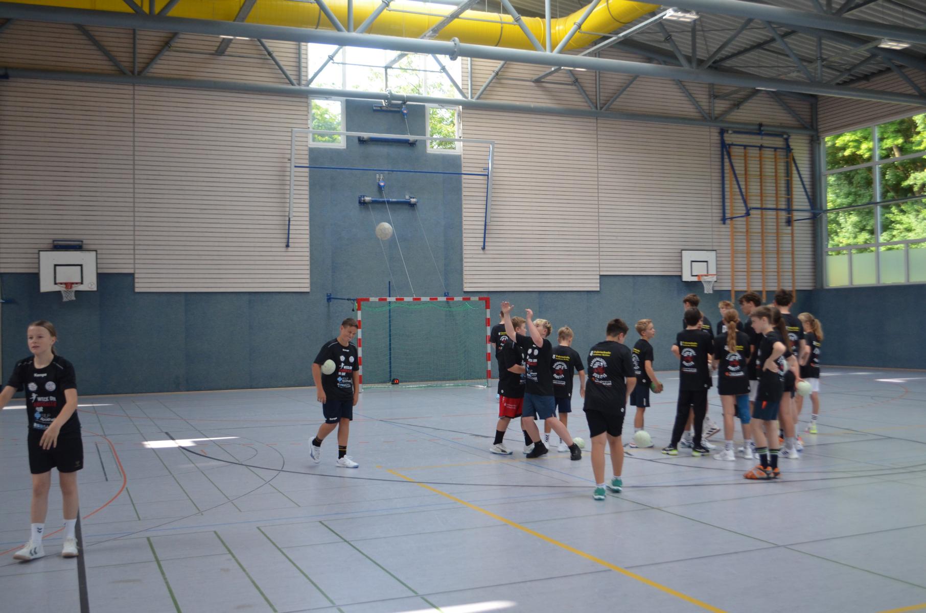 Jetzt steht die letzte Trainingseinheit auf dem Plan. Zum Aufwärmen gibt es Partnerübungen, die nicht nur Arme und Beine, sondern auch Lachmuskeln beanspruchen. Anschließend folgt ein knallharter Handballparcours, der von jedem alles fordert. Spätestens nun merkt man, dass vier Tage voller Training doch ihre Spuren hinterlassen haben. Jetzt geht´s ab zum Fotoshooting. Ich schiebe die Teens von rechts nach links von vorn nach hinten – so lange, bis das Bild perfekt ist. Nun werden die Geräte ordentlich in die Rollwagen gepackt und die AirBuddies sind so glücklich, dass die Luft rausgelassen wird und sie sich ausruhen dürfen. Sie wurden in den letzten Tagen sehr beansprucht, angerempelt und sogar umgestoßen. Davon müssen sie sich bis zum Herbstcamp erst einmal erholen. Zur Belohnung für das schnelle Abbauen und Aufräumen der Geräte gibt es jetzt – Trommelwirbel – das große Abschlussturnier! Die Tribüne ist voll, die Stimmung großartig, und jeder hat nur ein Ziel: zeigen, was man gelernt hat. Es wird gekämpft, gepasst, geworfen und gejubelt. Die Teens hauen großartige Spielzüge raus, als hätten sie heimlich nachts noch extra dafür trainiert.