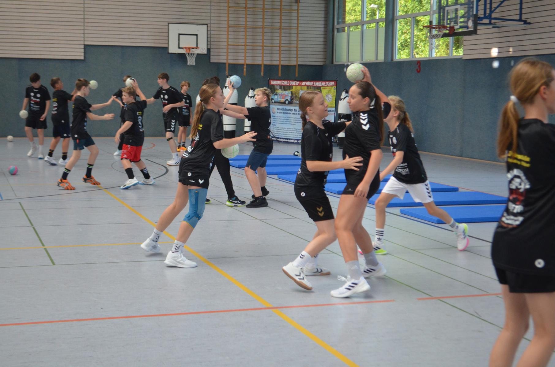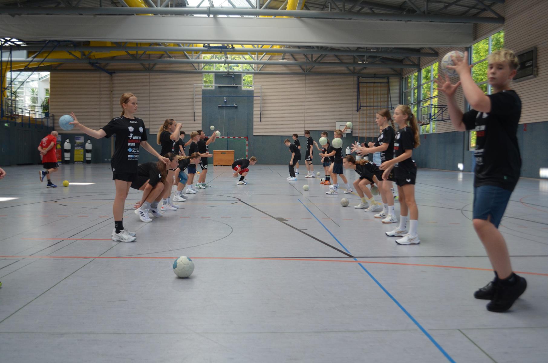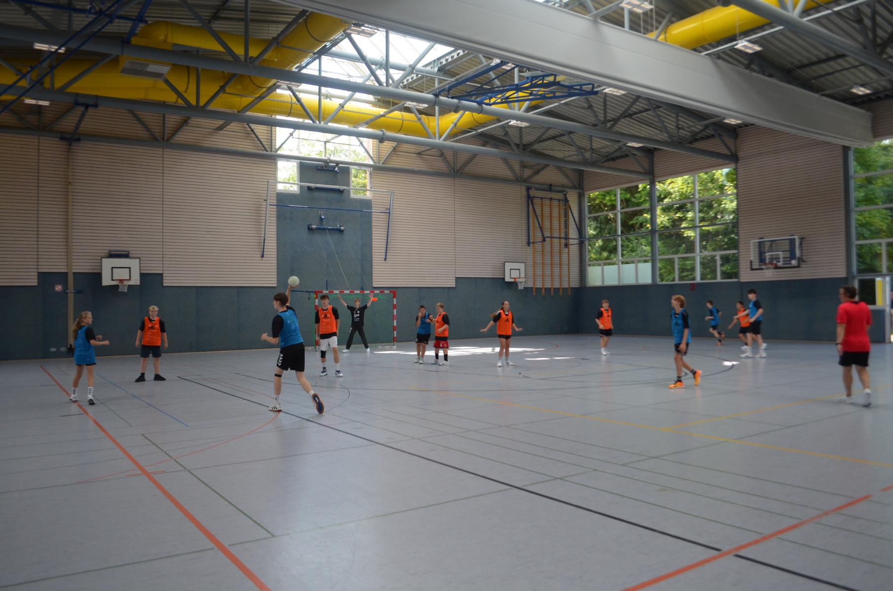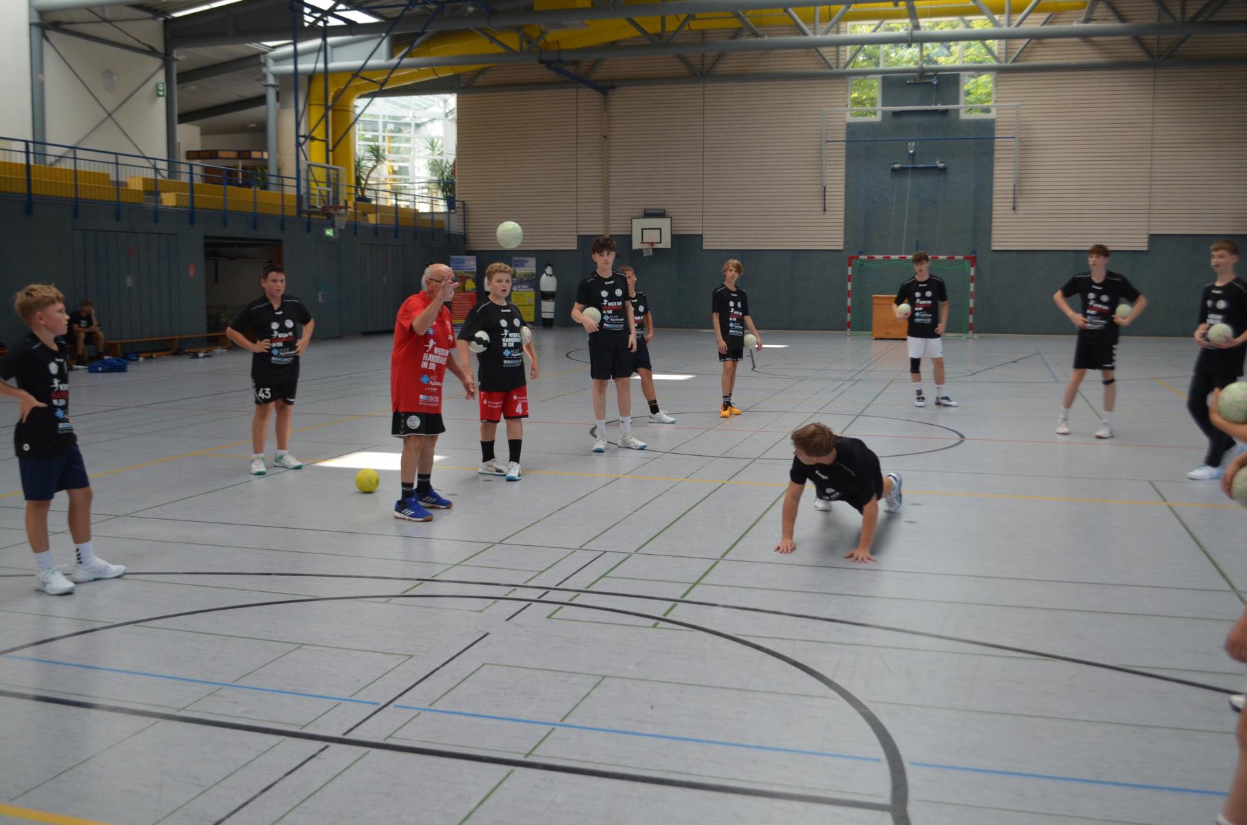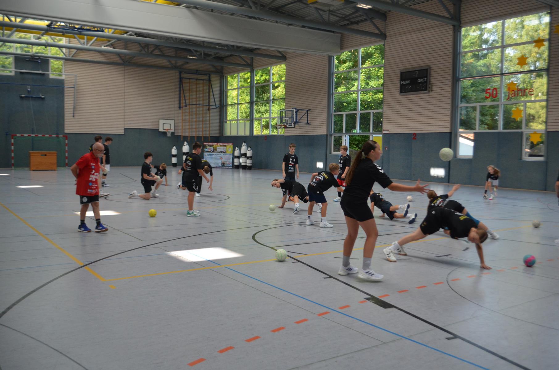 Jetzt steht die letzte Trainingseinheit auf dem Plan. Zum Aufwärmen gibt es Partnerübungen, die nicht nur Arme und Beine, sondern auch Lachmuskeln beanspruchen. Anschließend folgt ein knallharter Handballparcours, der von jedem alles fordert. Spätestens nun merkt man, dass vier Tage voller Training doch ihre Spuren hinterlassen haben. Jetzt geht´s ab zum Fotoshooting. Ich schiebe die Teens von rechts nach links von vorn nach hinten – so lange, bis das Bild perfekt ist. Nun werden die Geräte ordentlich in die Rollwagen gepackt und die AirBuddies sind so glücklich, dass die Luft rausgelassen wird und sie sich ausruhen dürfen. Sie wurden in den letzten Tagen sehr beansprucht, angerempelt und sogar umgestoßen. Davon müssen sie sich bis zum Herbstcamp erst einmal erholen. Zur Belohnung für das schnelle Abbauen und Aufräumen der Geräte gibt es jetzt – Trommelwirbel – das große Abschlussturnier! Die Tribüne ist voll, die Stimmung großartig, und jeder hat nur ein Ziel: zeigen, was man gelernt hat. Es wird gekämpft, gepasst, geworfen und gejubelt. Die Teens hauen großartige Spielzüge raus, als hätten sie heimlich nachts noch extra dafür trainiert.