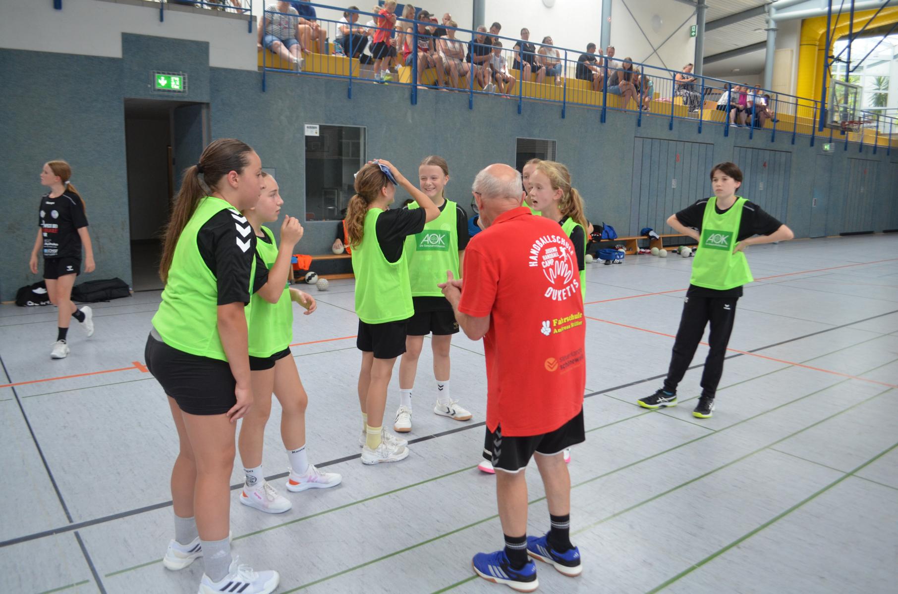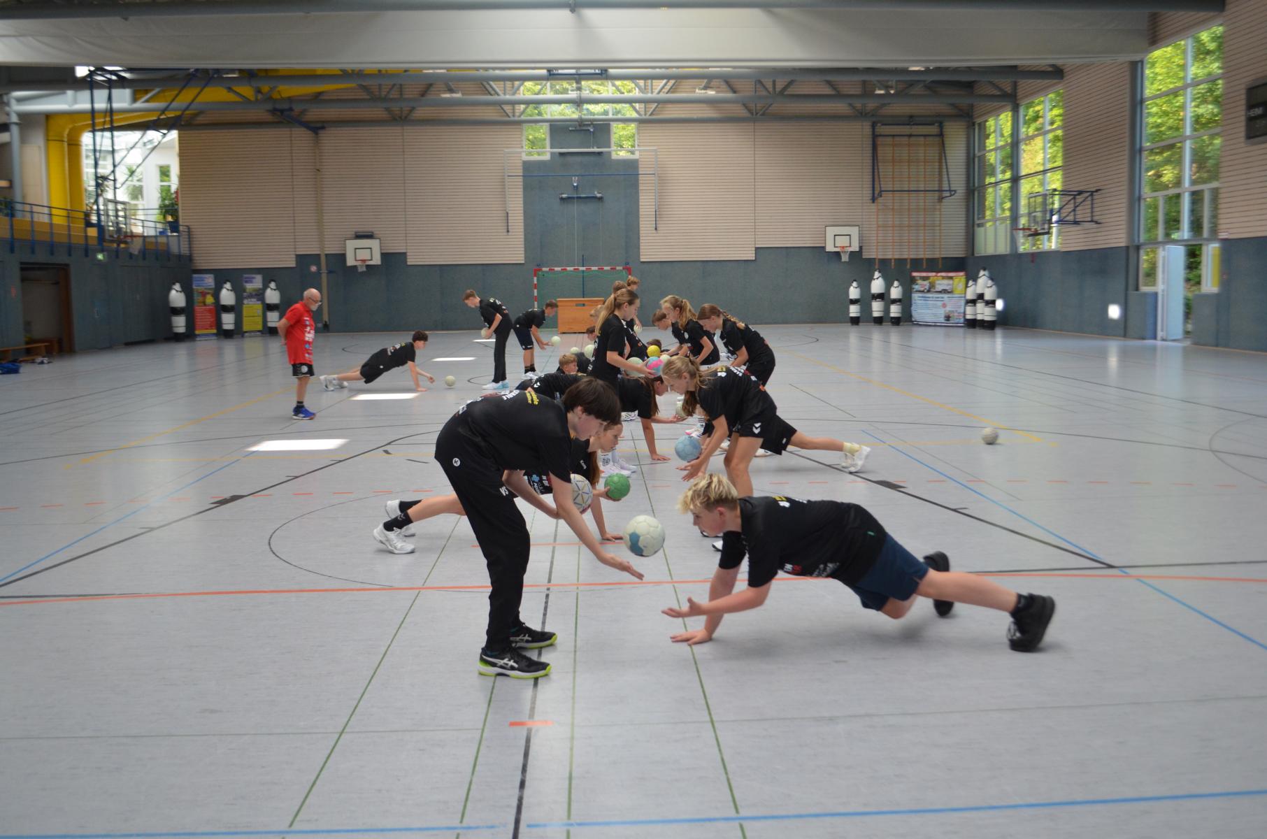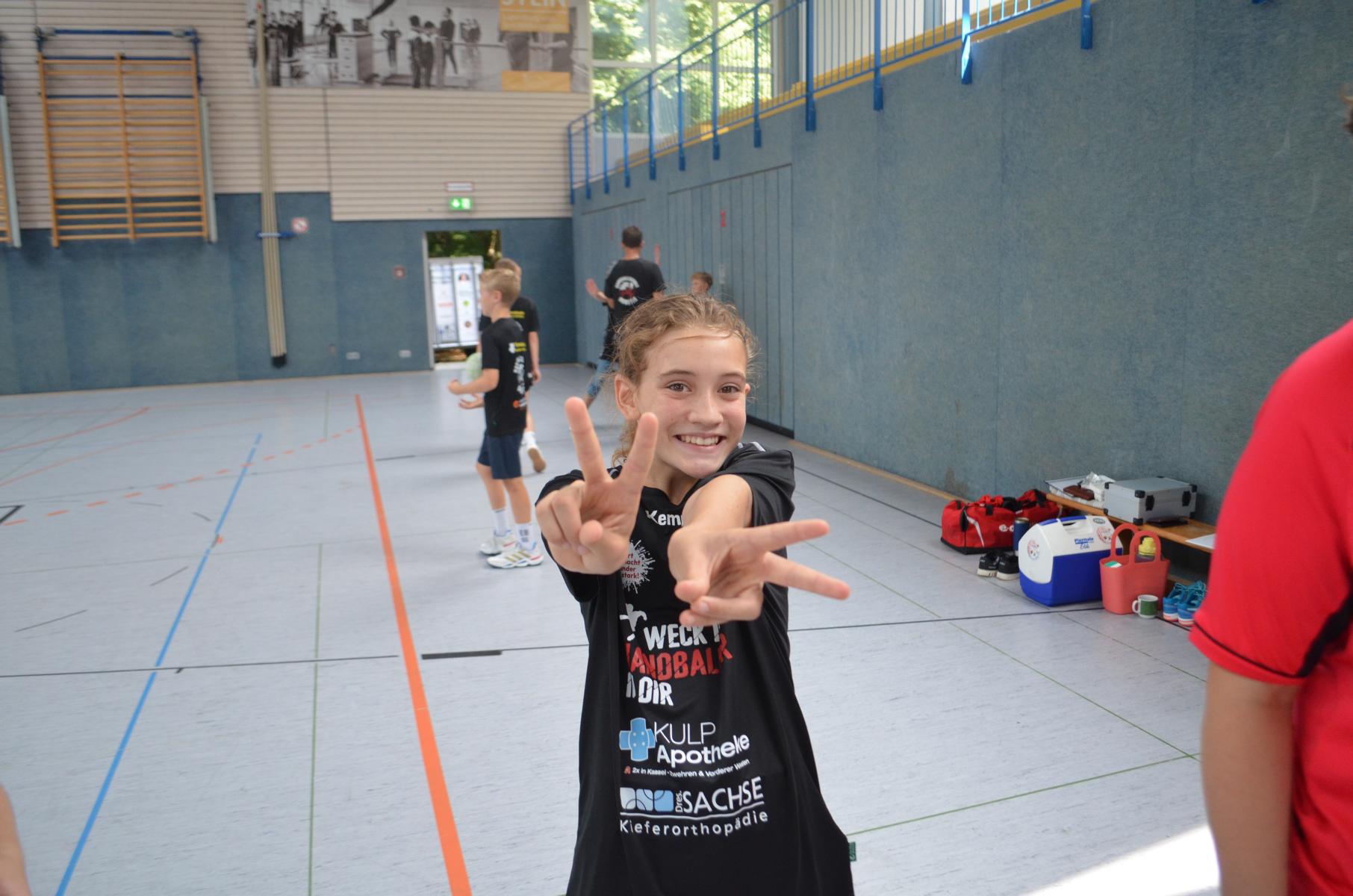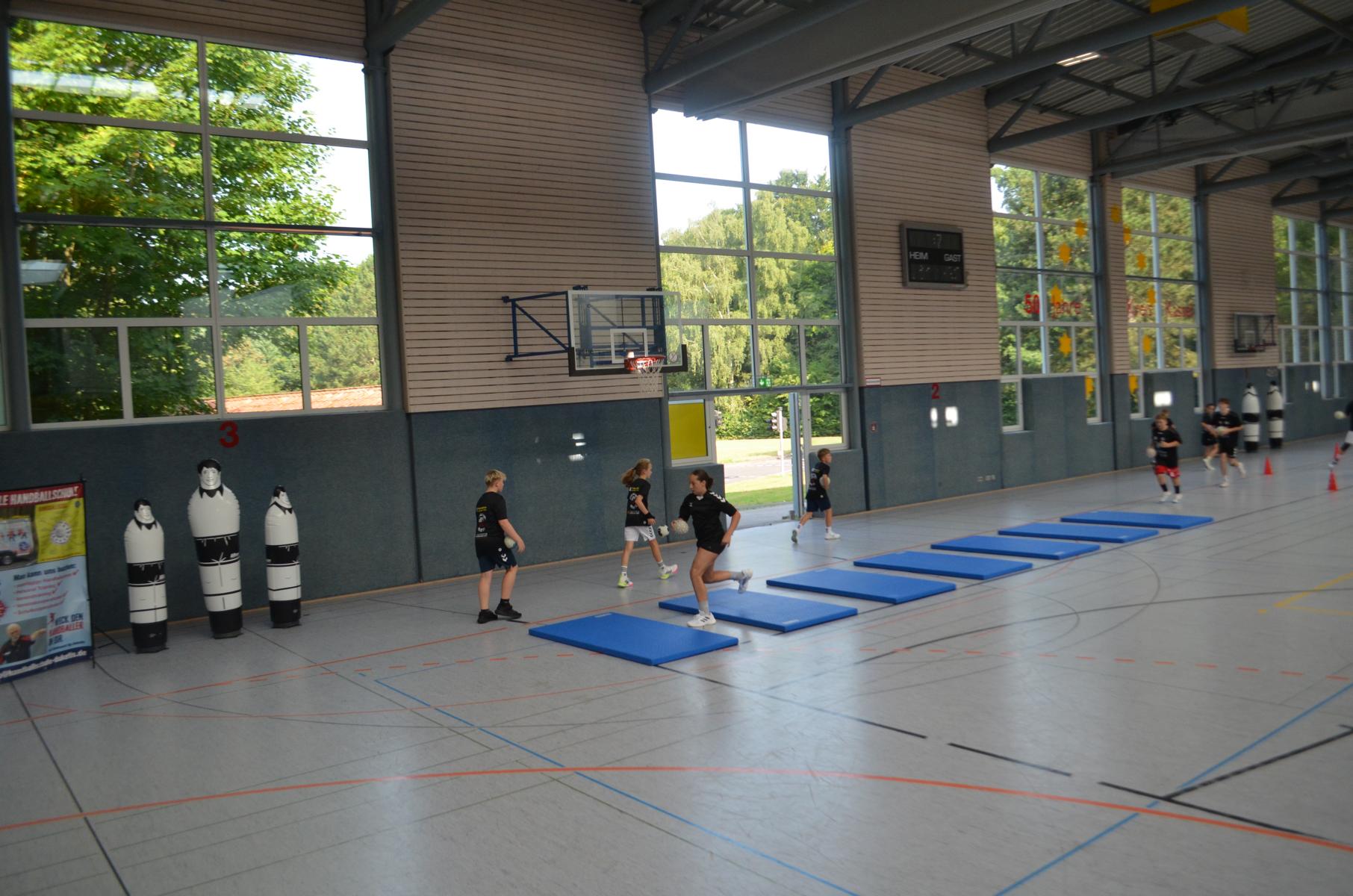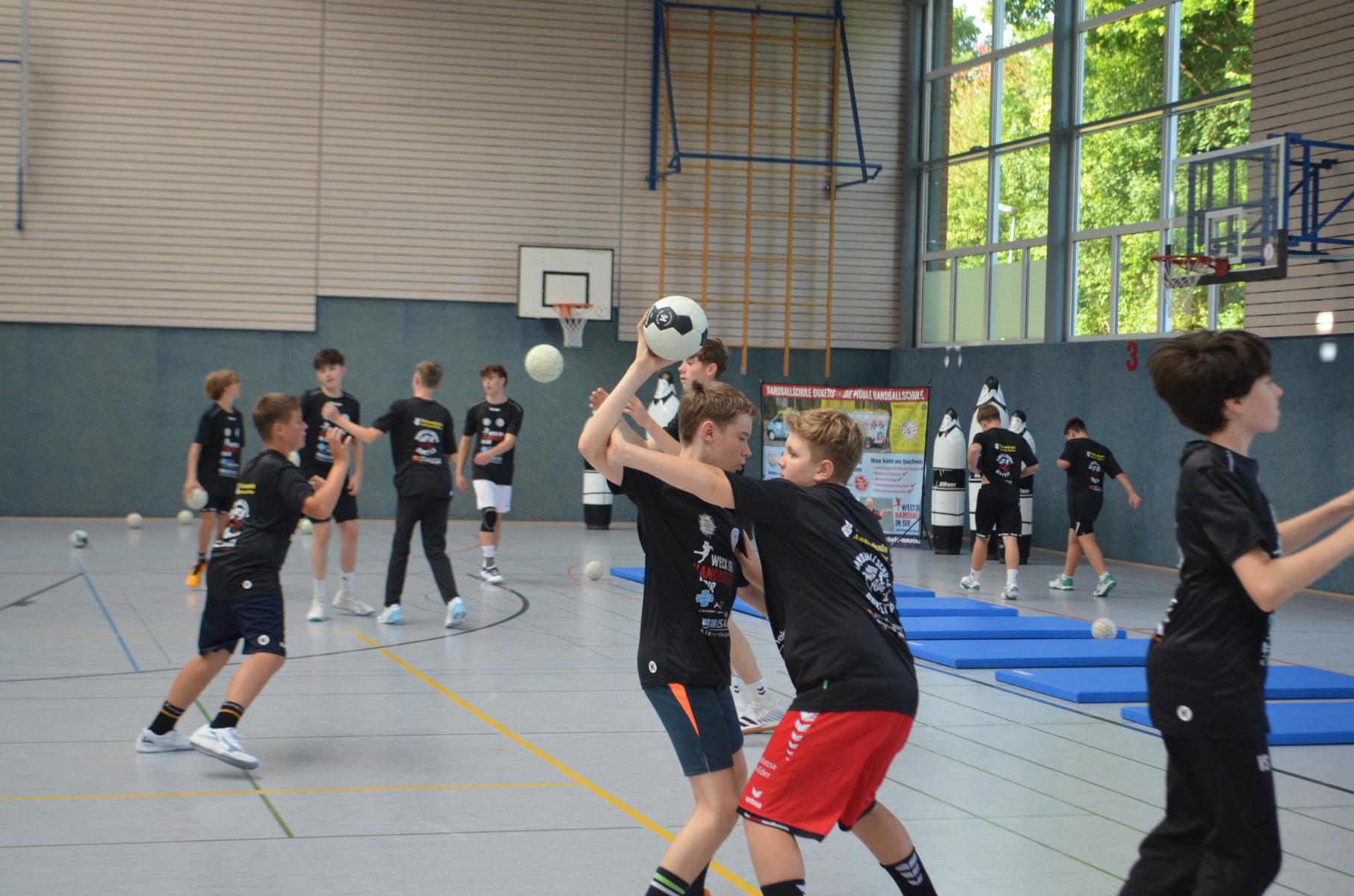 Jetzt steht die letzte Trainingseinheit auf dem Plan. Zum Aufwärmen gibt es Partnerübungen, die nicht nur Arme und Beine, sondern auch Lachmuskeln beanspruchen. Anschließend folgt ein knallharter Handballparcours, der von jedem alles fordert. Spätestens nun merkt man, dass vier Tage voller Training doch ihre Spuren hinterlassen haben. Jetzt geht´s ab zum Fotoshooting. Ich schiebe die Teens von rechts nach links von vorn nach hinten – so lange, bis das Bild perfekt ist. Nun werden die Geräte ordentlich in die Rollwagen gepackt und die AirBuddies sind so glücklich, dass die Luft rausgelassen wird und sie sich ausruhen dürfen. Sie wurden in den letzten Tagen sehr beansprucht, angerempelt und sogar umgestoßen. Davon müssen sie sich bis zum Herbstcamp erst einmal erholen. Zur Belohnung für das schnelle Abbauen und Aufräumen der Geräte gibt es jetzt – Trommelwirbel – das große Abschlussturnier! Die Tribüne ist voll, die Stimmung großartig, und jeder hat nur ein Ziel: zeigen, was man gelernt hat. Es wird gekämpft, gepasst, geworfen und gejubelt. Die Teens hauen großartige Spielzüge raus, als hätten sie heimlich nachts noch extra dafür trainiert.