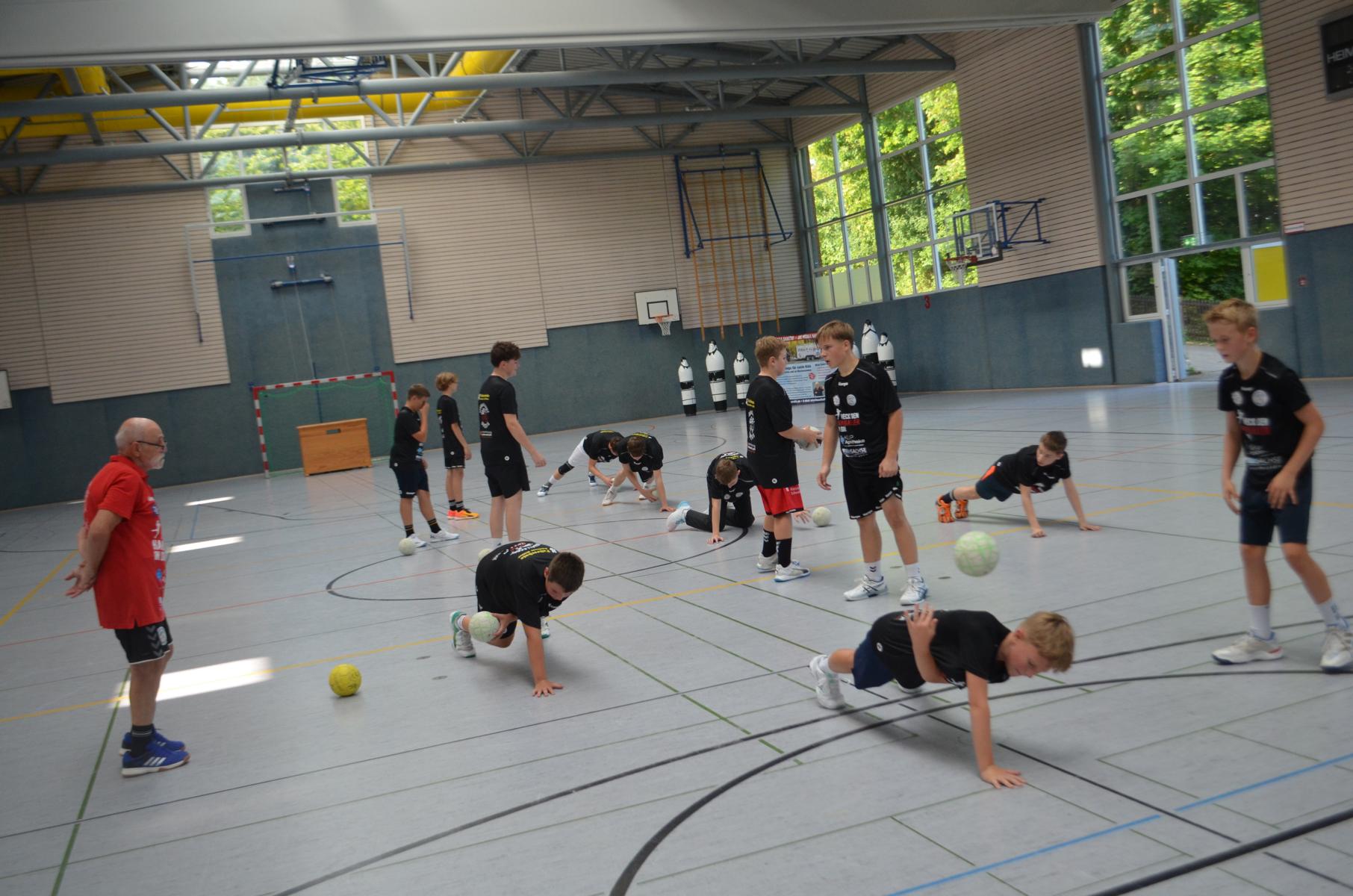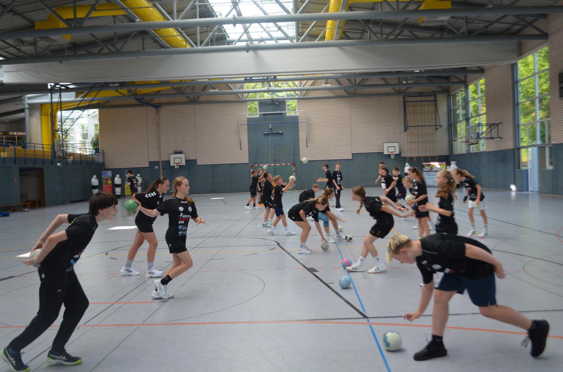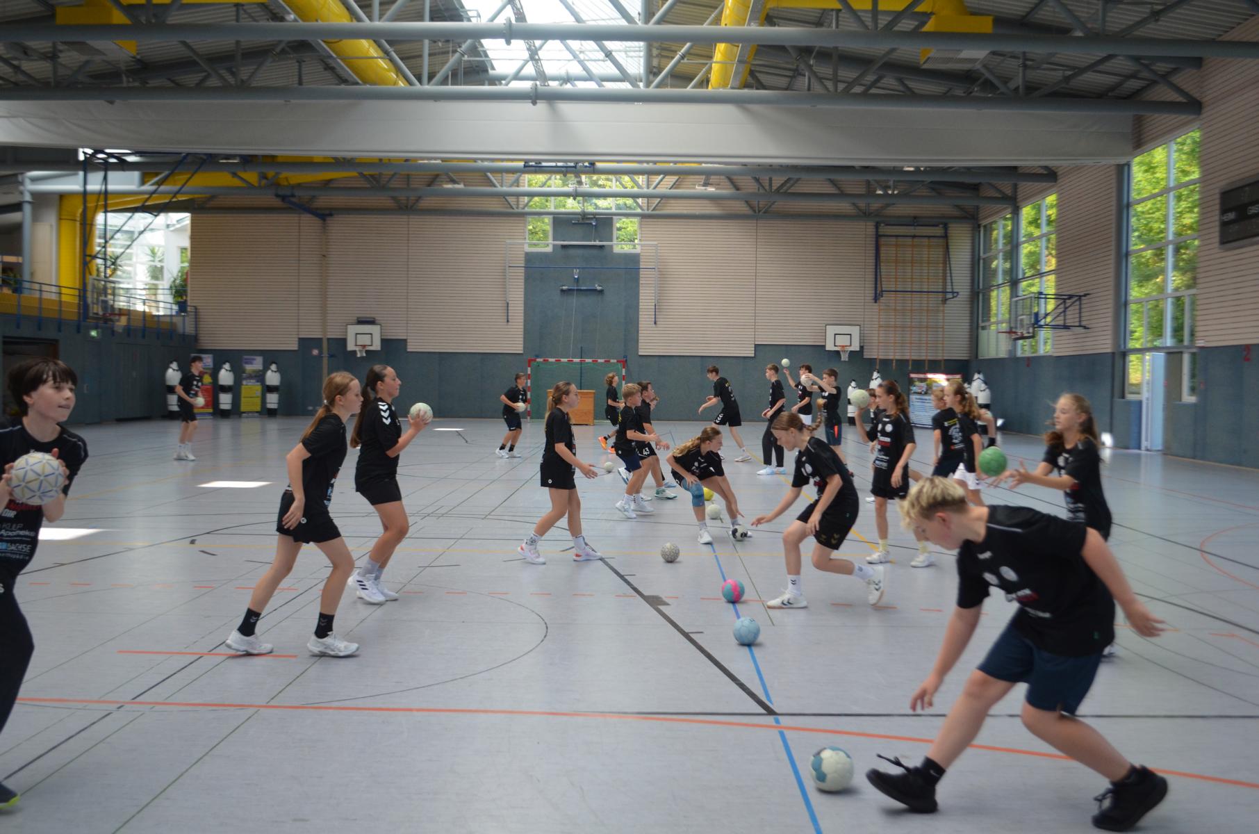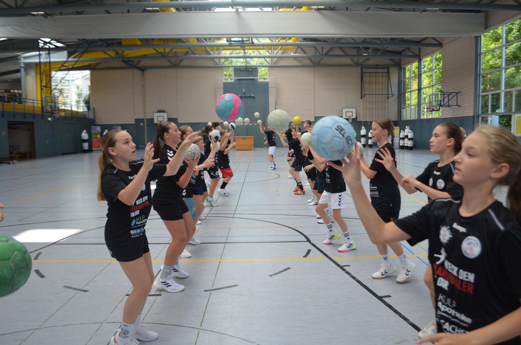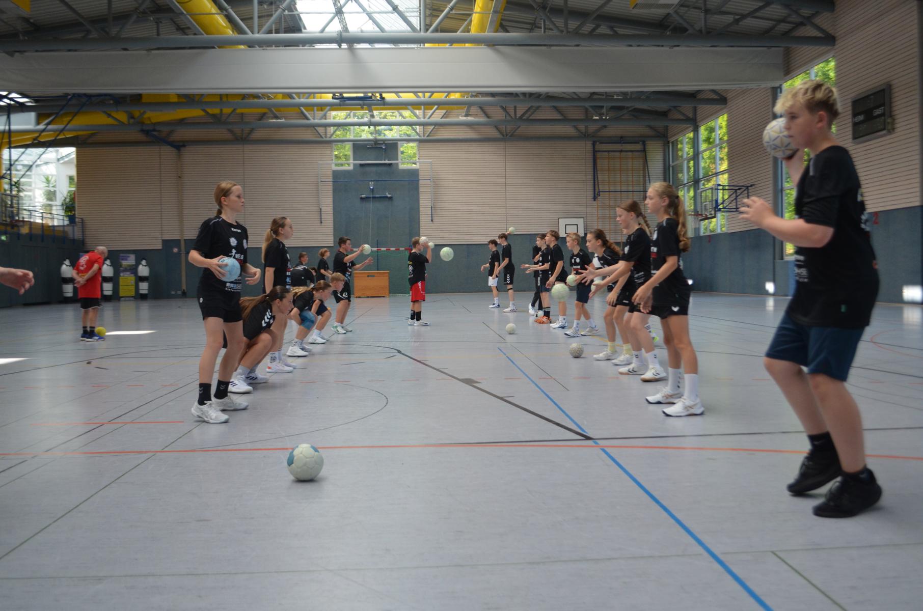 Jetzt steht die letzte Trainingseinheit auf dem Plan. Zum Aufwärmen gibt es Partnerübungen, die nicht nur Arme und Beine, sondern auch Lachmuskeln beanspruchen. Anschließend folgt ein knallharter Handballparcours, der von jedem alles fordert. Spätestens nun merkt man, dass vier Tage voller Training doch ihre Spuren hinterlassen haben. Jetzt geht´s ab zum Fotoshooting. Ich schiebe die Teens von rechts nach links von vorn nach hinten – so lange, bis das Bild perfekt ist. Nun werden die Geräte ordentlich in die Rollwagen gepackt und die AirBuddies sind so glücklich, dass die Luft rausgelassen wird und sie sich ausruhen dürfen. Sie wurden in den letzten Tagen sehr beansprucht, angerempelt und sogar umgestoßen. Davon müssen sie sich bis zum Herbstcamp erst einmal erholen. Zur Belohnung für das schnelle Abbauen und Aufräumen der Geräte gibt es jetzt – Trommelwirbel – das große Abschlussturnier! Die Tribüne ist voll, die Stimmung großartig, und jeder hat nur ein Ziel: zeigen, was man gelernt hat. Es wird gekämpft, gepasst, geworfen und gejubelt. Die Teens hauen großartige Spielzüge raus, als hätten sie heimlich nachts noch extra dafür trainiert.
