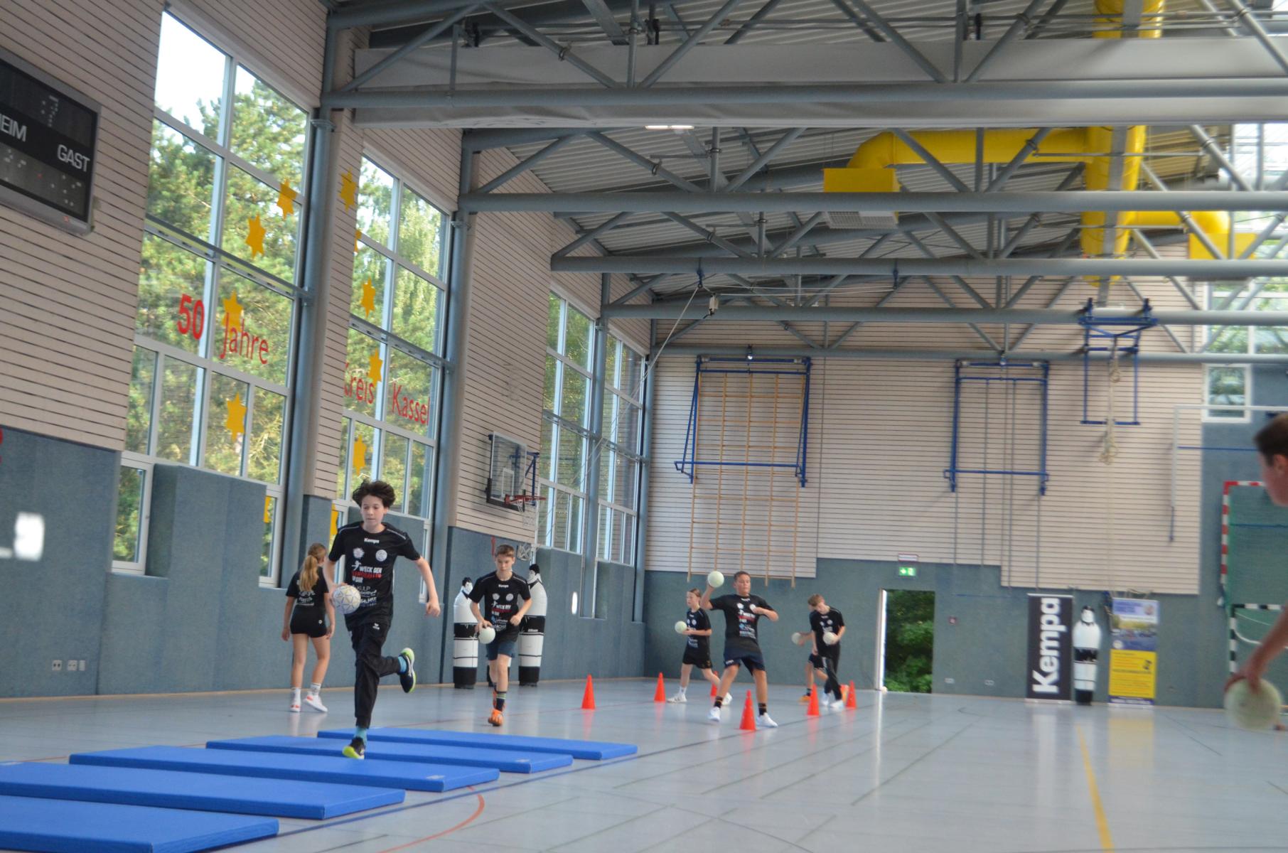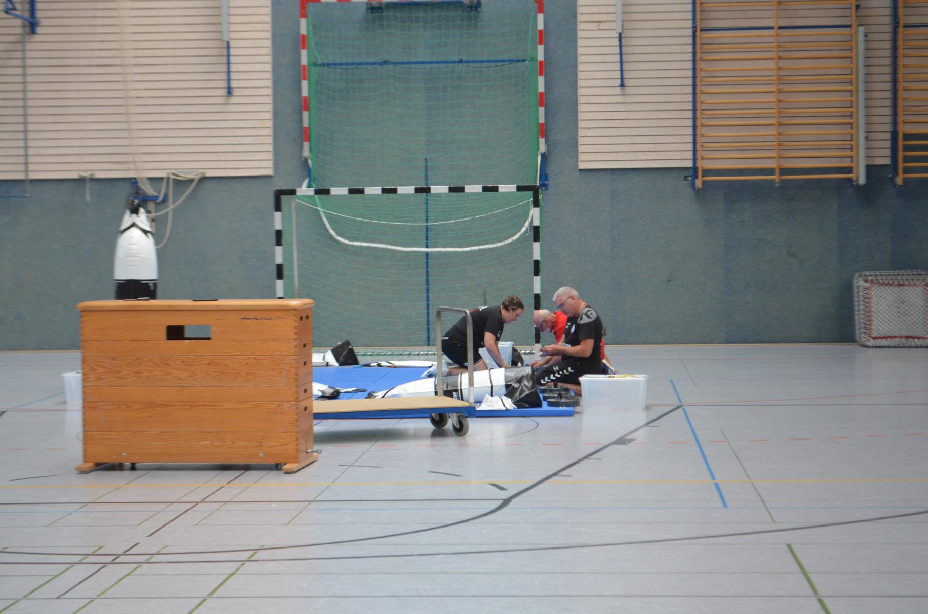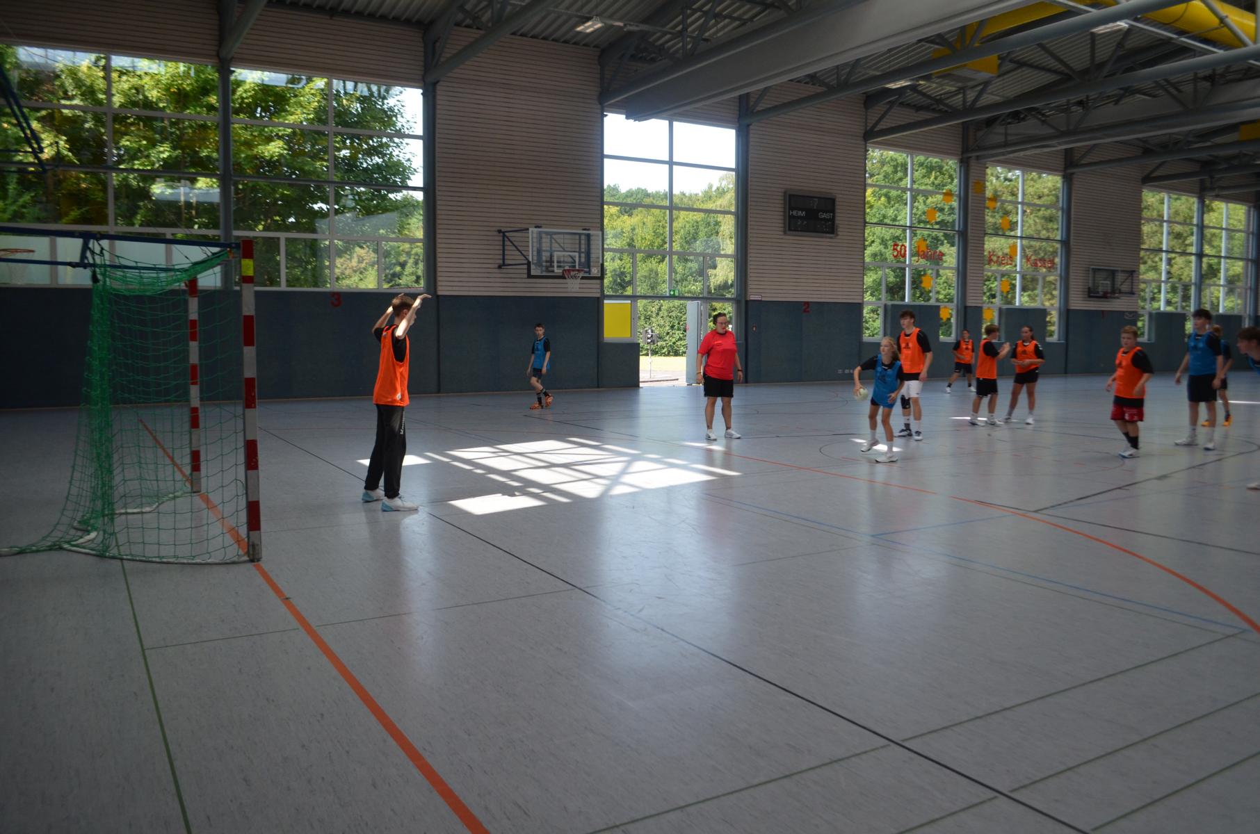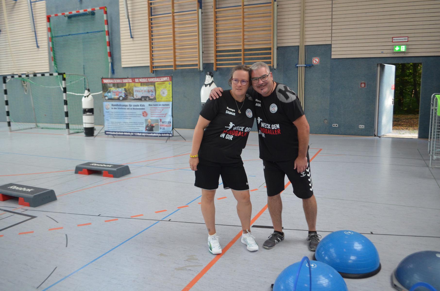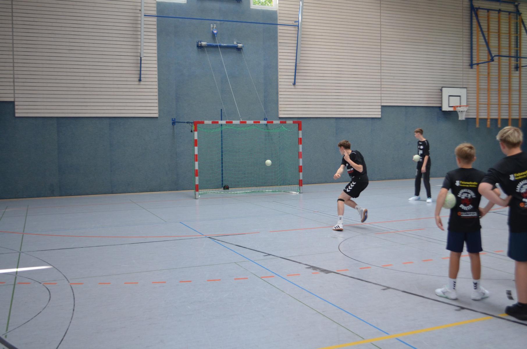 Jetzt steht die letzte Trainingseinheit auf dem Plan. Zum Aufwärmen gibt es Partnerübungen, die nicht nur Arme und Beine, sondern auch Lachmuskeln beanspruchen. Anschließend folgt ein knallharter Handballparcours, der von jedem alles fordert. Spätestens nun merkt man, dass vier Tage voller Training doch ihre Spuren hinterlassen haben. Jetzt geht´s ab zum Fotoshooting. Ich schiebe die Teens von rechts nach links von vorn nach hinten – so lange, bis das Bild perfekt ist. Nun werden die Geräte ordentlich in die Rollwagen gepackt und die AirBuddies sind so glücklich, dass die Luft rausgelassen wird und sie sich ausruhen dürfen. Sie wurden in den letzten Tagen sehr beansprucht, angerempelt und sogar umgestoßen. Davon müssen sie sich bis zum Herbstcamp erst einmal erholen. Zur Belohnung für das schnelle Abbauen und Aufräumen der Geräte gibt es jetzt – Trommelwirbel – das große Abschlussturnier! Die Tribüne ist voll, die Stimmung großartig, und jeder hat nur ein Ziel: zeigen, was man gelernt hat. Es wird gekämpft, gepasst, geworfen und gejubelt. Die Teens hauen großartige Spielzüge raus, als hätten sie heimlich nachts noch extra dafür trainiert.