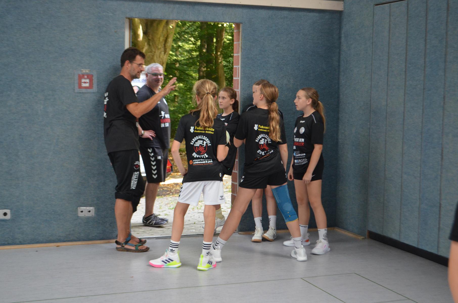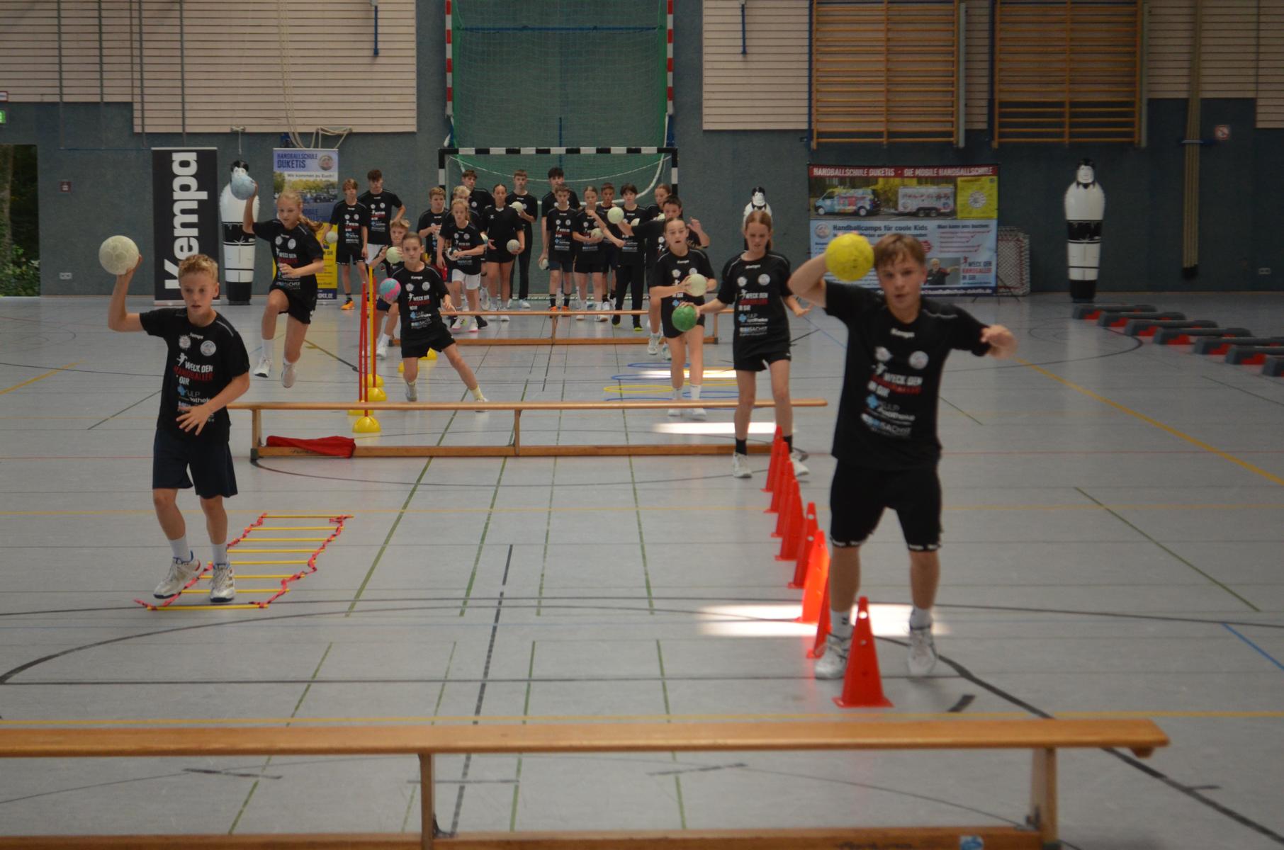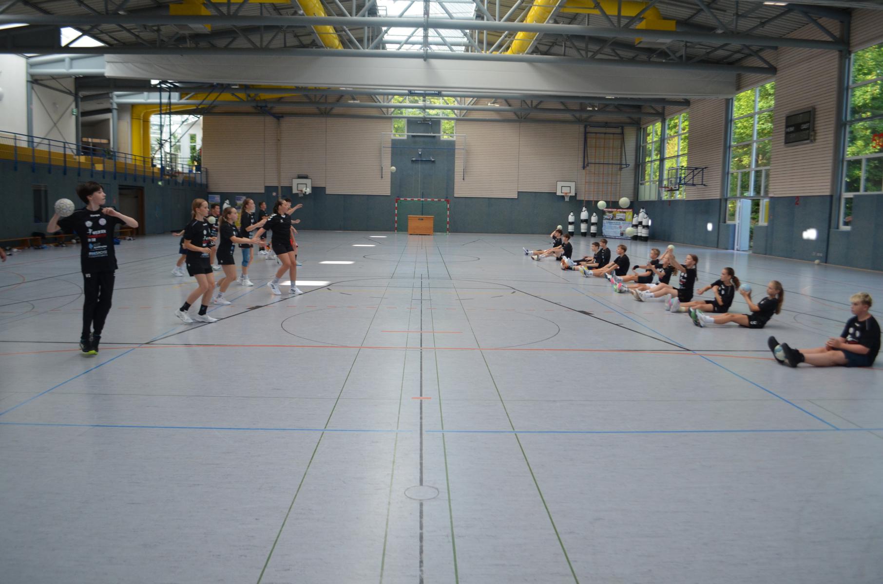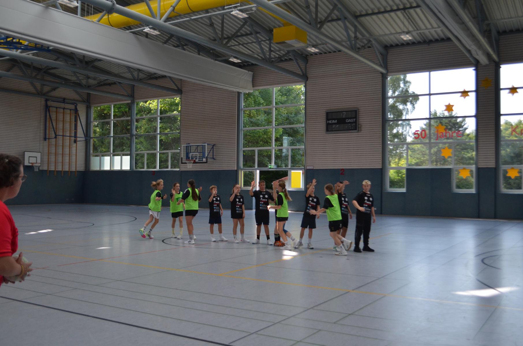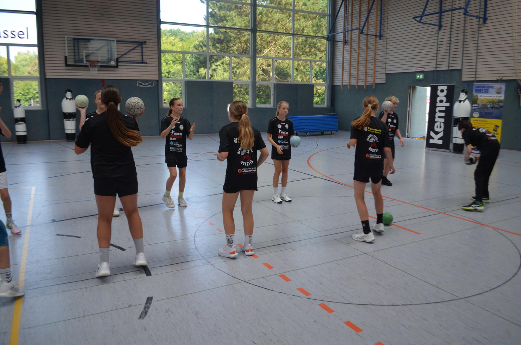 Jetzt steht die letzte Trainingseinheit auf dem Plan. Zum Aufwärmen gibt es Partnerübungen, die nicht nur Arme und Beine, sondern auch Lachmuskeln beanspruchen. Anschließend folgt ein knallharter Handballparcours, der von jedem alles fordert. Spätestens nun merkt man, dass vier Tage voller Training doch ihre Spuren hinterlassen haben. Jetzt geht´s ab zum Fotoshooting. Ich schiebe die Teens von rechts nach links von vorn nach hinten – so lange, bis das Bild perfekt ist. Nun werden die Geräte ordentlich in die Rollwagen gepackt und die AirBuddies sind so glücklich, dass die Luft rausgelassen wird und sie sich ausruhen dürfen. Sie wurden in den letzten Tagen sehr beansprucht, angerempelt und sogar umgestoßen. Davon müssen sie sich bis zum Herbstcamp erst einmal erholen. Zur Belohnung für das schnelle Abbauen und Aufräumen der Geräte gibt es jetzt – Trommelwirbel – das große Abschlussturnier! Die Tribüne ist voll, die Stimmung großartig, und jeder hat nur ein Ziel: zeigen, was man gelernt hat. Es wird gekämpft, gepasst, geworfen und gejubelt. Die Teens hauen großartige Spielzüge raus, als hätten sie heimlich nachts noch extra dafür trainiert.