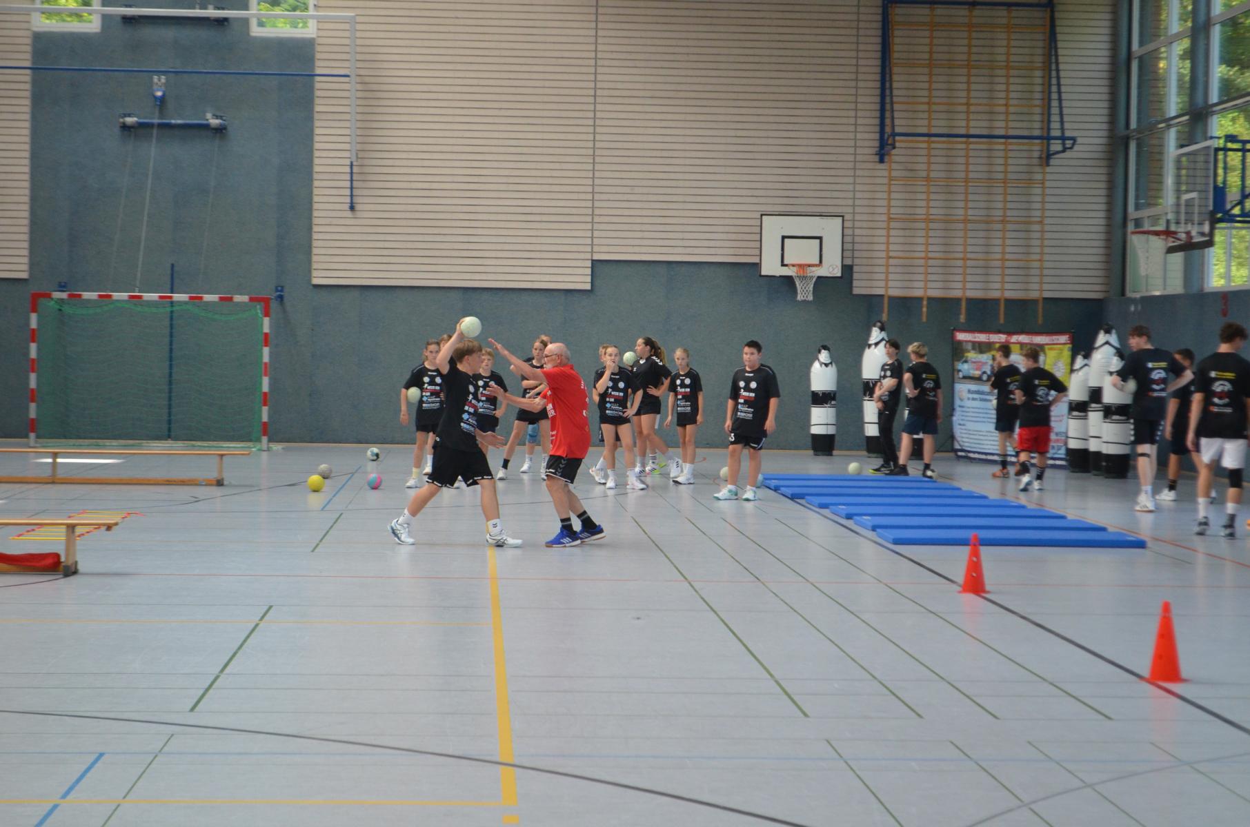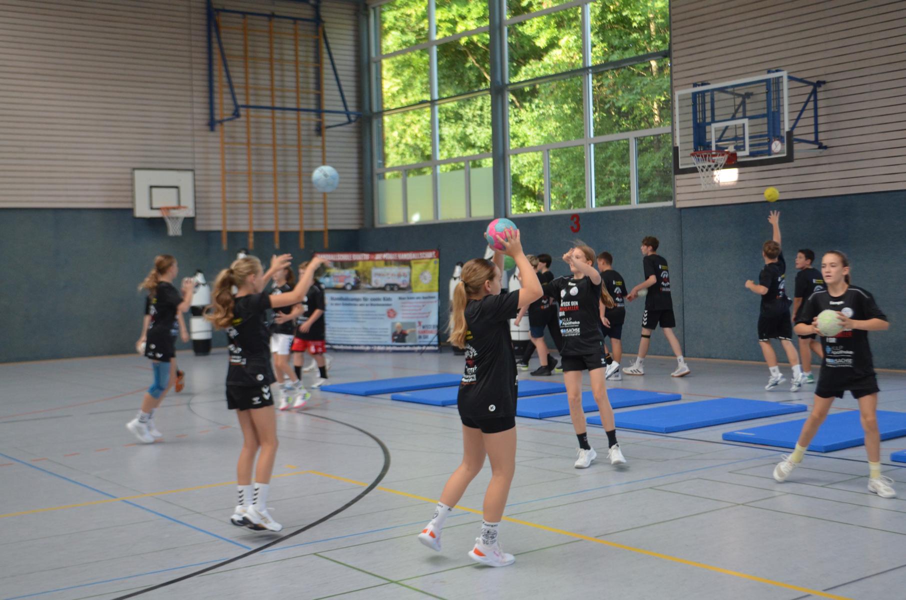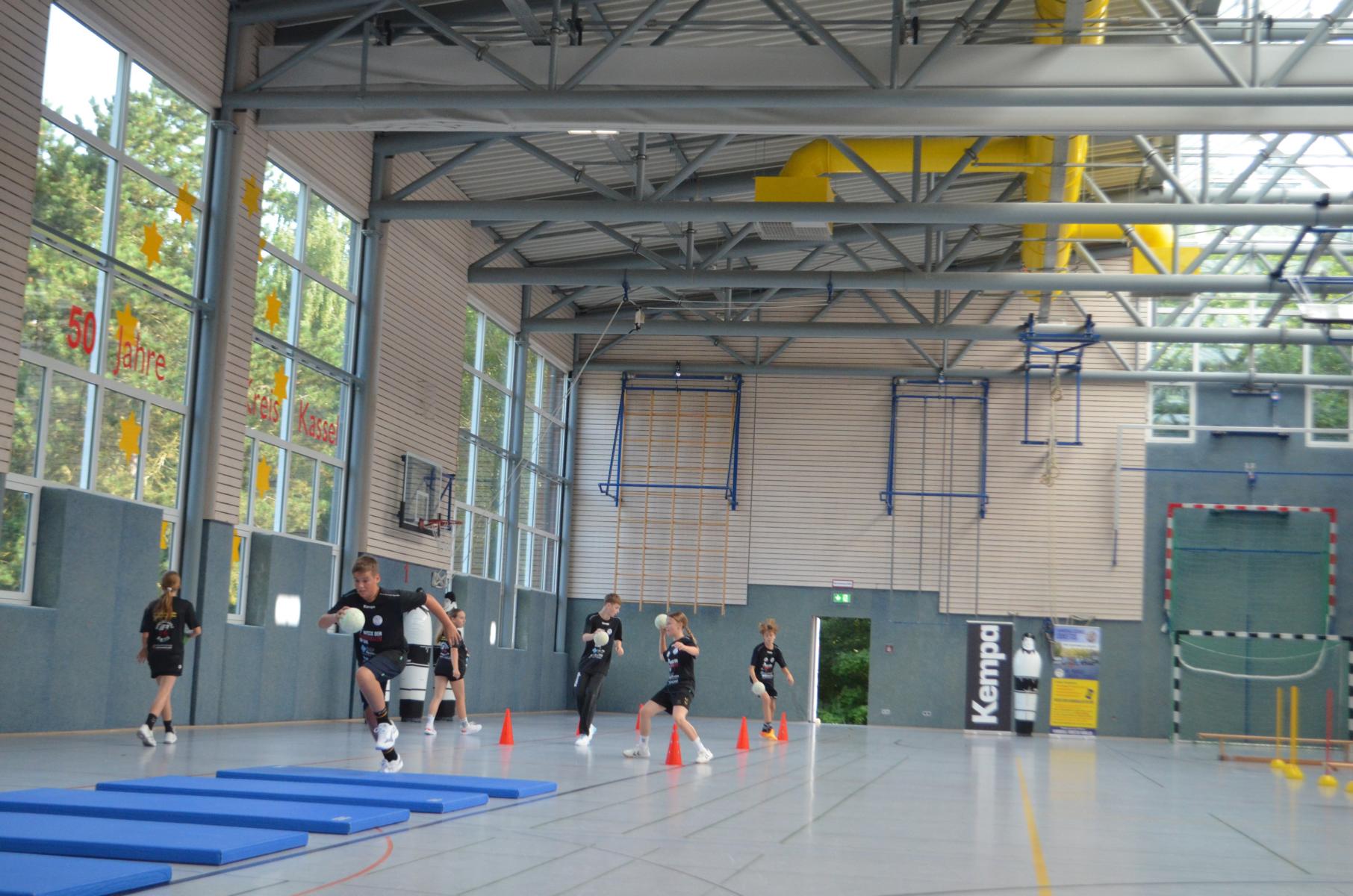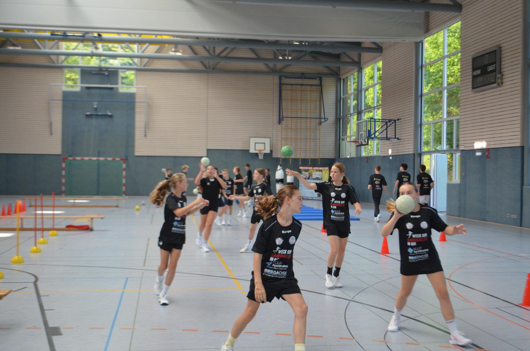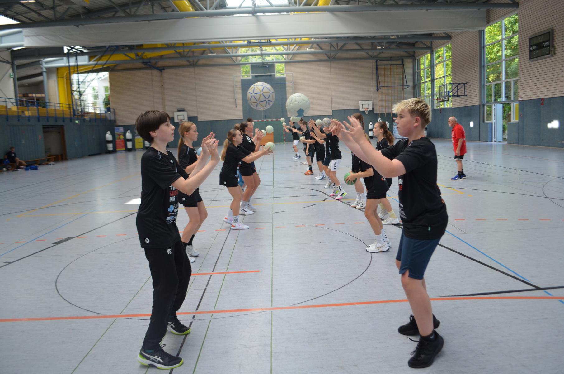 Jetzt steht die letzte Trainingseinheit auf dem Plan. Zum Aufwärmen gibt es Partnerübungen, die nicht nur Arme und Beine, sondern auch Lachmuskeln beanspruchen. Anschließend folgt ein knallharter Handballparcours, der von jedem alles fordert. Spätestens nun merkt man, dass vier Tage voller Training doch ihre Spuren hinterlassen haben. Jetzt geht´s ab zum Fotoshooting. Ich schiebe die Teens von rechts nach links von vorn nach hinten – so lange, bis das Bild perfekt ist. Nun werden die Geräte ordentlich in die Rollwagen gepackt und die AirBuddies sind so glücklich, dass die Luft rausgelassen wird und sie sich ausruhen dürfen. Sie wurden in den letzten Tagen sehr beansprucht, angerempelt und sogar umgestoßen. Davon müssen sie sich bis zum Herbstcamp erst einmal erholen. Zur Belohnung für das schnelle Abbauen und Aufräumen der Geräte gibt es jetzt – Trommelwirbel – das große Abschlussturnier! Die Tribüne ist voll, die Stimmung großartig, und jeder hat nur ein Ziel: zeigen, was man gelernt hat. Es wird gekämpft, gepasst, geworfen und gejubelt. Die Teens hauen großartige Spielzüge raus, als hätten sie heimlich nachts noch extra dafür trainiert.