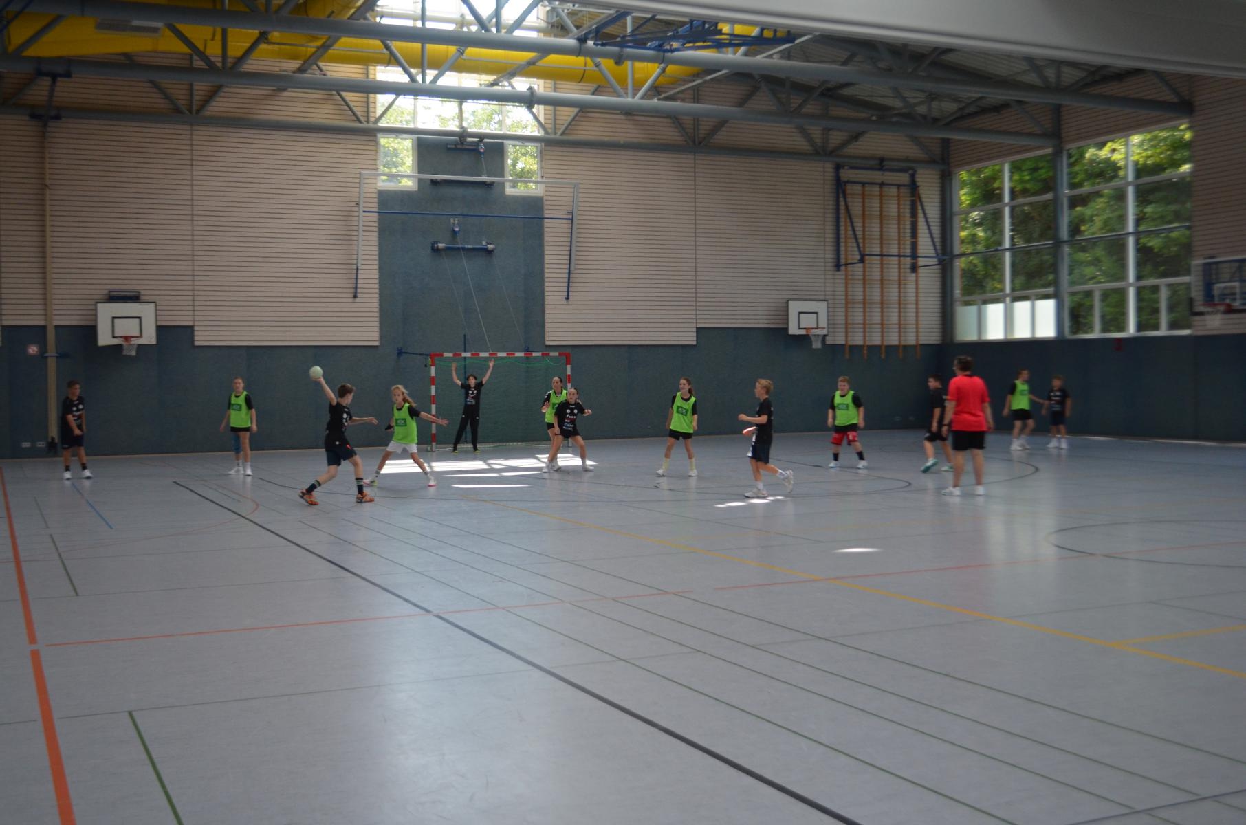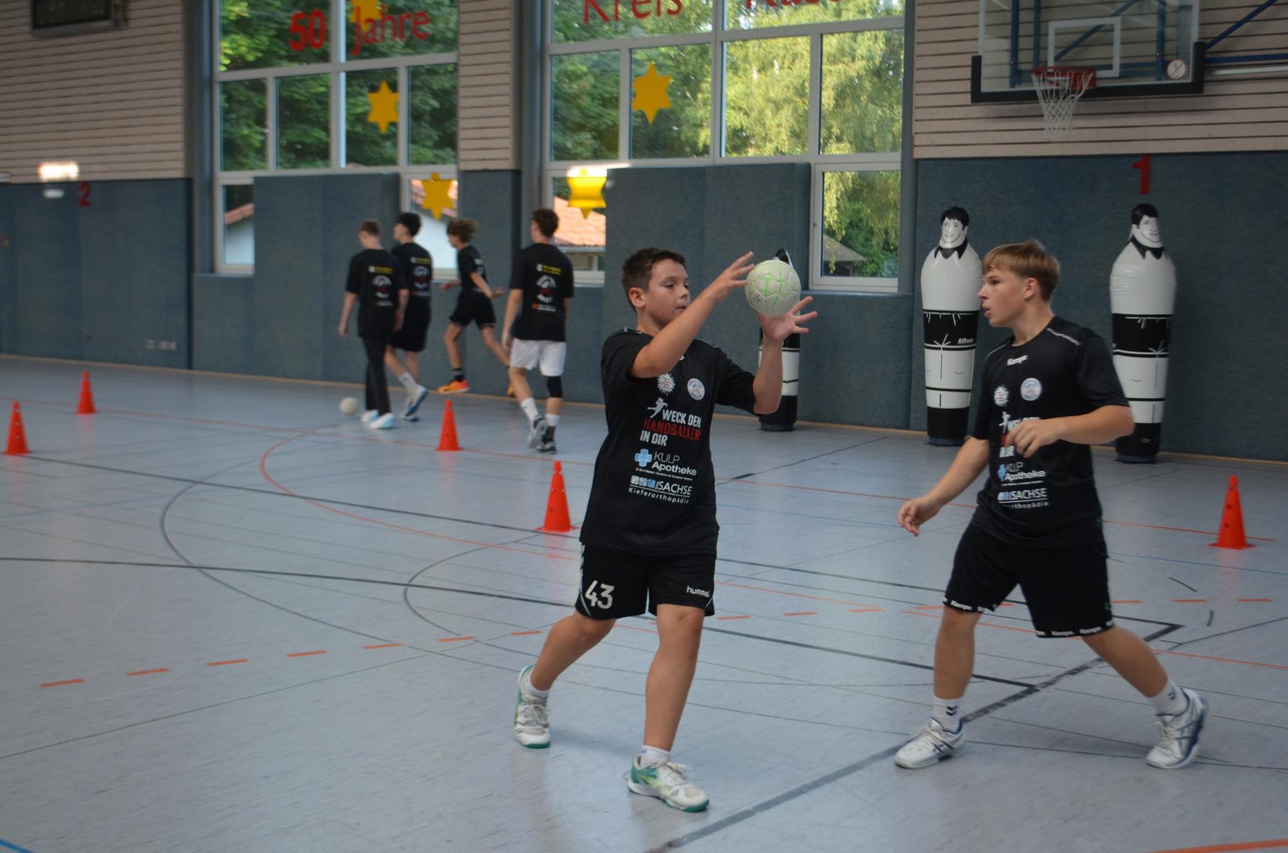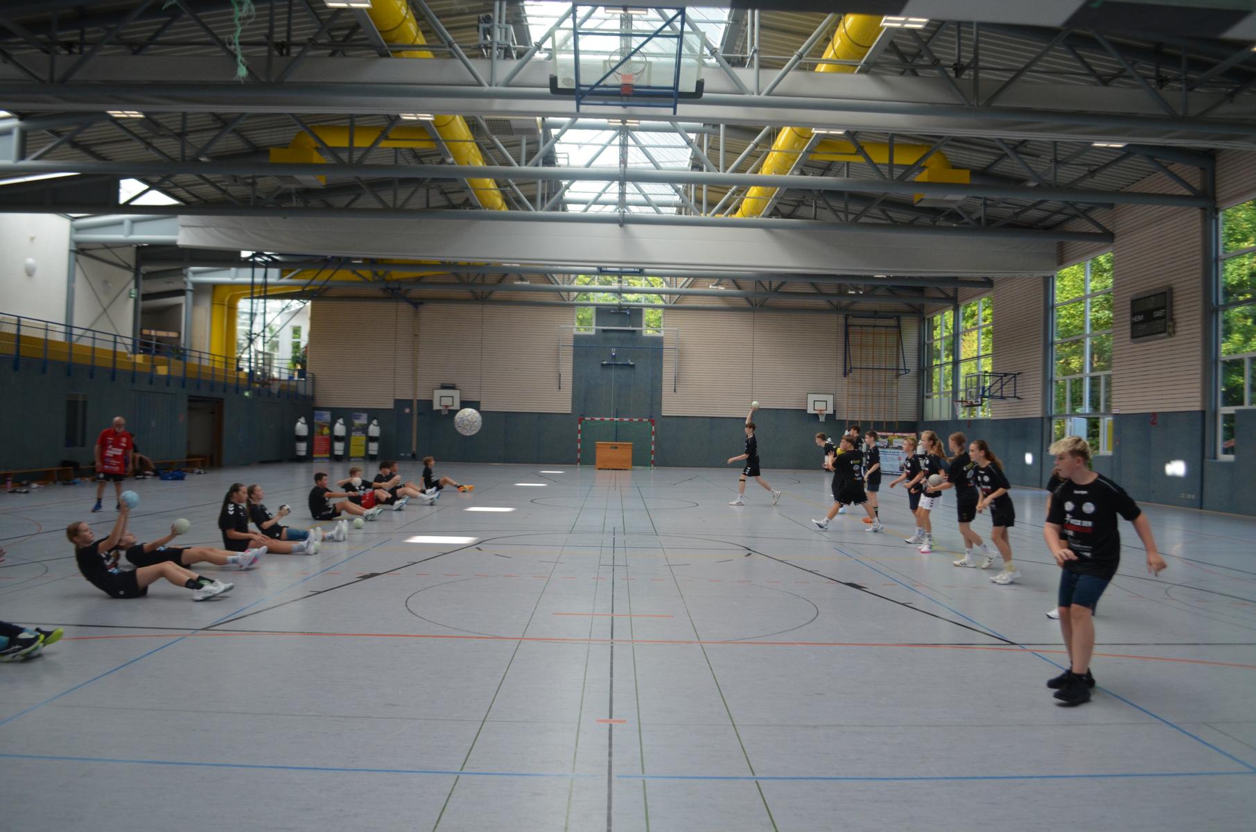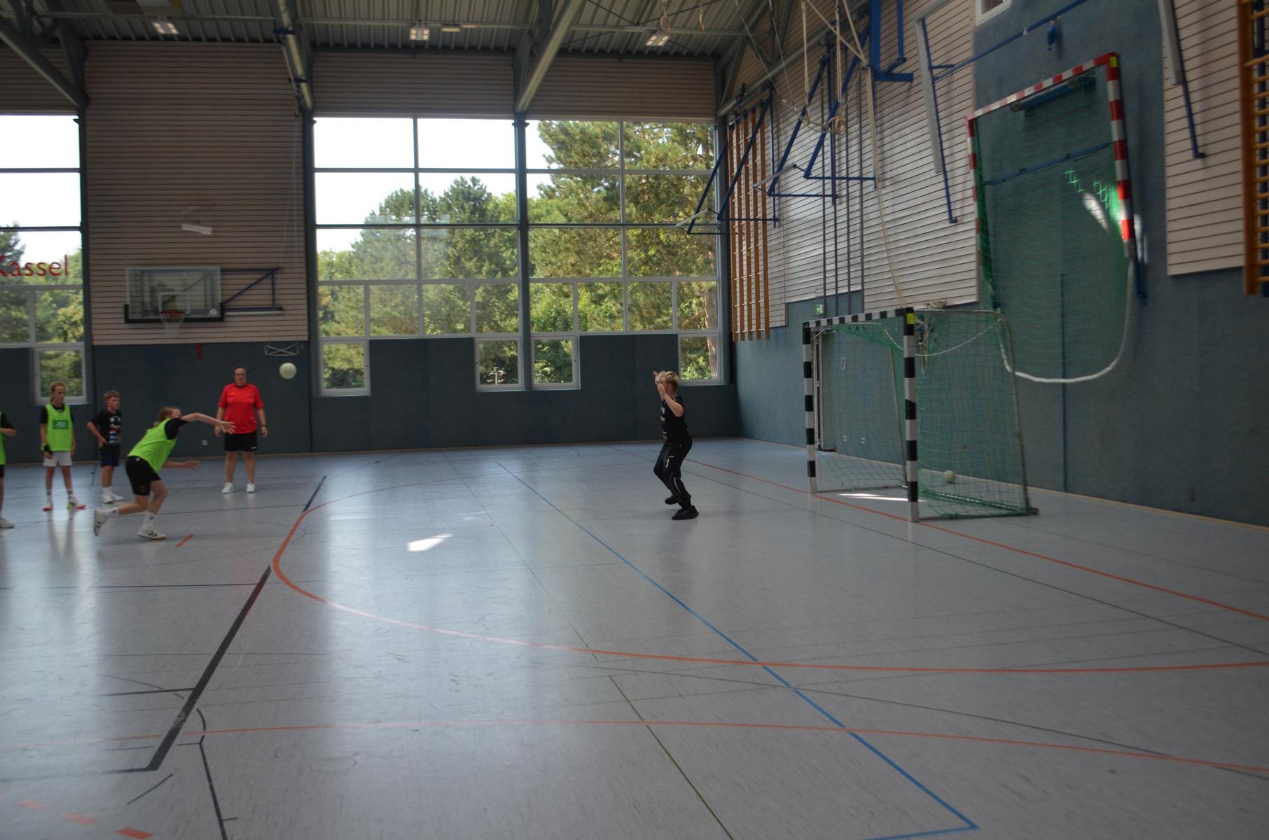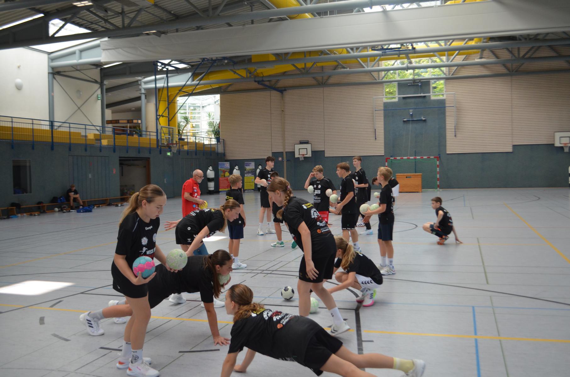 Jetzt steht die letzte Trainingseinheit auf dem Plan. Zum Aufwärmen gibt es Partnerübungen, die nicht nur Arme und Beine, sondern auch Lachmuskeln beanspruchen. Anschließend folgt ein knallharter Handballparcours, der von jedem alles fordert. Spätestens nun merkt man, dass vier Tage voller Training doch ihre Spuren hinterlassen haben. Jetzt geht´s ab zum Fotoshooting. Ich schiebe die Teens von rechts nach links von vorn nach hinten – so lange, bis das Bild perfekt ist. Nun werden die Geräte ordentlich in die Rollwagen gepackt und die AirBuddies sind so glücklich, dass die Luft rausgelassen wird und sie sich ausruhen dürfen. Sie wurden in den letzten Tagen sehr beansprucht, angerempelt und sogar umgestoßen. Davon müssen sie sich bis zum Herbstcamp erst einmal erholen. Zur Belohnung für das schnelle Abbauen und Aufräumen der Geräte gibt es jetzt – Trommelwirbel – das große Abschlussturnier! Die Tribüne ist voll, die Stimmung großartig, und jeder hat nur ein Ziel: zeigen, was man gelernt hat. Es wird gekämpft, gepasst, geworfen und gejubelt. Die Teens hauen großartige Spielzüge raus, als hätten sie heimlich nachts noch extra dafür trainiert.
