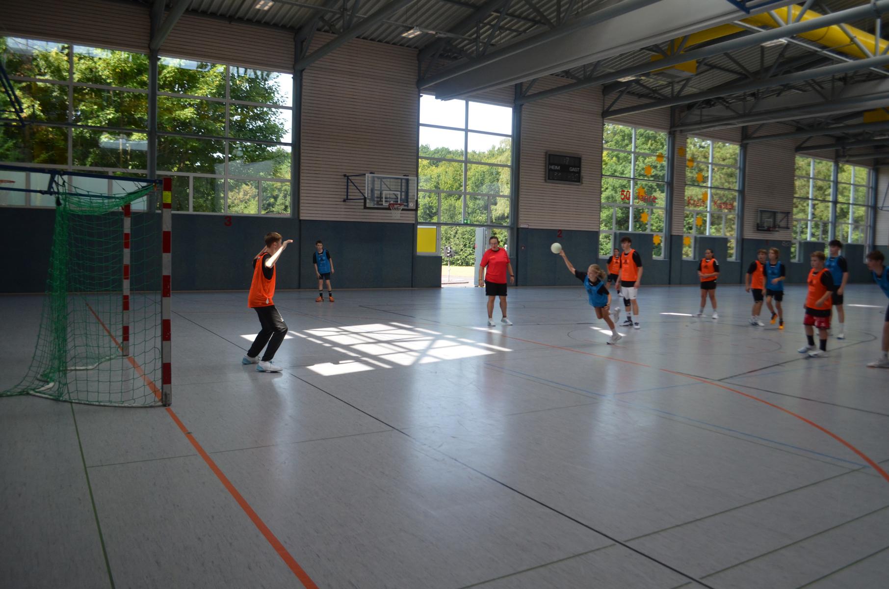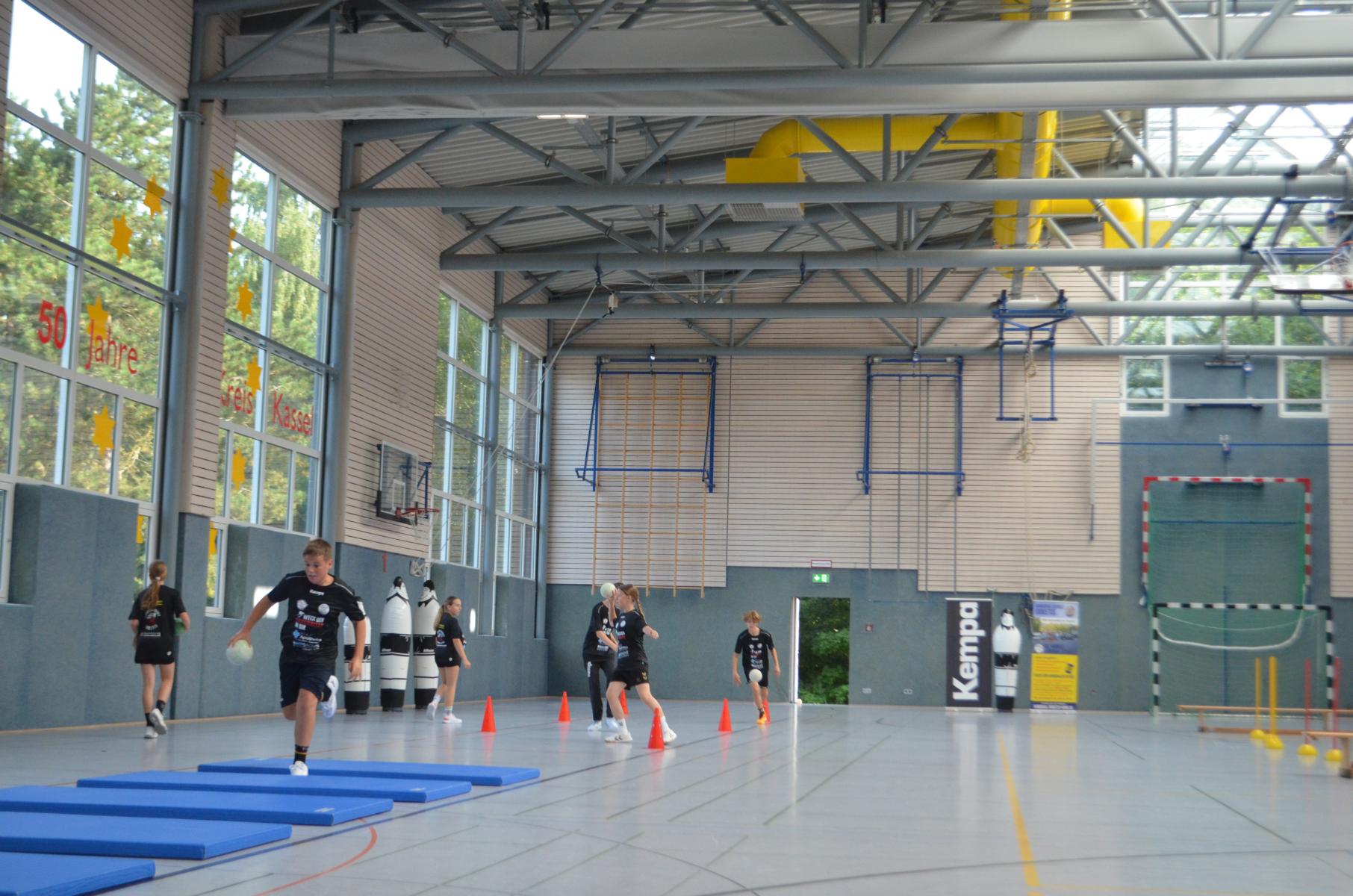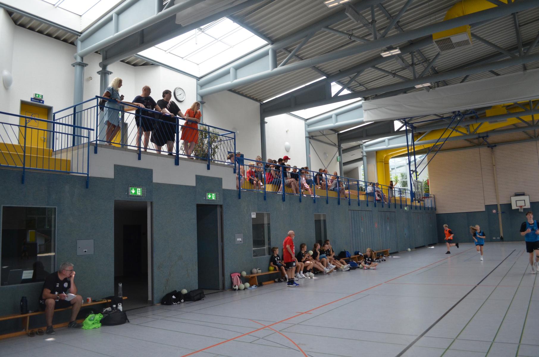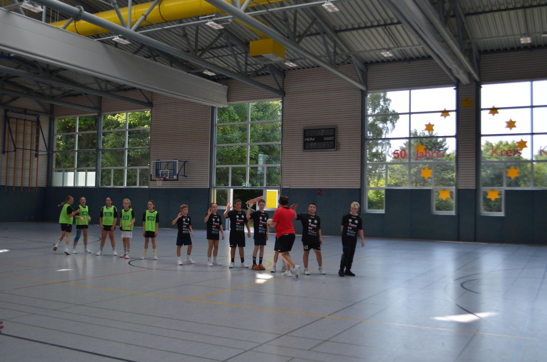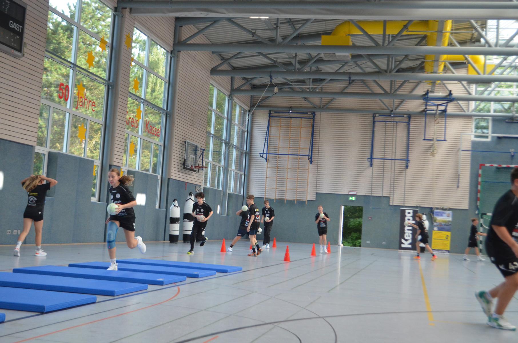 Jetzt steht die letzte Trainingseinheit auf dem Plan. Zum Aufwärmen gibt es Partnerübungen, die nicht nur Arme und Beine, sondern auch Lachmuskeln beanspruchen. Anschließend folgt ein knallharter Handballparcours, der von jedem alles fordert. Spätestens nun merkt man, dass vier Tage voller Training doch ihre Spuren hinterlassen haben. Jetzt geht´s ab zum Fotoshooting. Ich schiebe die Teens von rechts nach links von vorn nach hinten – so lange, bis das Bild perfekt ist. Nun werden die Geräte ordentlich in die Rollwagen gepackt und die AirBuddies sind so glücklich, dass die Luft rausgelassen wird und sie sich ausruhen dürfen. Sie wurden in den letzten Tagen sehr beansprucht, angerempelt und sogar umgestoßen. Davon müssen sie sich bis zum Herbstcamp erst einmal erholen. Zur Belohnung für das schnelle Abbauen und Aufräumen der Geräte gibt es jetzt – Trommelwirbel – das große Abschlussturnier! Die Tribüne ist voll, die Stimmung großartig, und jeder hat nur ein Ziel: zeigen, was man gelernt hat. Es wird gekämpft, gepasst, geworfen und gejubelt. Die Teens hauen großartige Spielzüge raus, als hätten sie heimlich nachts noch extra dafür trainiert.
