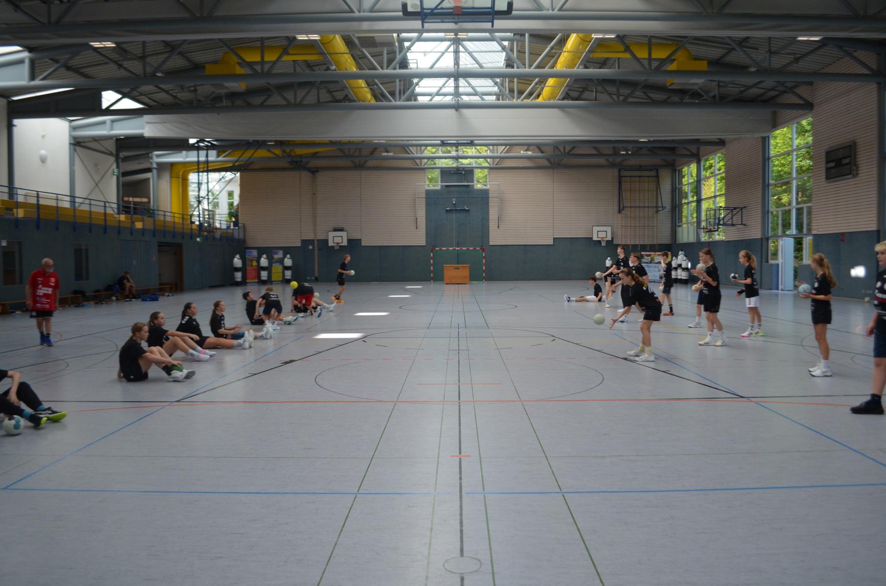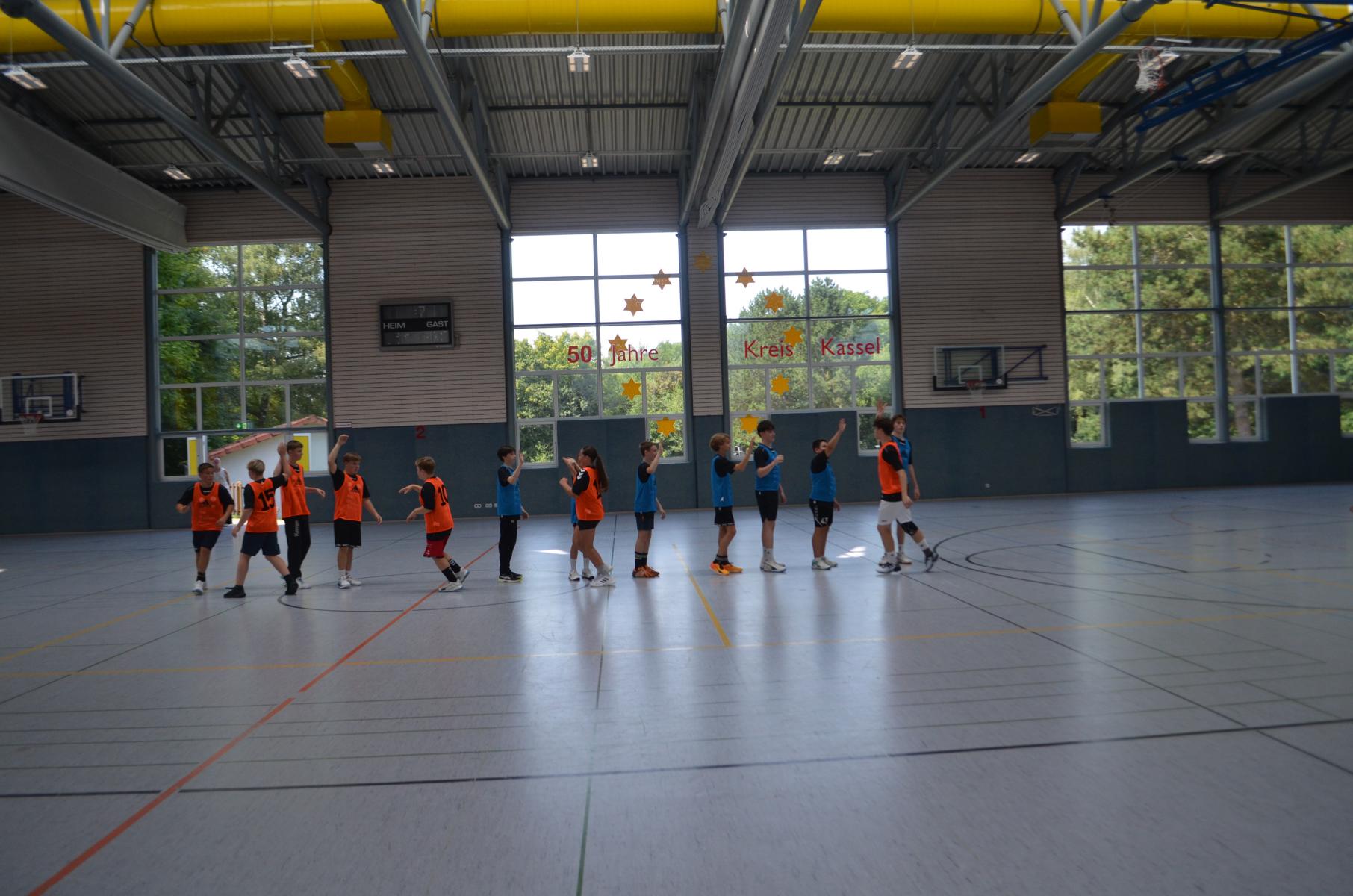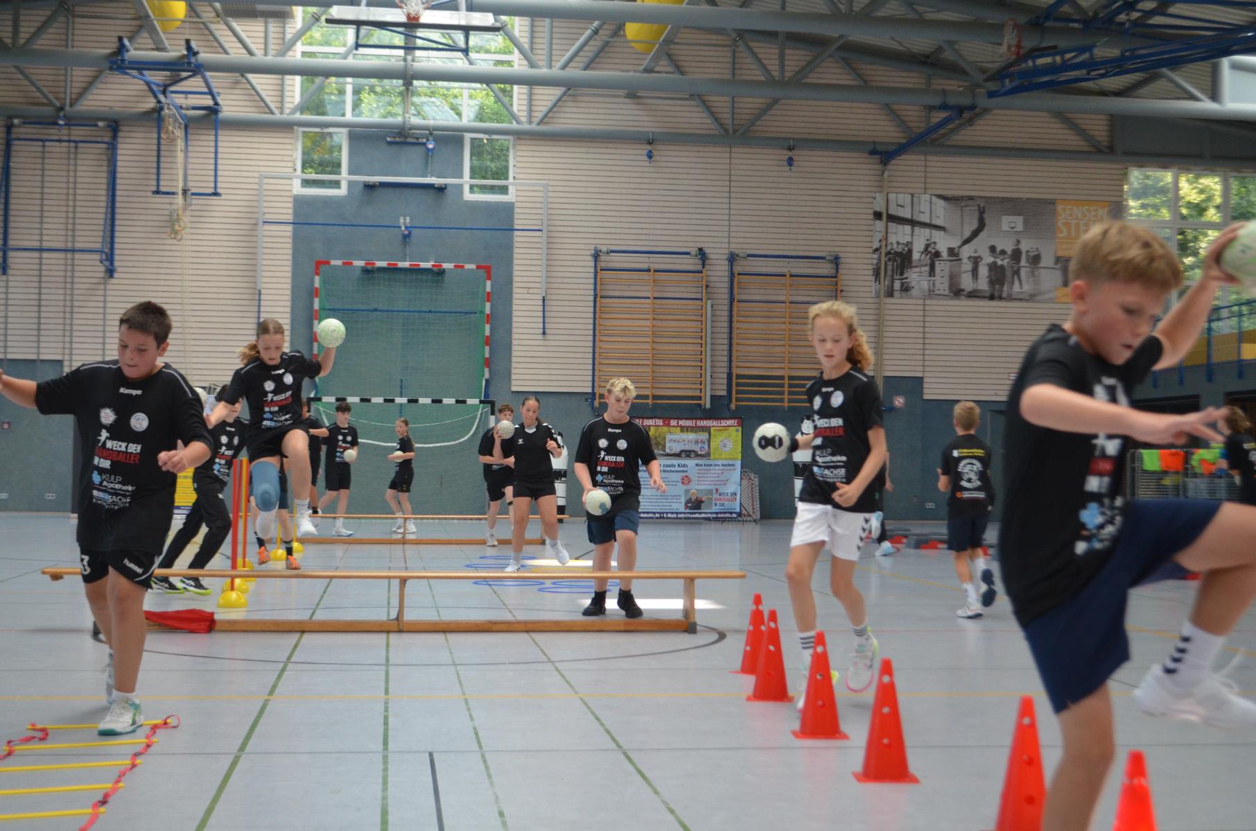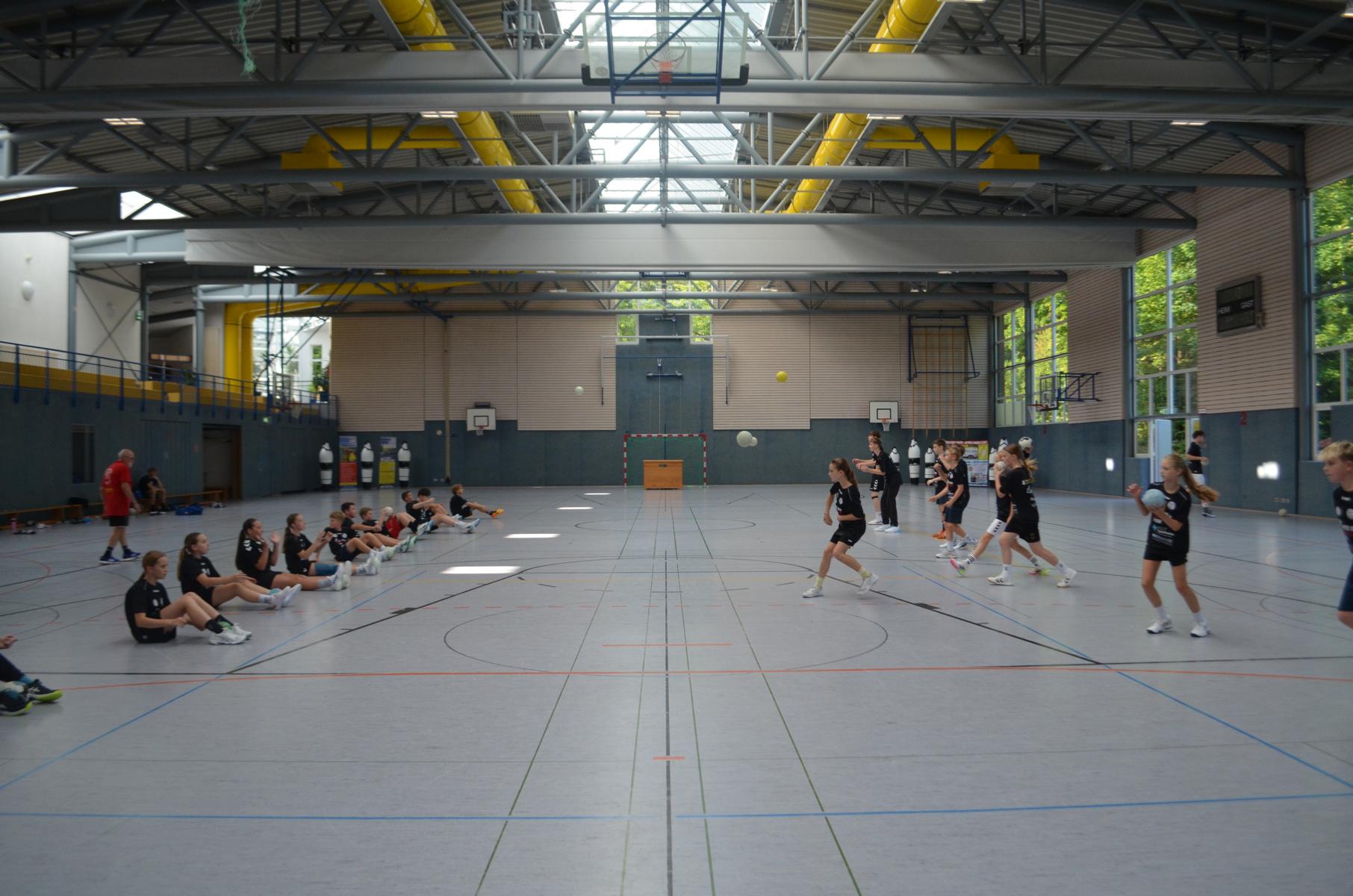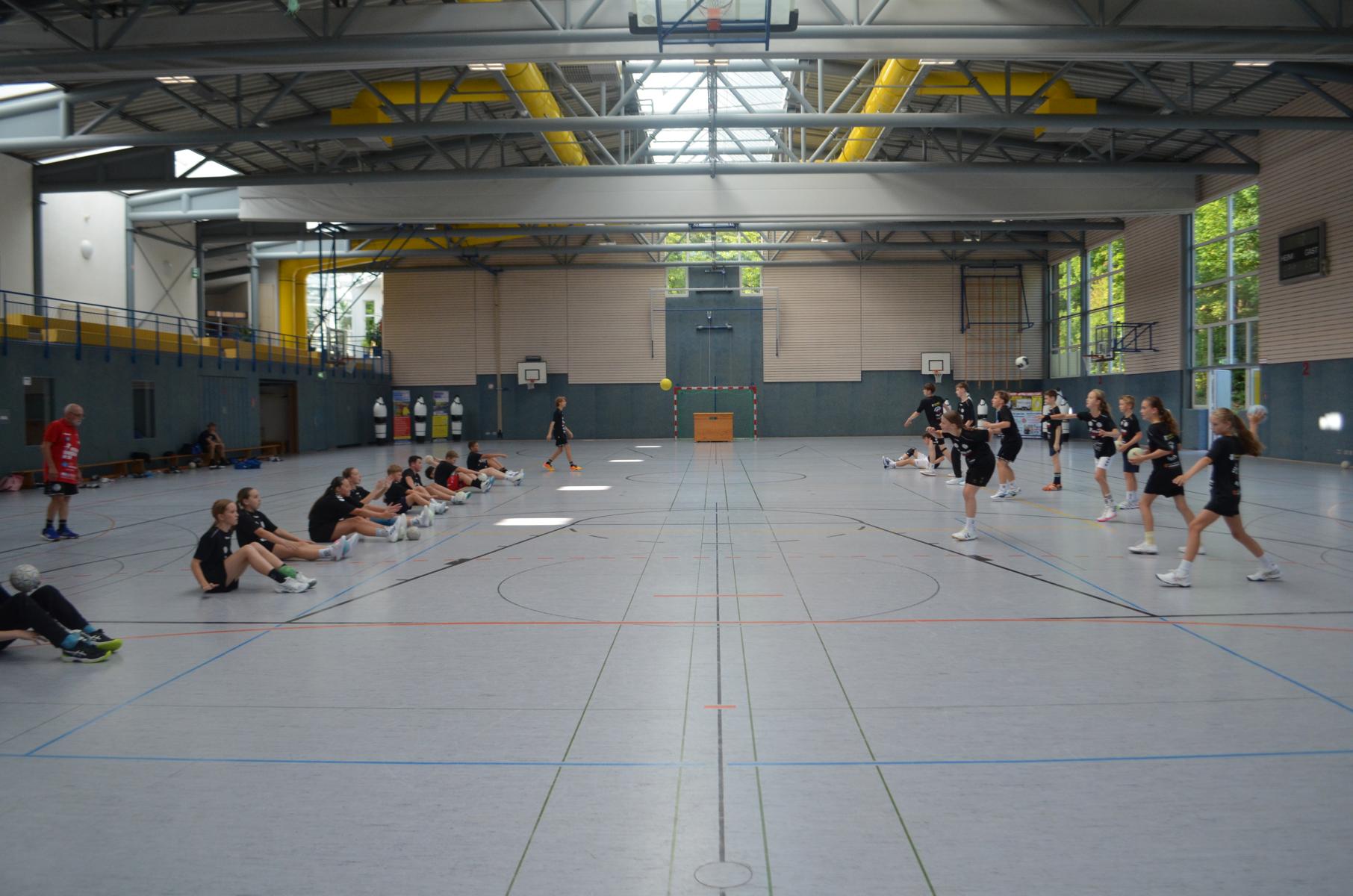 Jetzt steht die letzte Trainingseinheit auf dem Plan. Zum Aufwärmen gibt es Partnerübungen, die nicht nur Arme und Beine, sondern auch Lachmuskeln beanspruchen. Anschließend folgt ein knallharter Handballparcours, der von jedem alles fordert. Spätestens nun merkt man, dass vier Tage voller Training doch ihre Spuren hinterlassen haben. Jetzt geht´s ab zum Fotoshooting. Ich schiebe die Teens von rechts nach links von vorn nach hinten – so lange, bis das Bild perfekt ist. Nun werden die Geräte ordentlich in die Rollwagen gepackt und die AirBuddies sind so glücklich, dass die Luft rausgelassen wird und sie sich ausruhen dürfen. Sie wurden in den letzten Tagen sehr beansprucht, angerempelt und sogar umgestoßen. Davon müssen sie sich bis zum Herbstcamp erst einmal erholen. Zur Belohnung für das schnelle Abbauen und Aufräumen der Geräte gibt es jetzt – Trommelwirbel – das große Abschlussturnier! Die Tribüne ist voll, die Stimmung großartig, und jeder hat nur ein Ziel: zeigen, was man gelernt hat. Es wird gekämpft, gepasst, geworfen und gejubelt. Die Teens hauen großartige Spielzüge raus, als hätten sie heimlich nachts noch extra dafür trainiert.