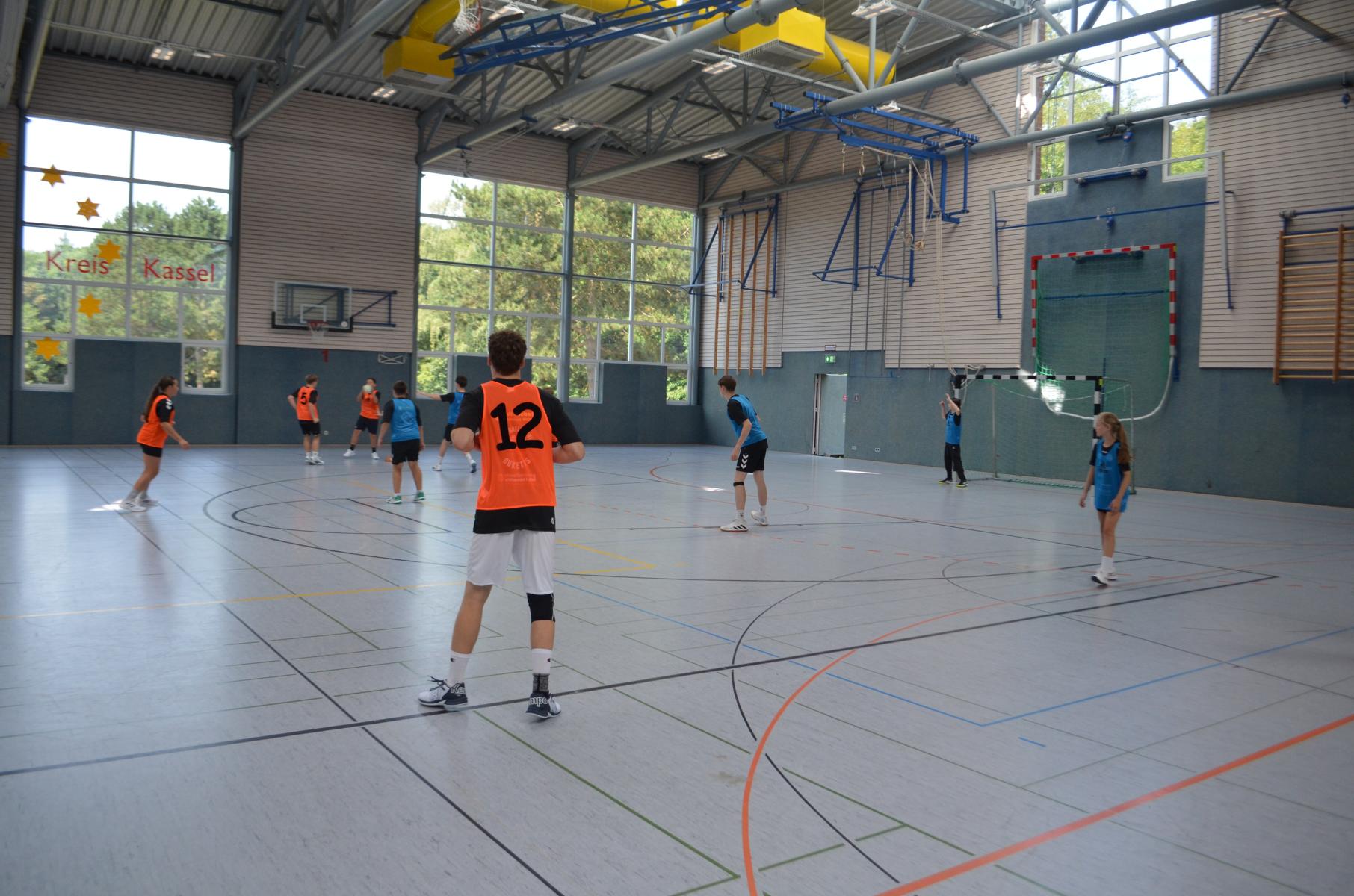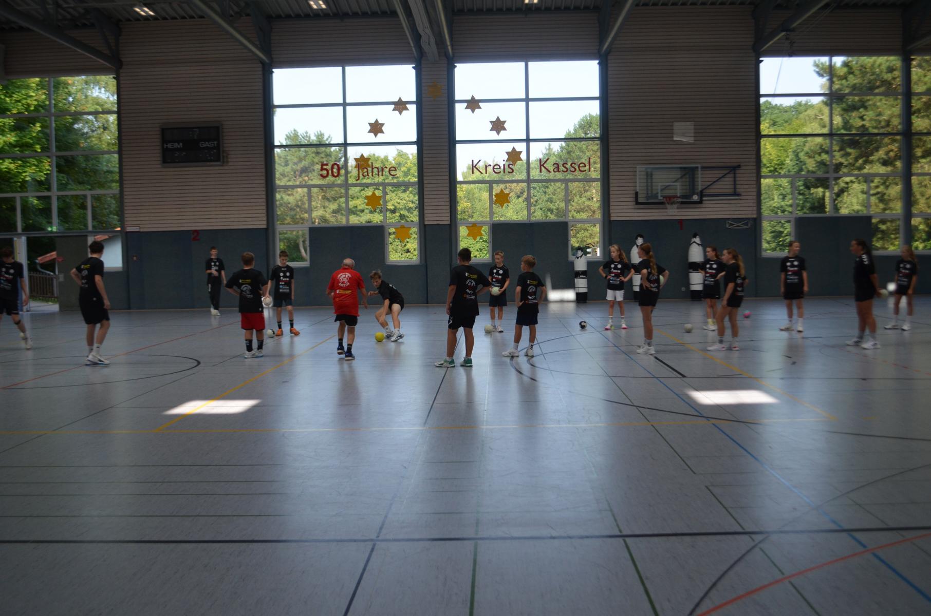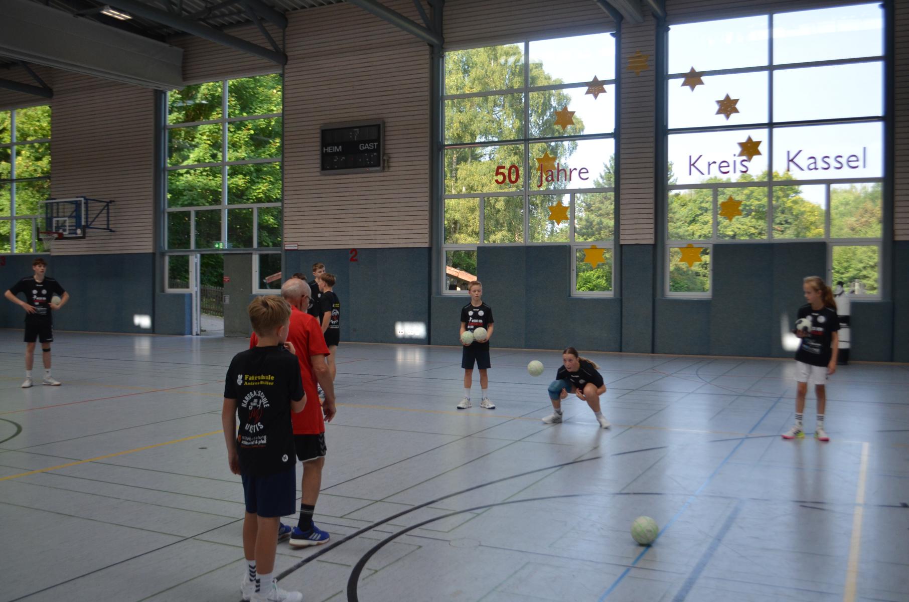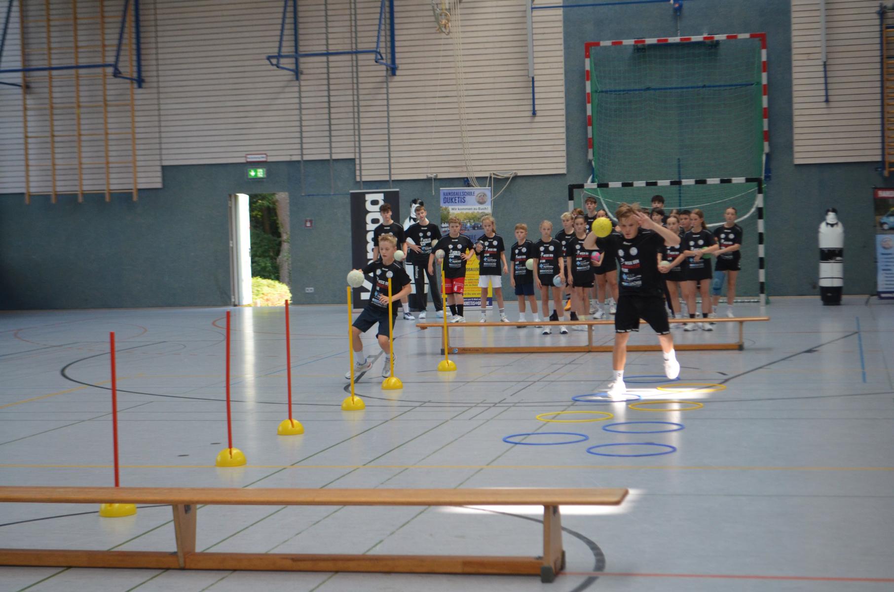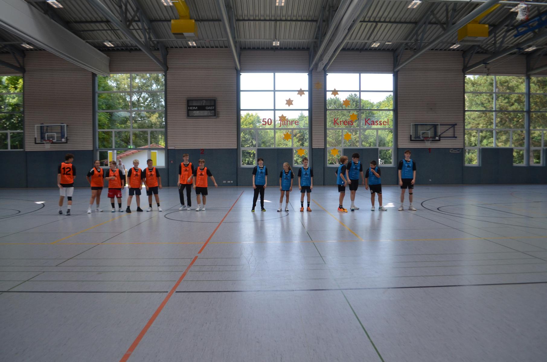 Jetzt steht die letzte Trainingseinheit auf dem Plan. Zum Aufwärmen gibt es Partnerübungen, die nicht nur Arme und Beine, sondern auch Lachmuskeln beanspruchen. Anschließend folgt ein knallharter Handballparcours, der von jedem alles fordert. Spätestens nun merkt man, dass vier Tage voller Training doch ihre Spuren hinterlassen haben. Jetzt geht´s ab zum Fotoshooting. Ich schiebe die Teens von rechts nach links von vorn nach hinten – so lange, bis das Bild perfekt ist. Nun werden die Geräte ordentlich in die Rollwagen gepackt und die AirBuddies sind so glücklich, dass die Luft rausgelassen wird und sie sich ausruhen dürfen. Sie wurden in den letzten Tagen sehr beansprucht, angerempelt und sogar umgestoßen. Davon müssen sie sich bis zum Herbstcamp erst einmal erholen. Zur Belohnung für das schnelle Abbauen und Aufräumen der Geräte gibt es jetzt – Trommelwirbel – das große Abschlussturnier! Die Tribüne ist voll, die Stimmung großartig, und jeder hat nur ein Ziel: zeigen, was man gelernt hat. Es wird gekämpft, gepasst, geworfen und gejubelt. Die Teens hauen großartige Spielzüge raus, als hätten sie heimlich nachts noch extra dafür trainiert.