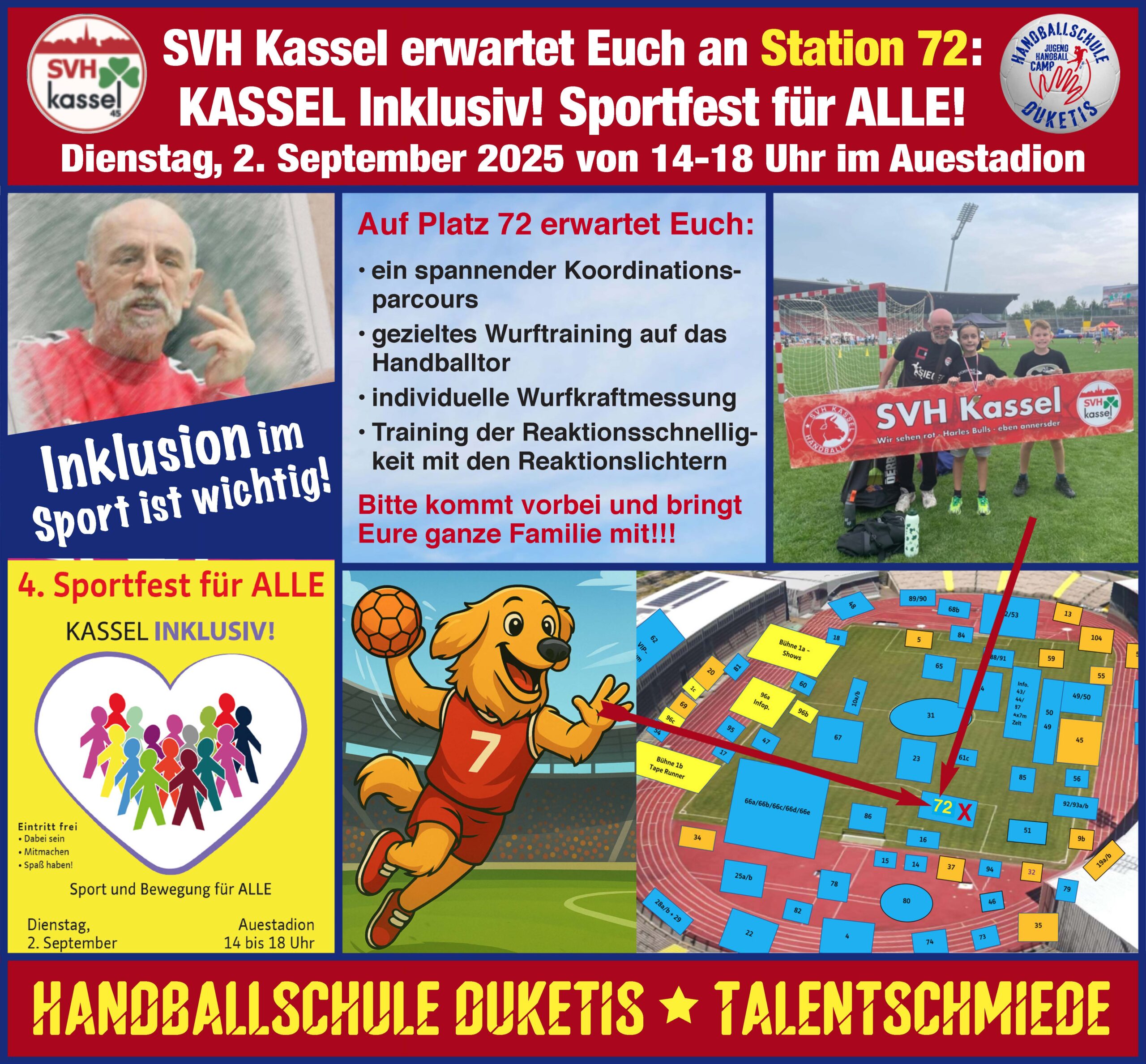 Dienstag, 02. September 2025: 4. Sportfest für ALLE – KASSEL INKLUSIV! in der Zeit von 14-18 Uhr im Innenbereich des Kasseler Auestadions statt. Zum öffentlichen Sportfest sind alle Menschen herzlich eingeladen!