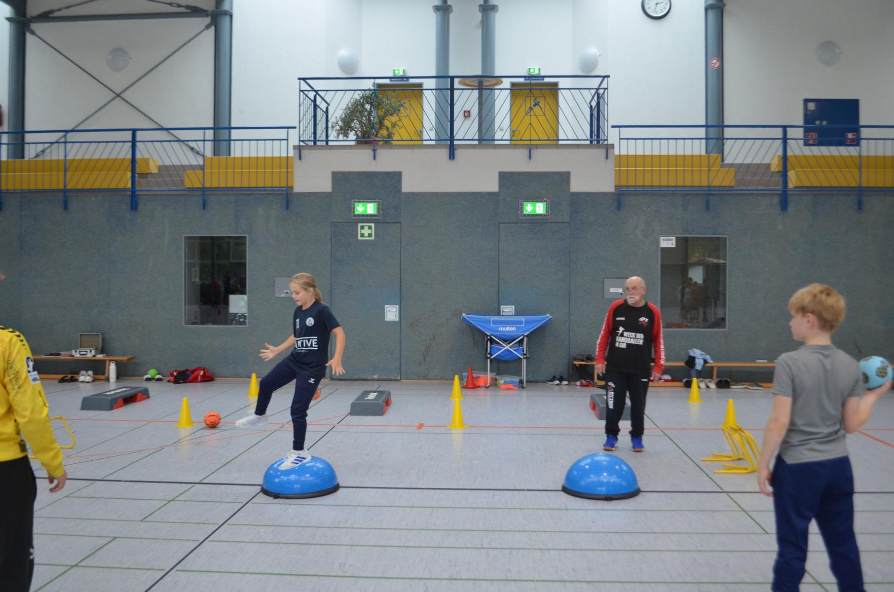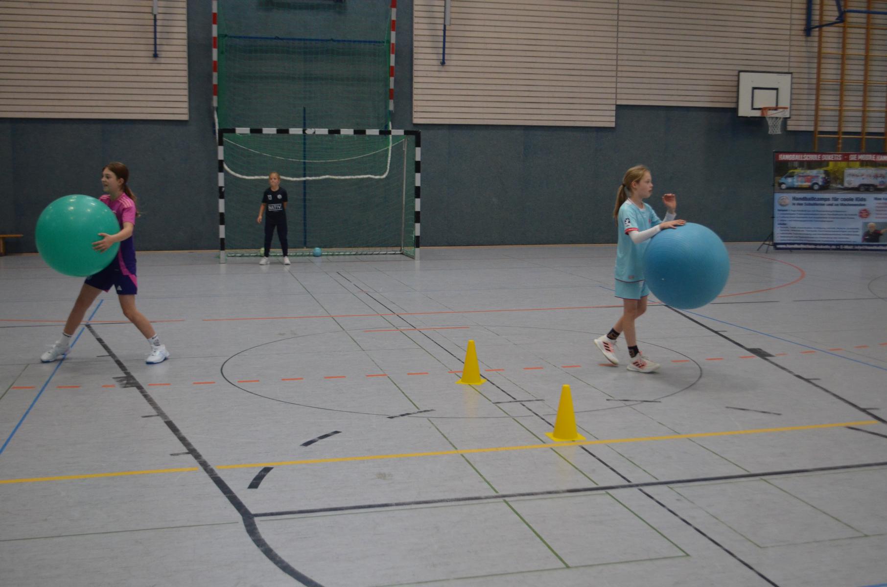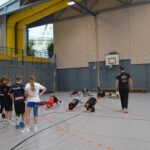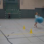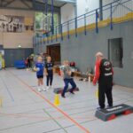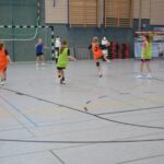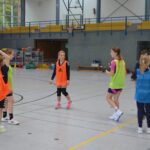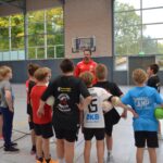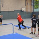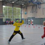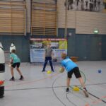 Mit meiner Obelix-Gruppe arbeite ich an der individuellen Technik. Wir trainieren Sprungkraft und achten besonders auf die Landung. Viele springen eher weit als hoch, die Körperspannung fehlt. Auch im Spiel 1 gegen 1 wird die Beinarbeit oft vernachlässigt, was leicht zum Stürmerfoul führt. Die Gruppe gibt sich große Mühe und wartet gespannt auf das erste Lob. Natürlich motiviert Lob, aber mir ist wichtig, dass jeder Schritt sitzt – nur so gelingen Täuschungen und Sprungwürfe mit voller Spannung.