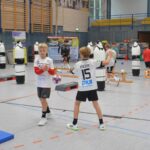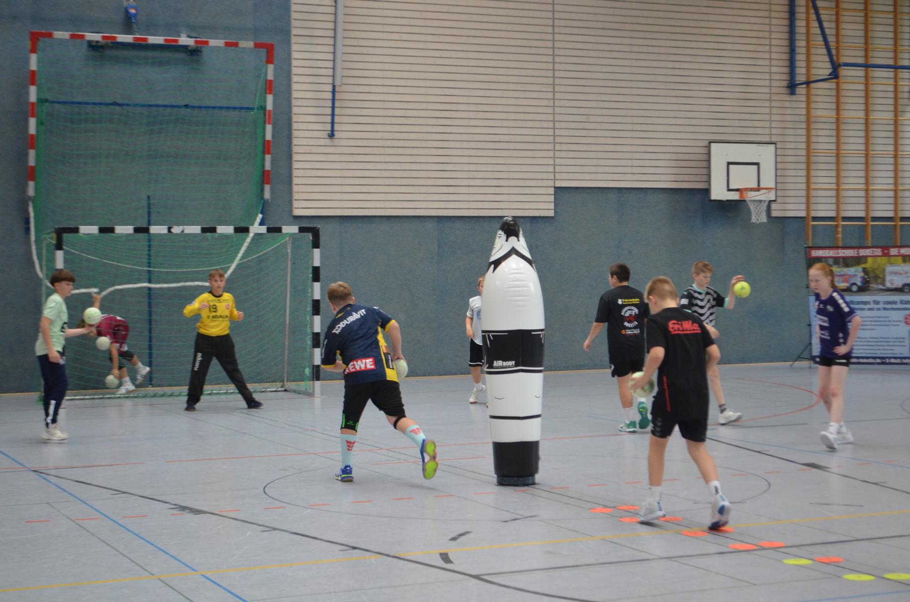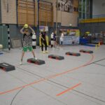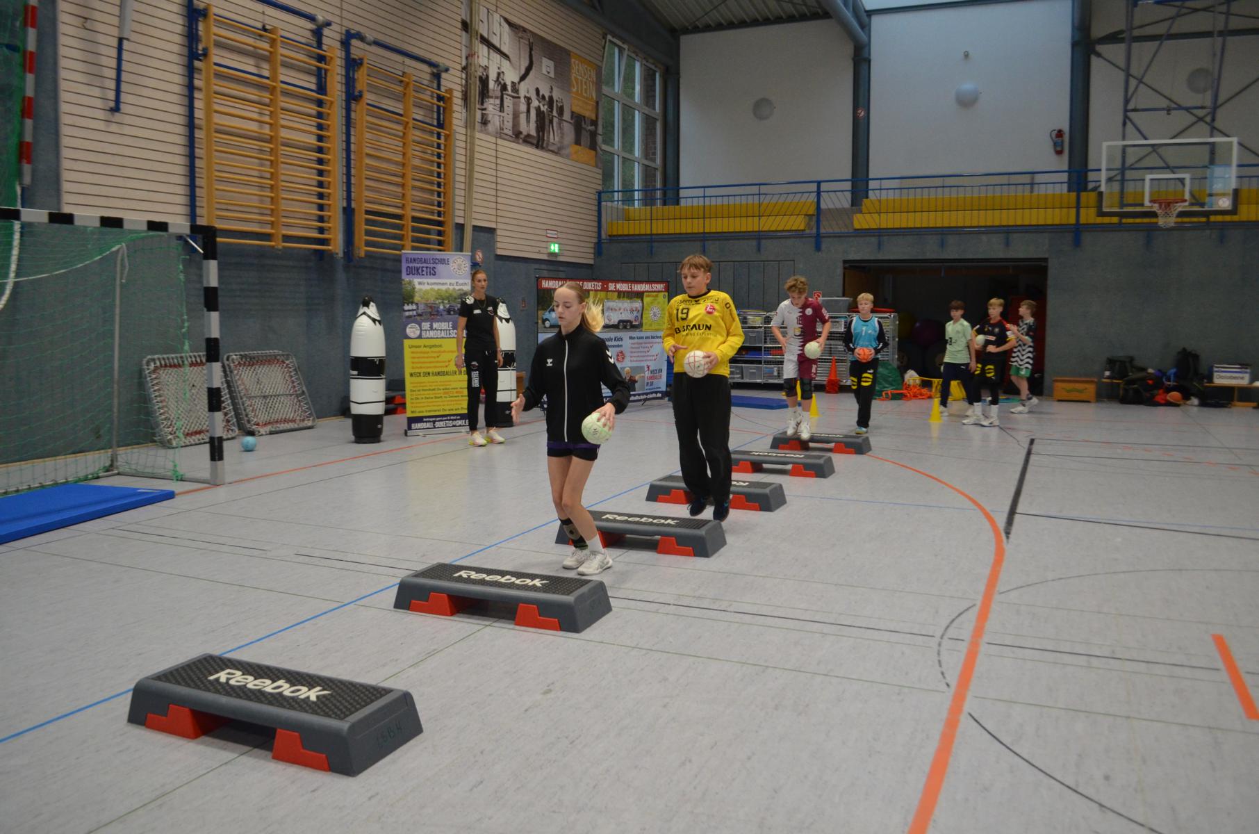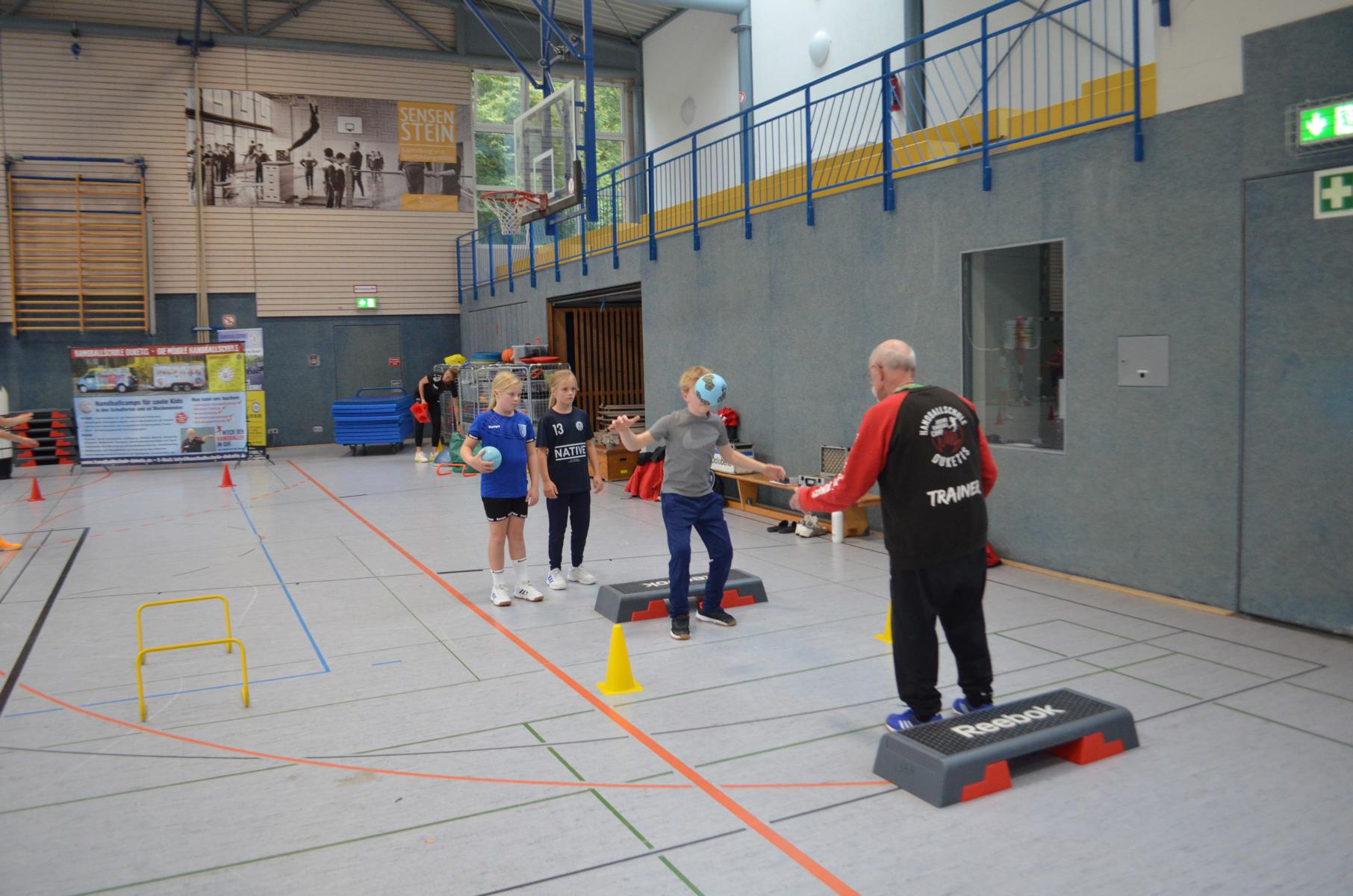 Mit meiner Obelix-Gruppe arbeite ich an der individuellen Technik. Wir trainieren Sprungkraft und achten besonders auf die Landung. Viele springen eher weit als hoch, die Körperspannung fehlt. Auch im Spiel 1 gegen 1 wird die Beinarbeit oft vernachlässigt, was leicht zum Stürmerfoul führt. Die Gruppe gibt sich große Mühe und wartet gespannt auf das erste Lob. Natürlich motiviert Lob, aber mir ist wichtig, dass jeder Schritt sitzt – nur so gelingen Täuschungen und Sprungwürfe mit voller Spannung.
