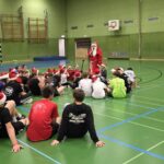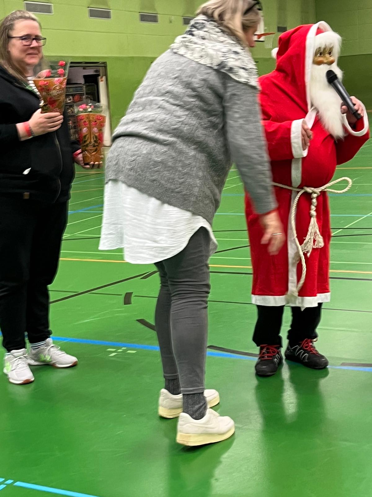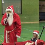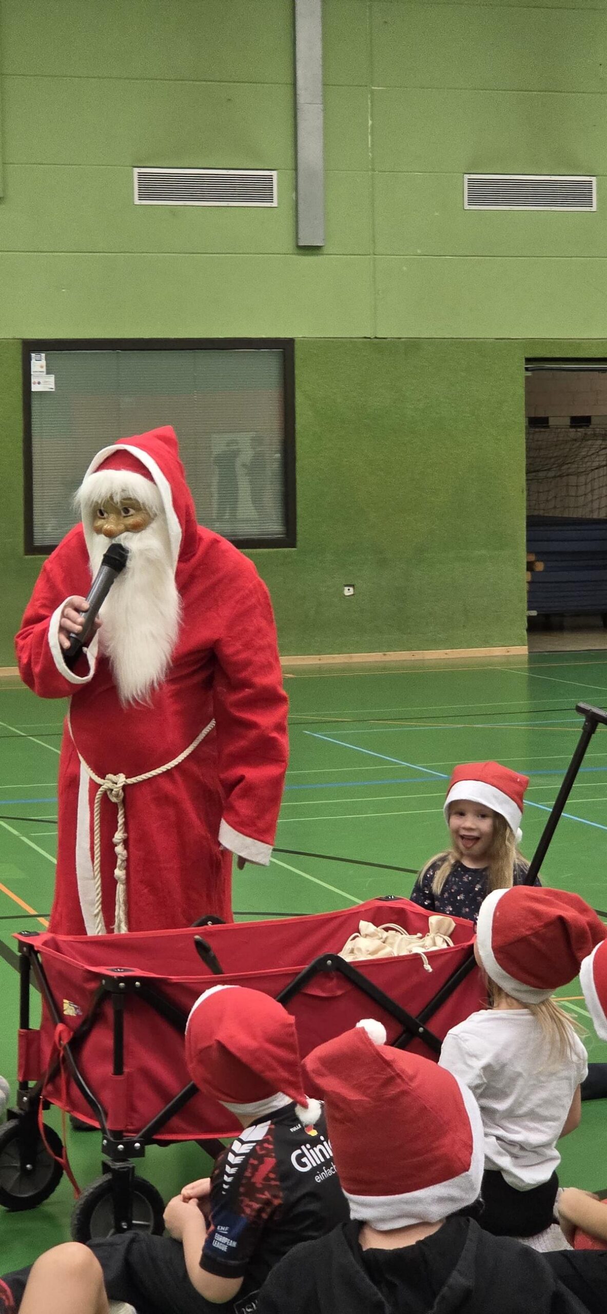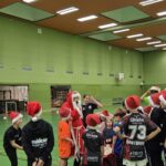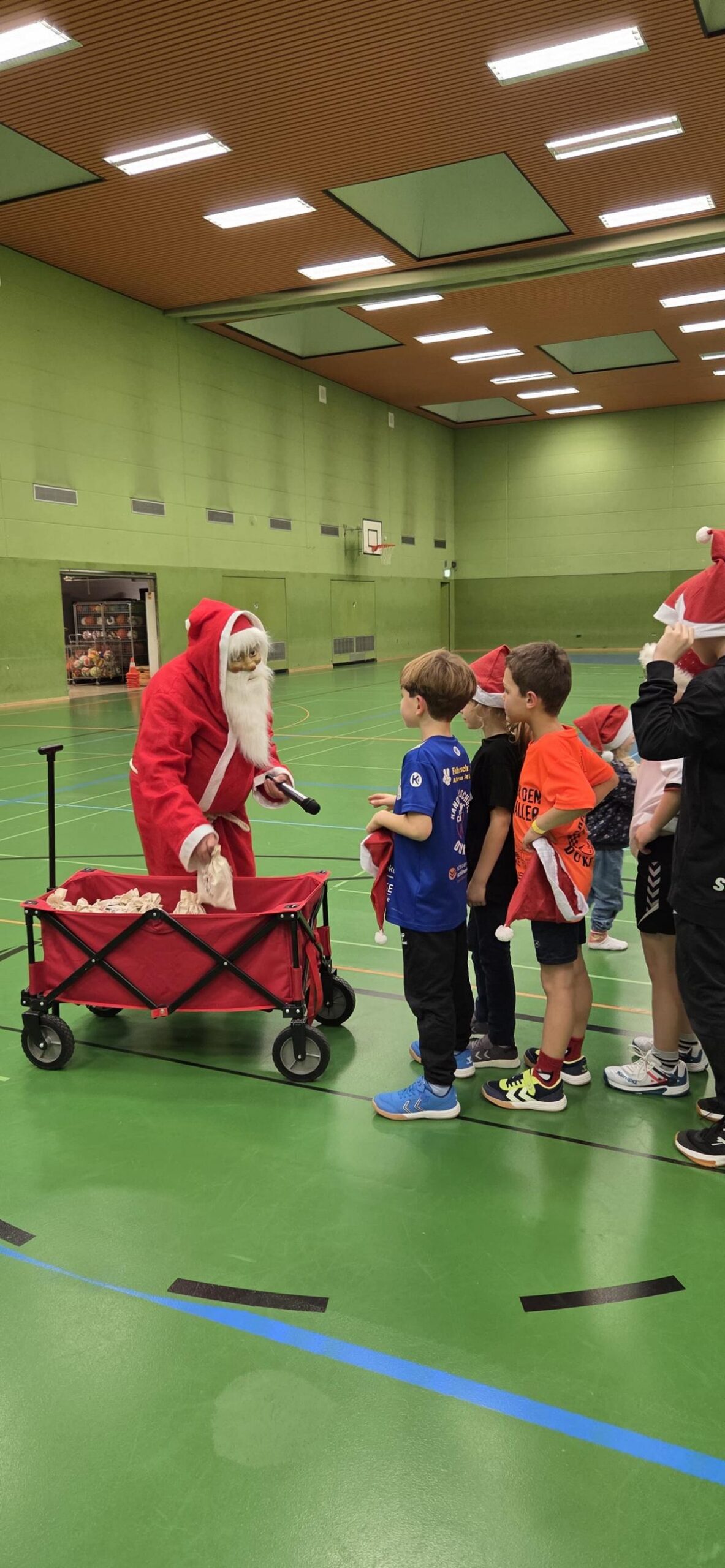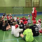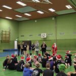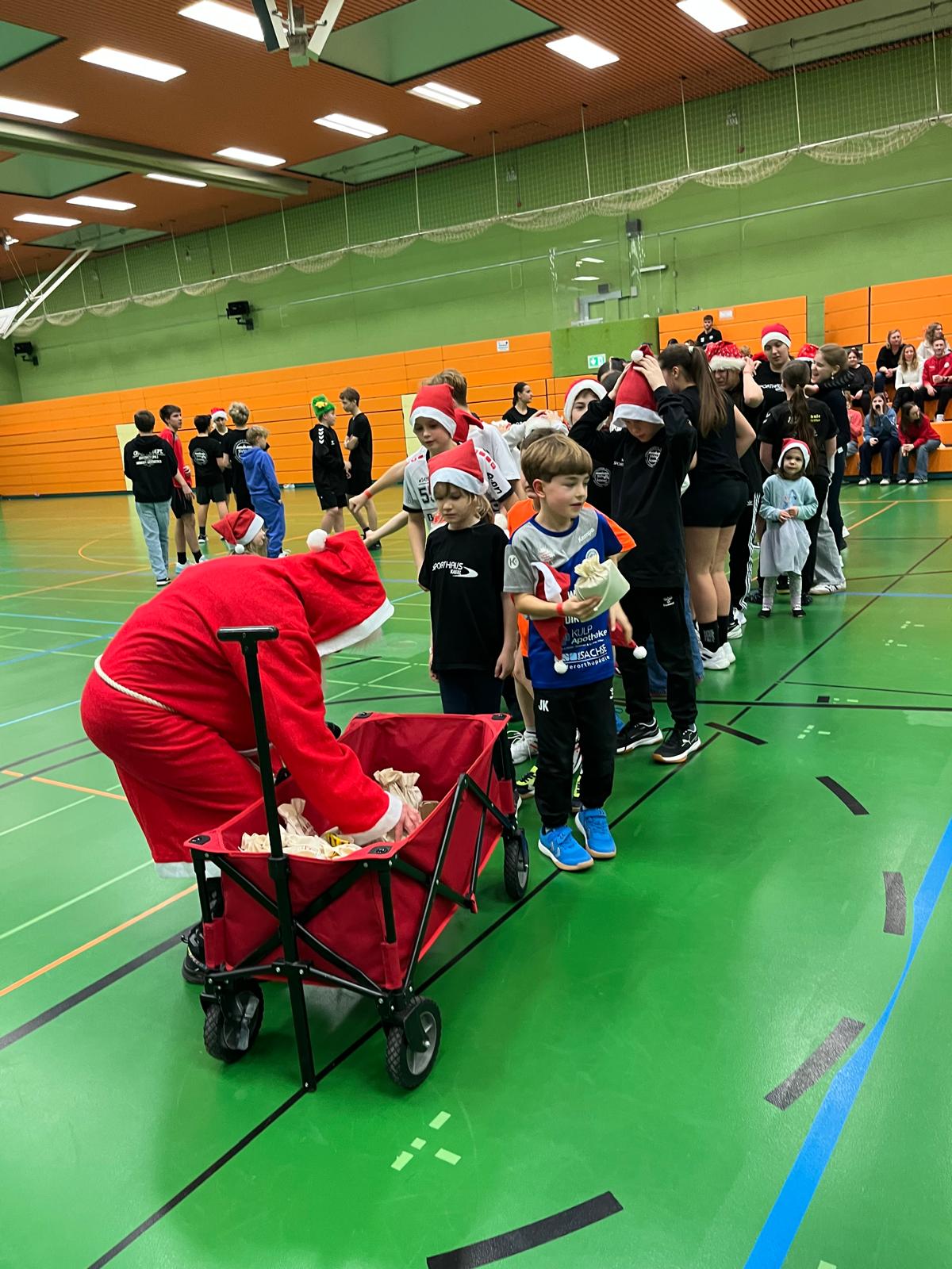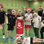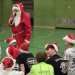 Im Anschluss startete unser Turnier mit Begegnungen zwischen allen Mannschaften – inklusive des heiß erwarteten Duells Kinder gegen Eltern. Zwischendurch wurde im Foyer fleißig gegessen, um neue Kräfte zu sammeln. Und dann – plötzlich – Klingeln an der Tür. Der Weihnachtsmann!
