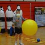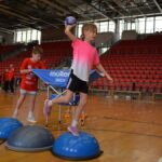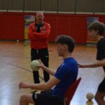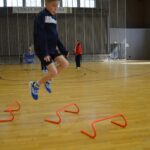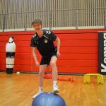 Heute geht’s erstmal ordentlich in den Parcours. Koordinationsleiter mit Schrittfolgen, bei denen man sich fragt, ob man noch zwei funktionsfähige Füße hat. Dann Sprungfolgen – hoch, runter, seitlich – und natürlich Täuschübungen auf der Wurfseite und gegen die Wurfhandseite. Abschluss gegen den Rebounder. Extreme, dynamische Bewegungen! Also genau das, wo man merkt: „Ah, jetzt lebt der Körper… leider überall gleichzeitig.“